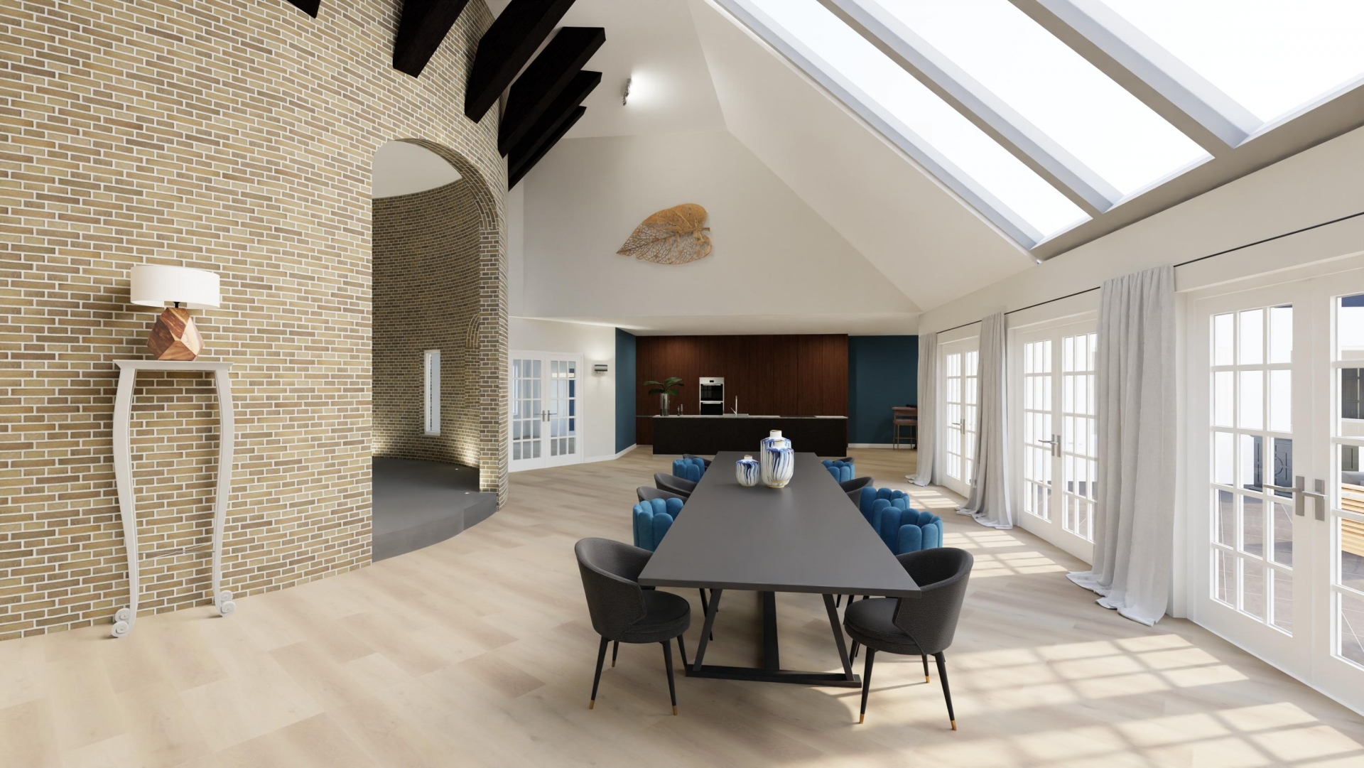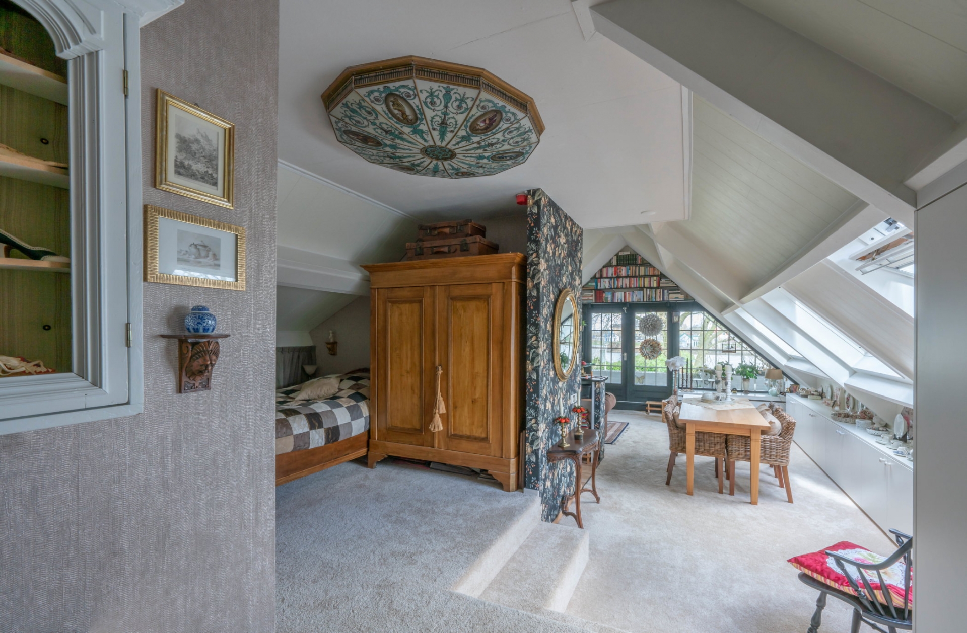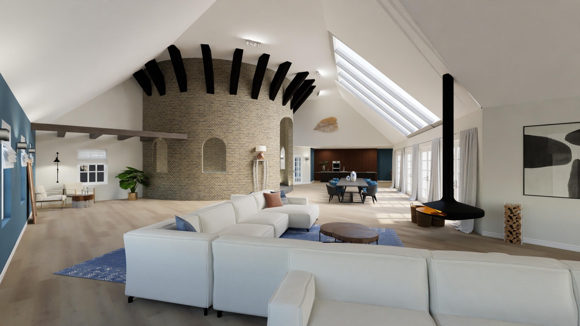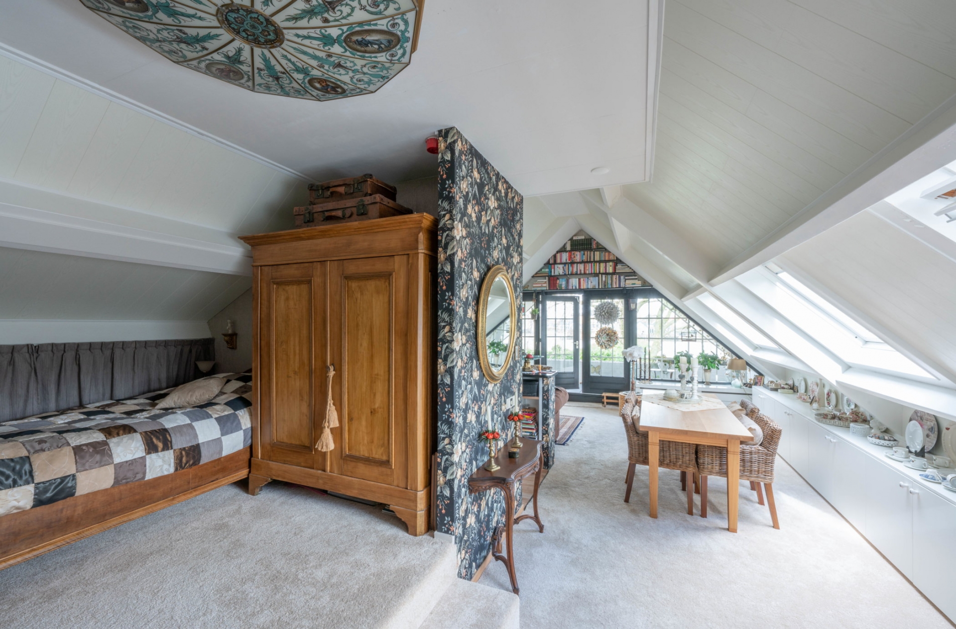 De rechtervleugel is een open ruimte waarbij u tot in de nok kunt kijken, wat een zeer ruimtelijk effect geeft mede door de vele raampartijen.