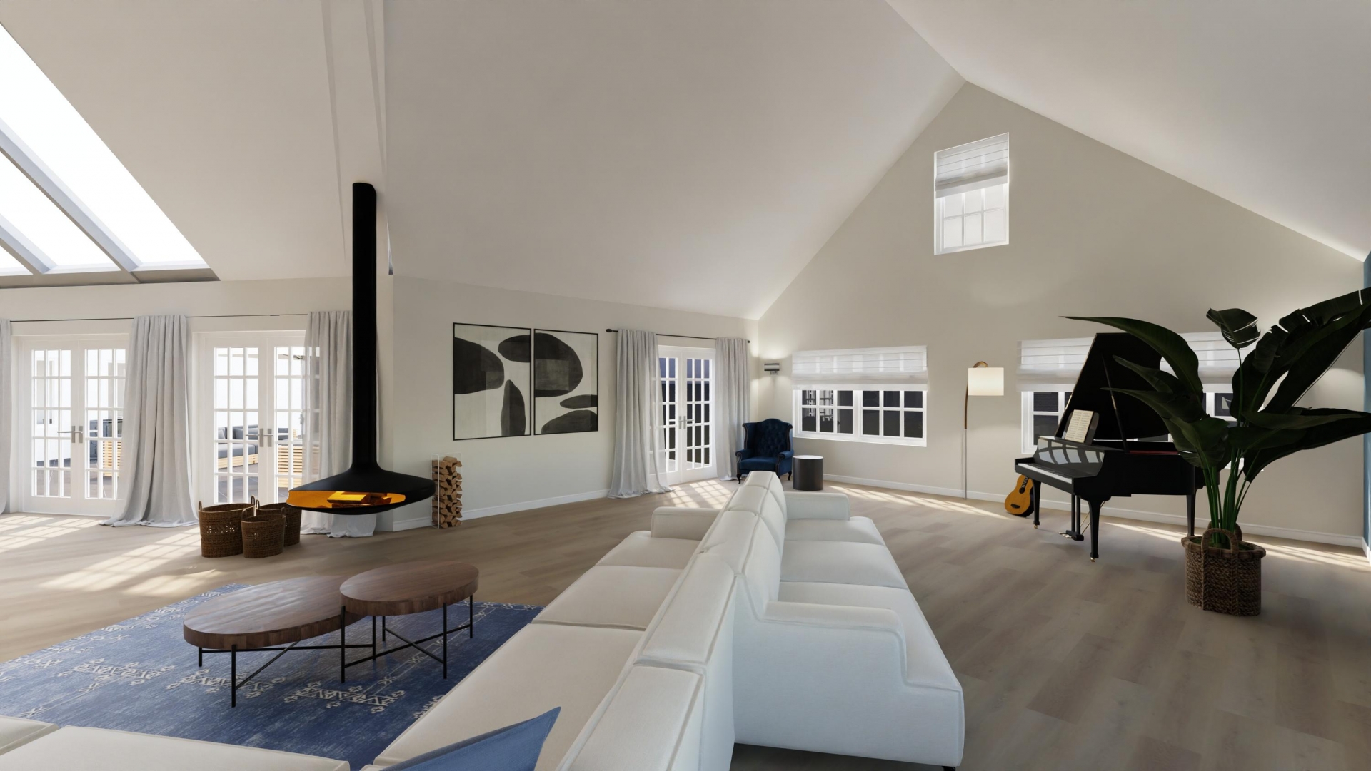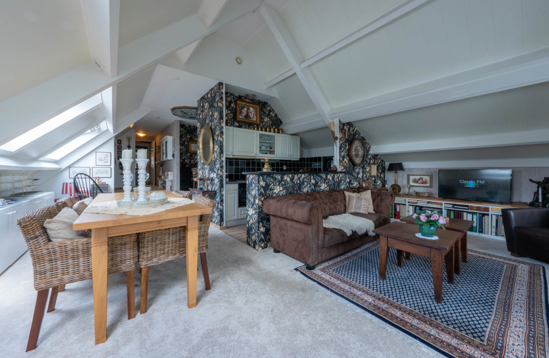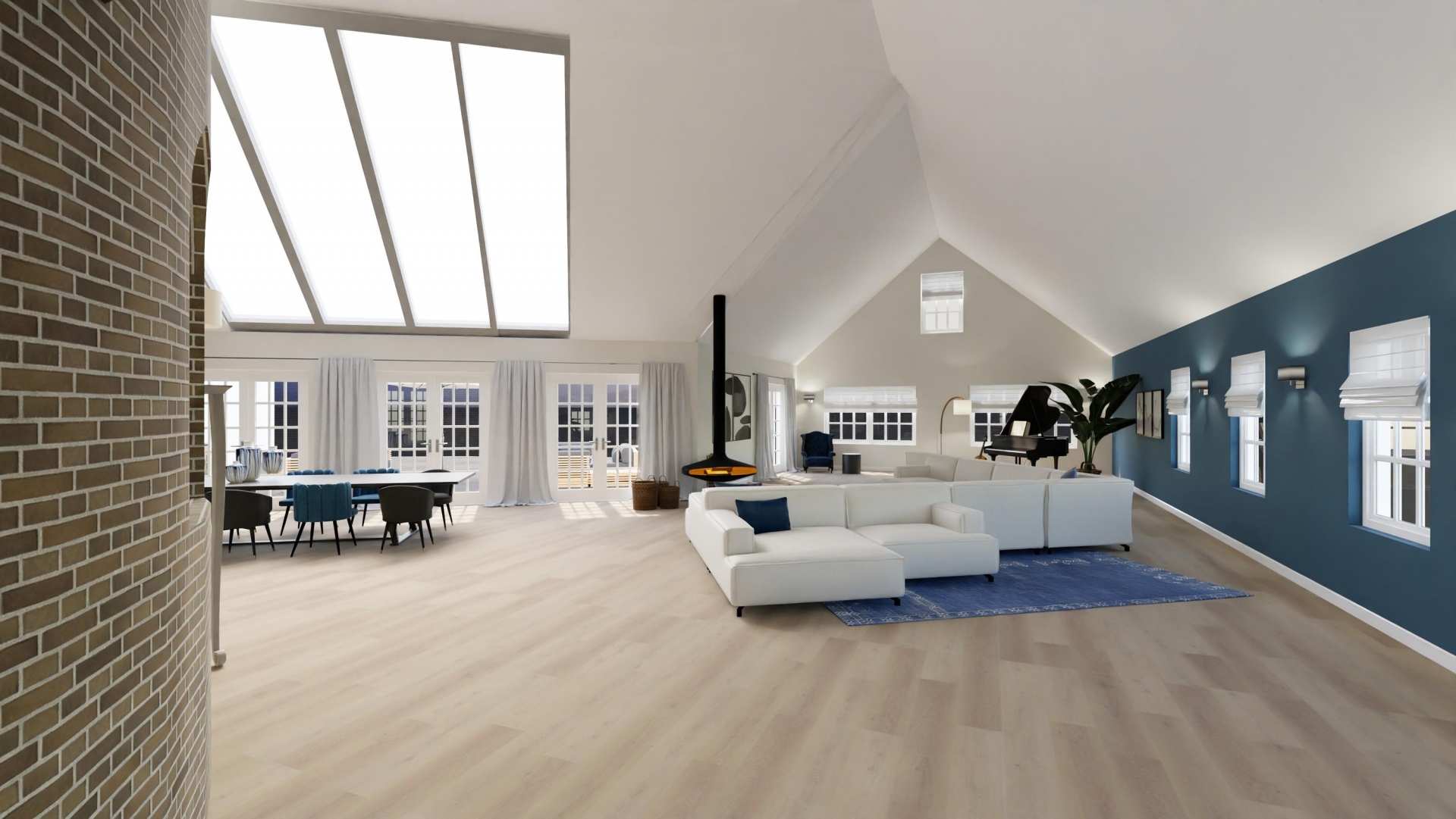 De rechtervleugel is een open ruimte waarbij u tot in de nok kunt kijken, wat een zeer ruimtelijk effect geeft mede door de vele raampartijen.