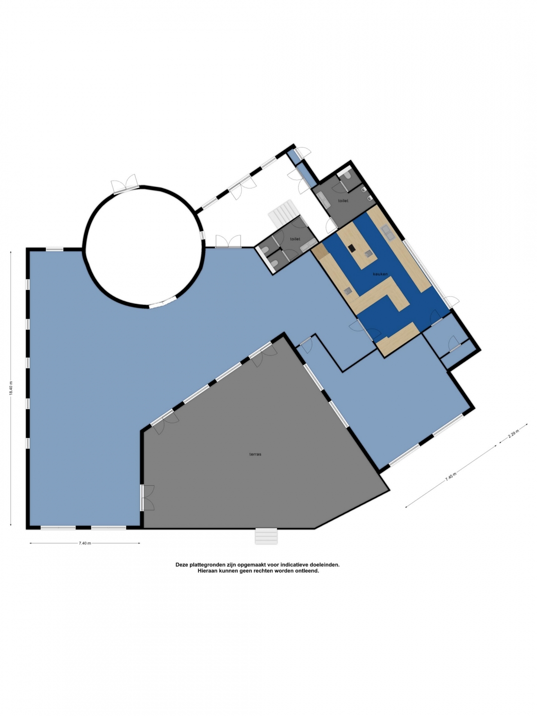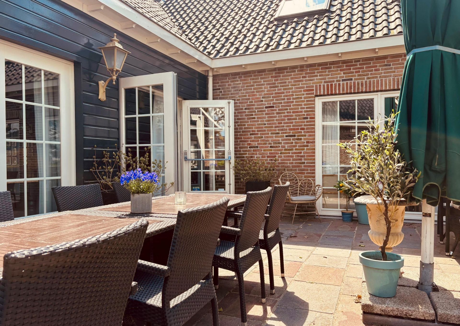 Dubbele deuren naar de grote ruimte in het midden van de molen, grote raampartijen met diverse openslaande deuren naar het terras alsmede een open haard. In de molen zelf is de bar gerealiseerd, met daaronder een (wijn)kelder van maar liefst ca. 45 m².