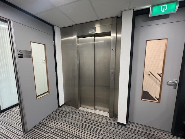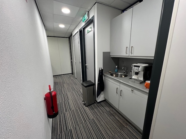 Hal met lift, trappenhuis, dames en herentoiletten, gang en een pantry. Kantoorruimtes (kamer 1 = 21m² en kamer 2 = 17m²) kenmerkt zich door een prachtig uitzicht en veel lichtinval door de grote raampartijen.