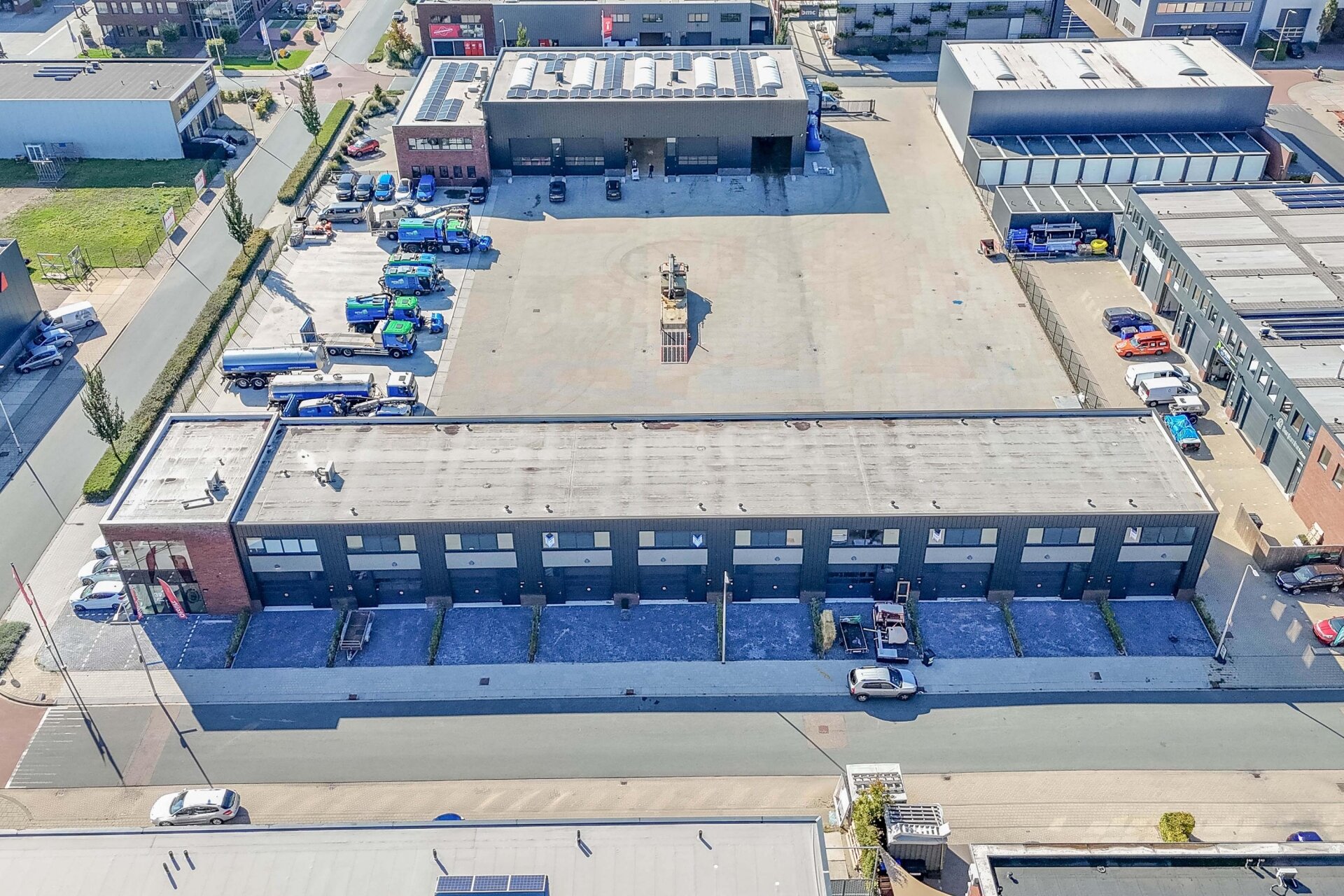 Parkeren dient voor de unit te gebeuren. Er zijn 2 exclusieve parkeerplaatsen per bedrijfsunit beschikbaar en 5 exclusieve parkeerplaatsen voor de kantoorunit beschikbaar.