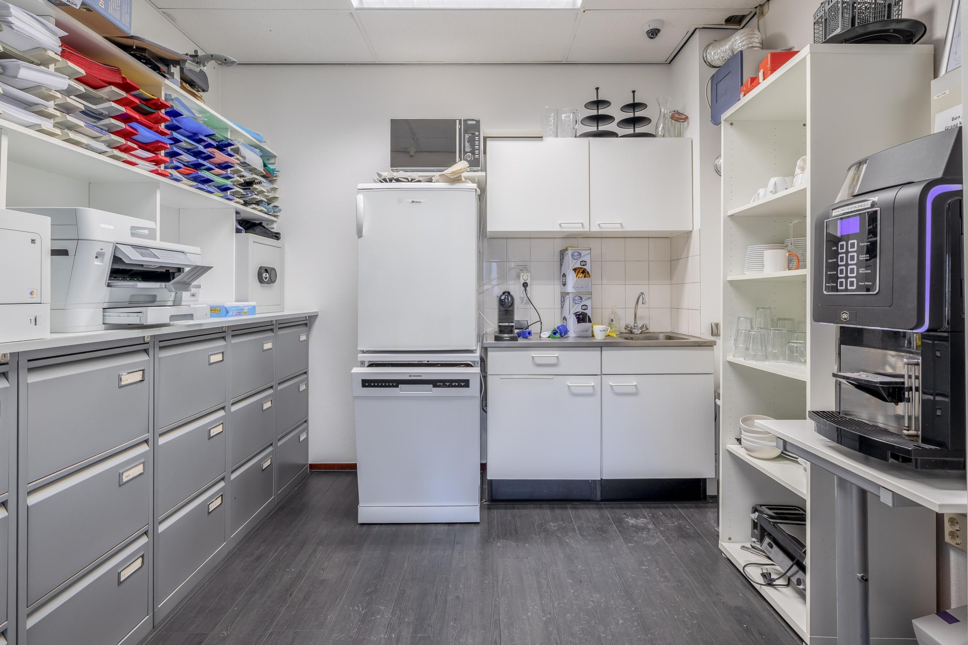 - verdiepings voorzien van systeemplafond met verlichtingsarmaturen en pantry.