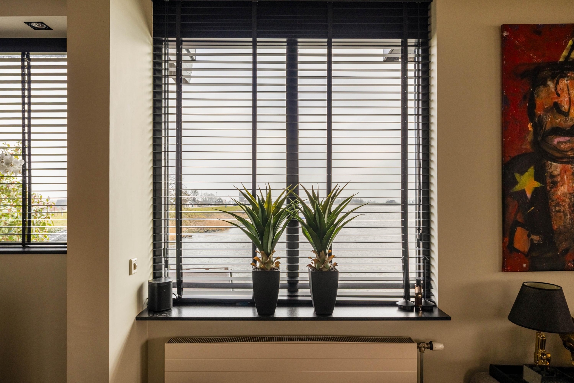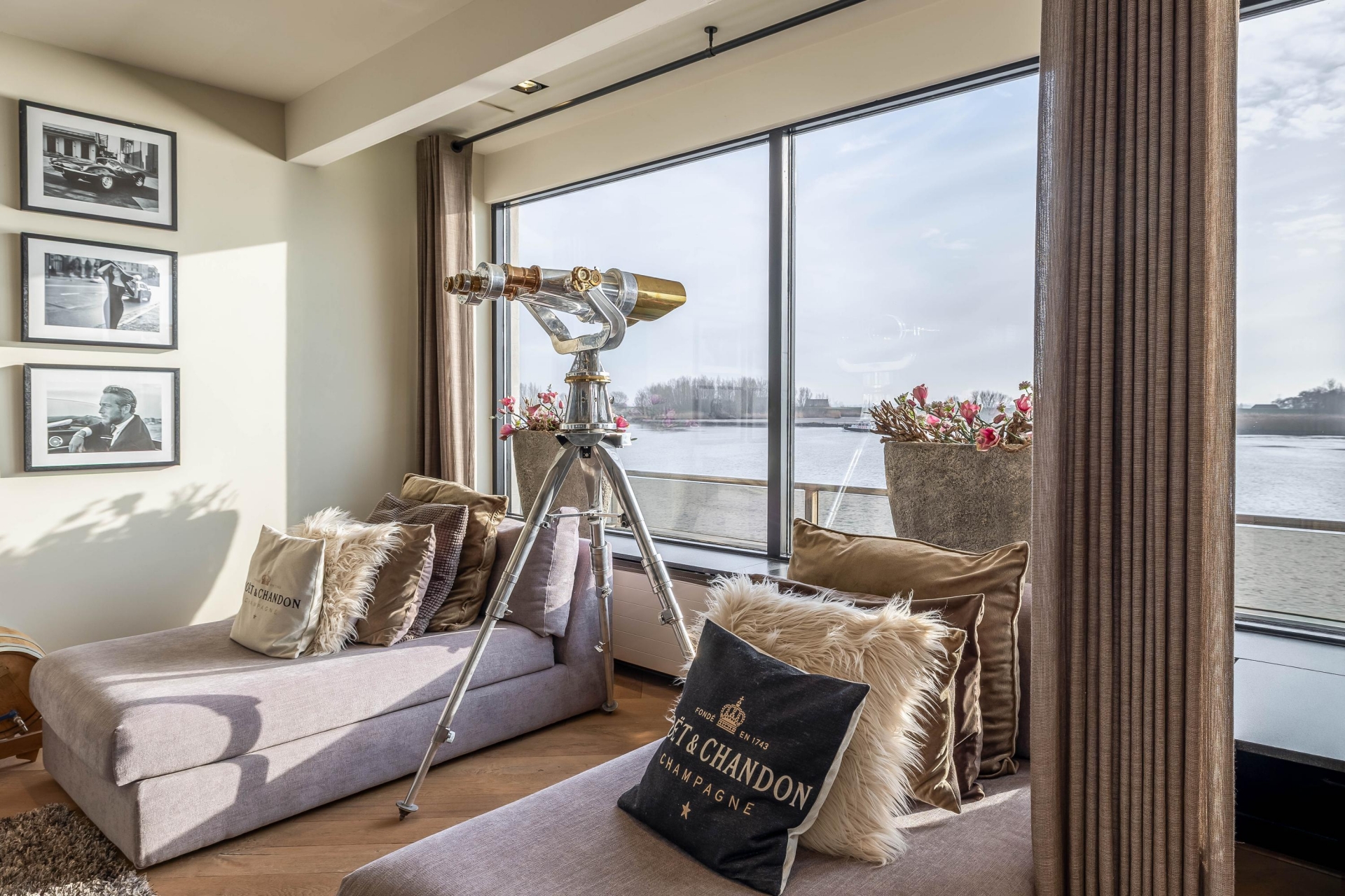 De woonverdieping is ruim opgezet en voelt direct prettig aan. Grote raampartijen zorgen voor veel licht en maken het uitzicht onderdeel van het interieur. De woonkamer biedt volop ruimte voor meerdere zitplekken, waarbij het water altijd de hoofdrol speelt. Of je nu overdag geniet van de rust of ’s avonds de zon langzaam ziet zakken achter de dijk, dit huis biedt elke dag een ander decor.