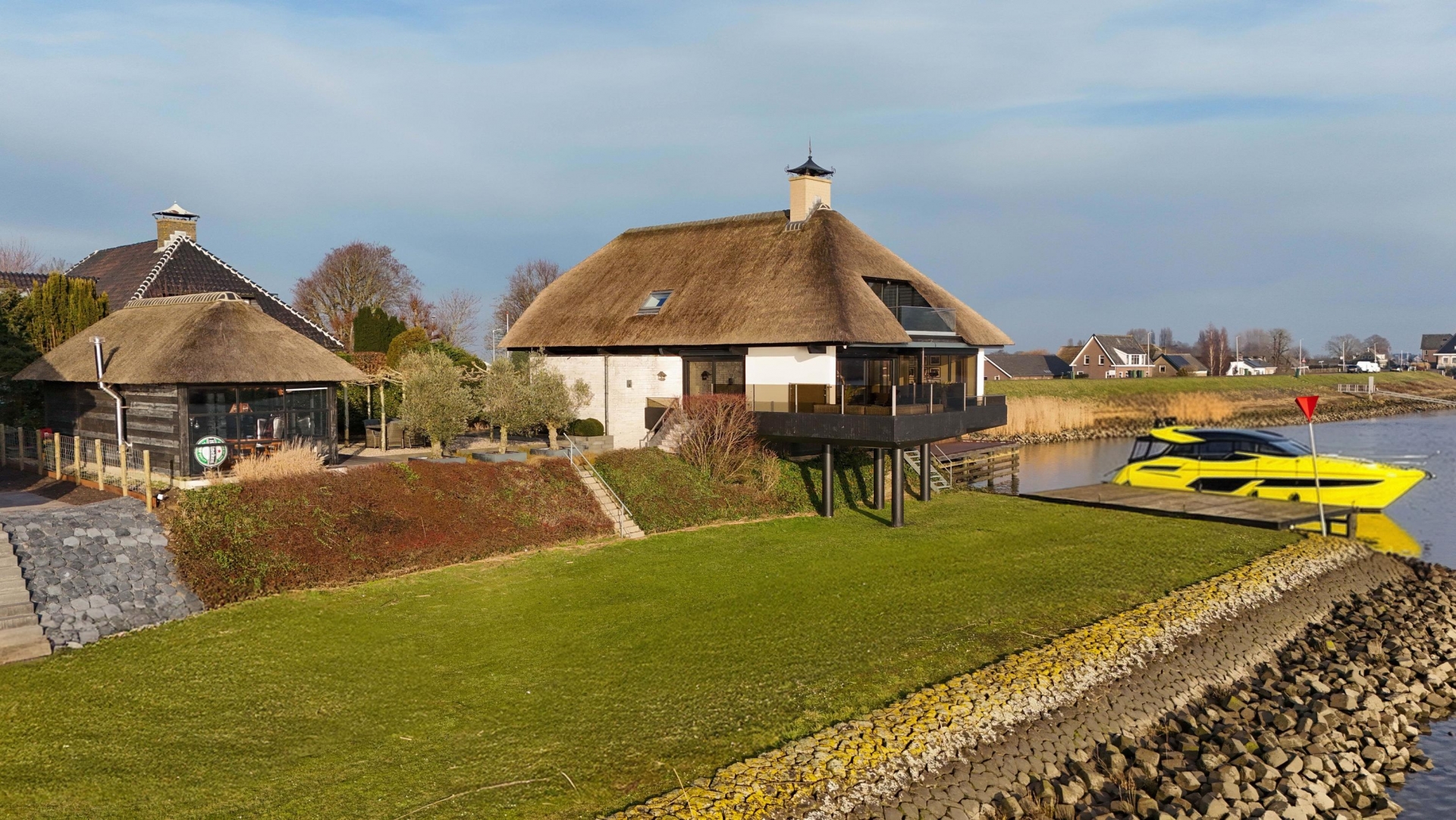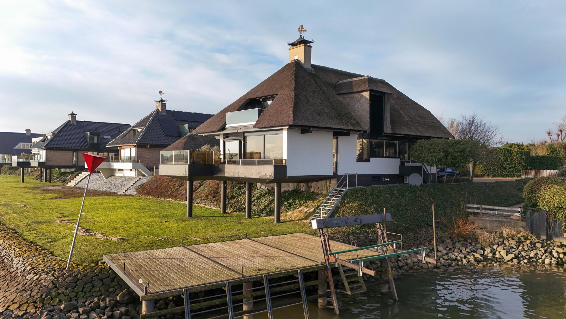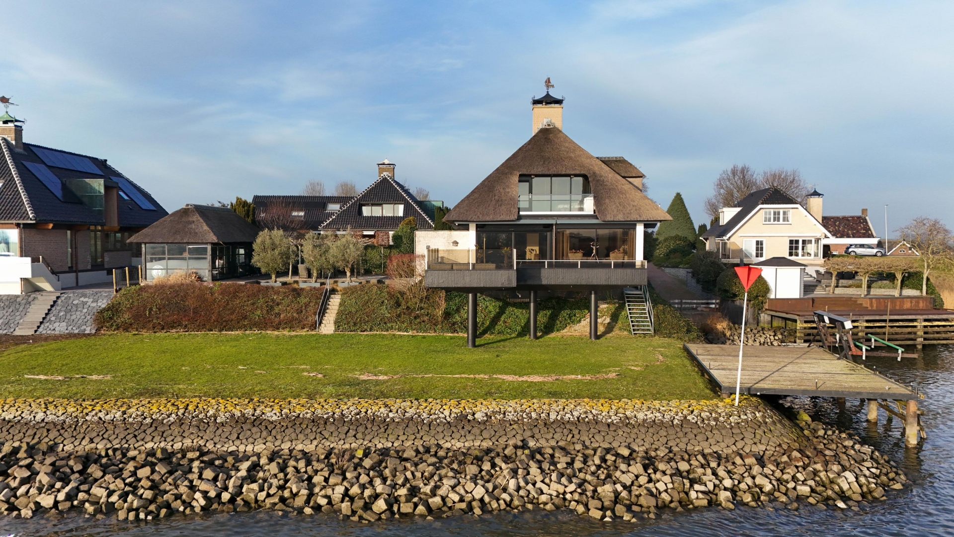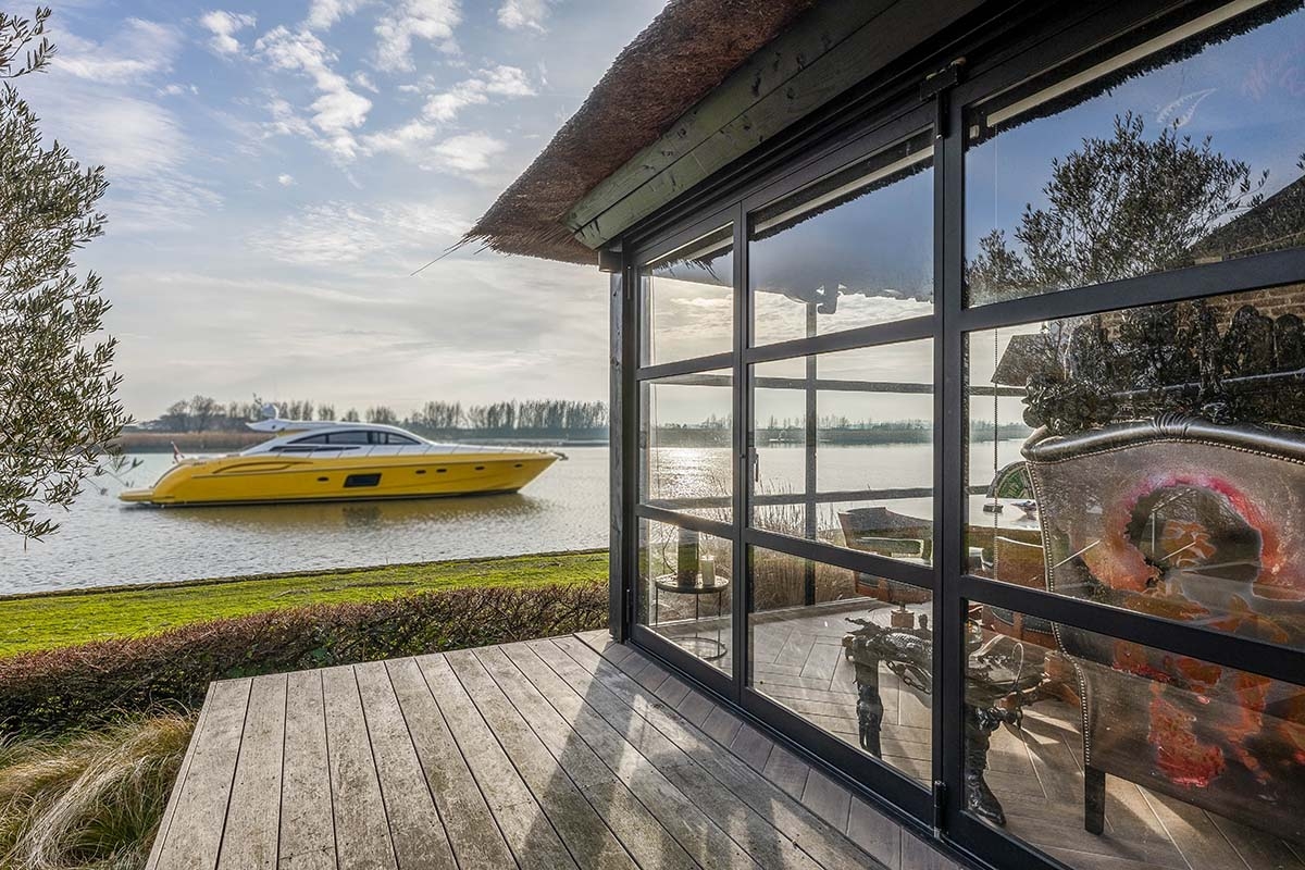 De Werf 5 in Lekkerkerk is een huis voor mensen die weten wat ze willen. Rust, ruimte, water aan je voeten en comfort op hoog niveau. Deze rietgedekte villa ligt op een werkelijk zeldzame plek, direct aan de rivier de Lek, met een eigen aanlegsteiger en bootlift. Hier stap je vanuit je tuin zo de boot op en vaar je richting de Biesbosch, Dordrecht of Rotterdam. Het uitzicht over het water verveelt nooit en verandert elk moment van de dag. Dit is wonen met allure, vrijheid en privacy.