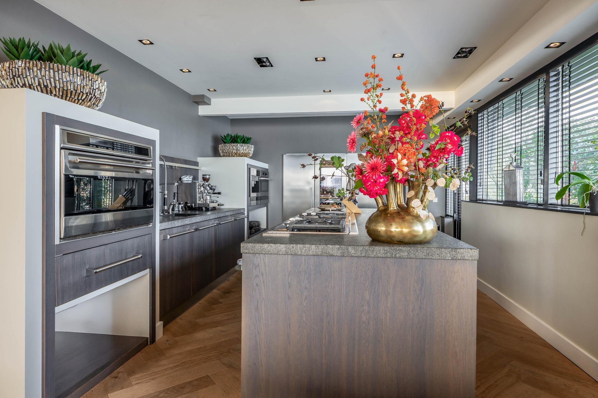 De keuken vormt het stijlvolle middelpunt van het huis. Dit is een plek waar koken en samenzijn moeiteloos samenkomen. De opstelling is royaal, met veel werkruimte en hoogwaardige inbouwapparatuur. Ideaal voor dagelijks gebruik, maar ook perfect voor wie graag gasten ontvangt en uitgebreid kookt. De afwerking is luxe en warm, passend bij het karakter van de villa.