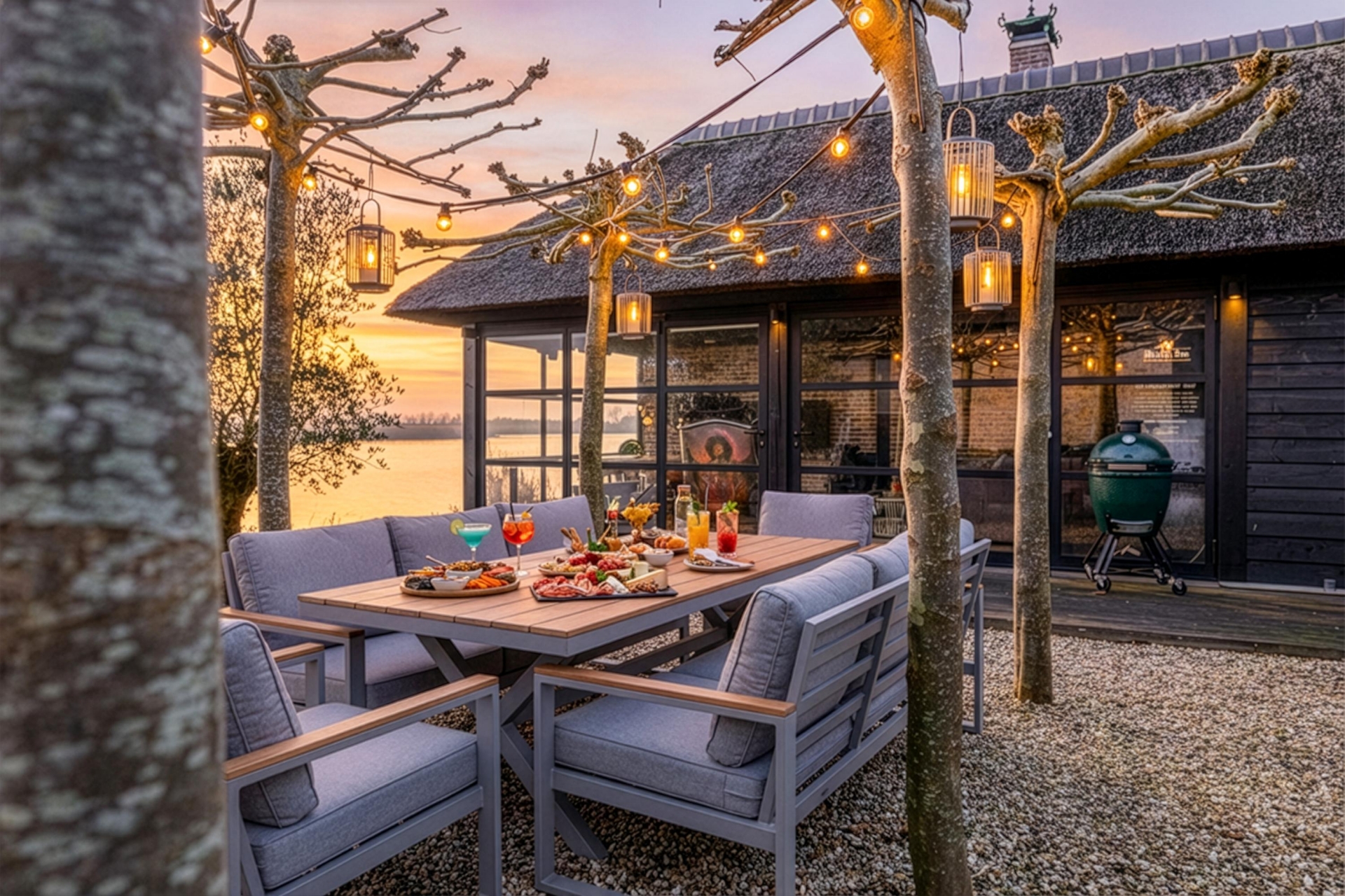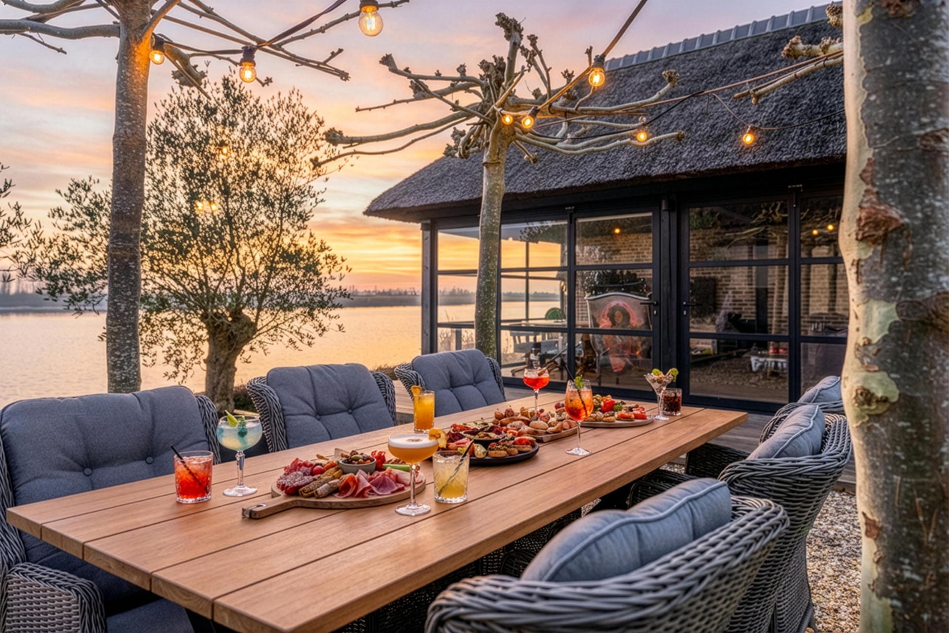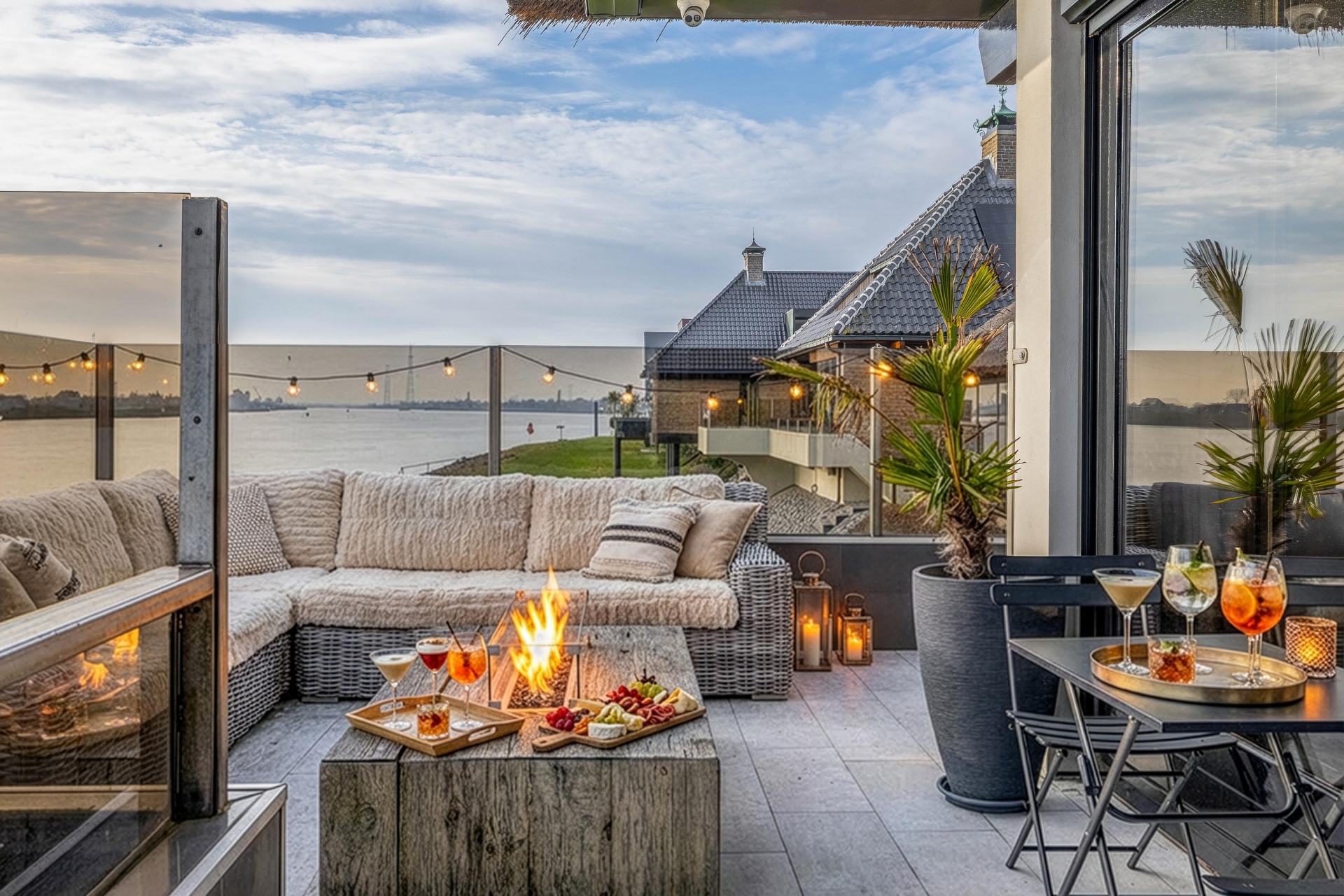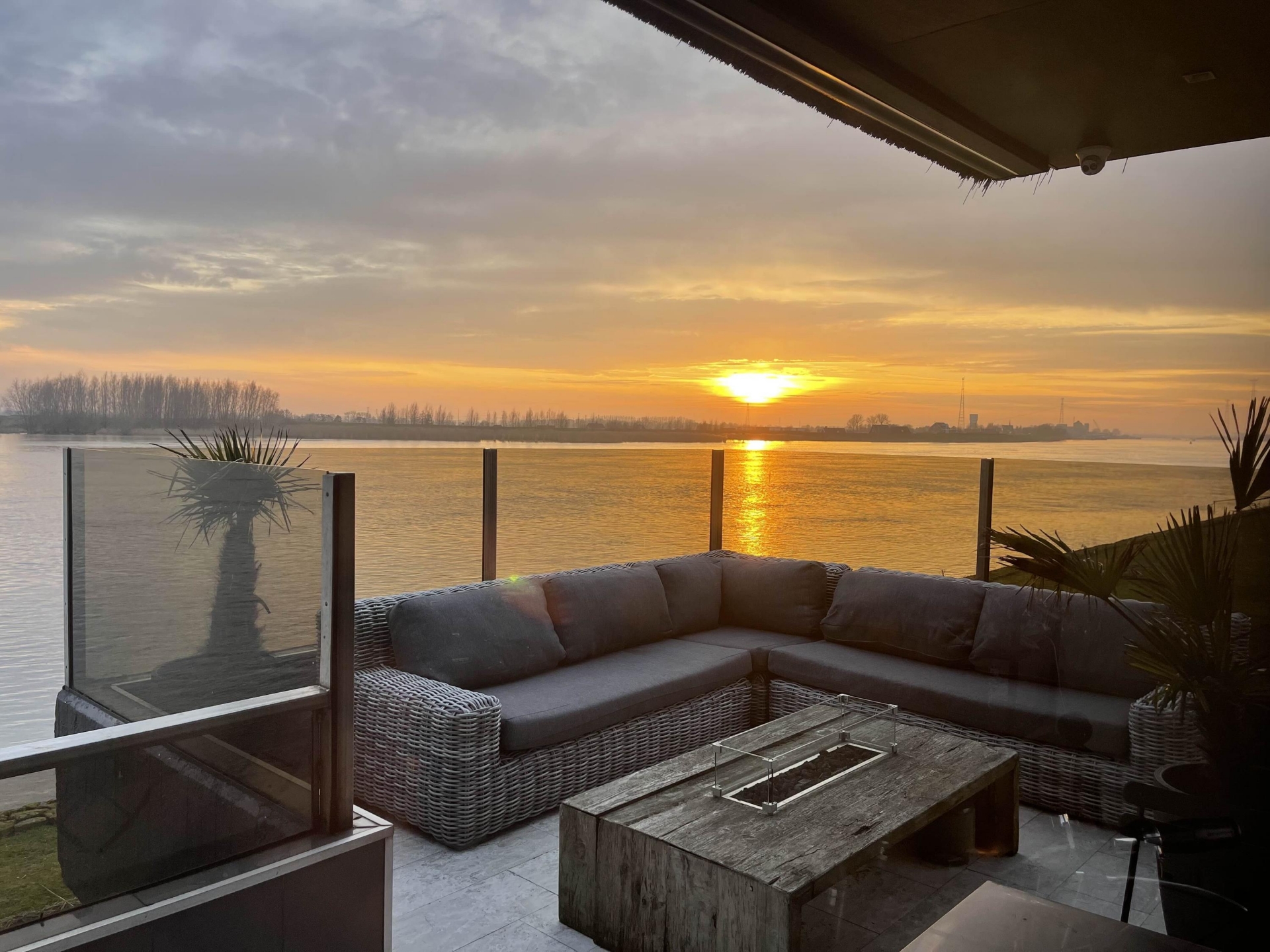 De tuin rondom de villa is met zorg aangelegd en biedt meerdere plekken om van het buitenleven te genieten. Absoluut hoogtepunt is het nieuwe buitenverblijf met bar en open haard. Hier zit je beschut en sfeervol, ook wanneer de avonden langer worden en de temperatuur daalt. Dit is de plek voor lange diners, borrels met vrienden en ontspannen momenten met uitzicht op de Lek.