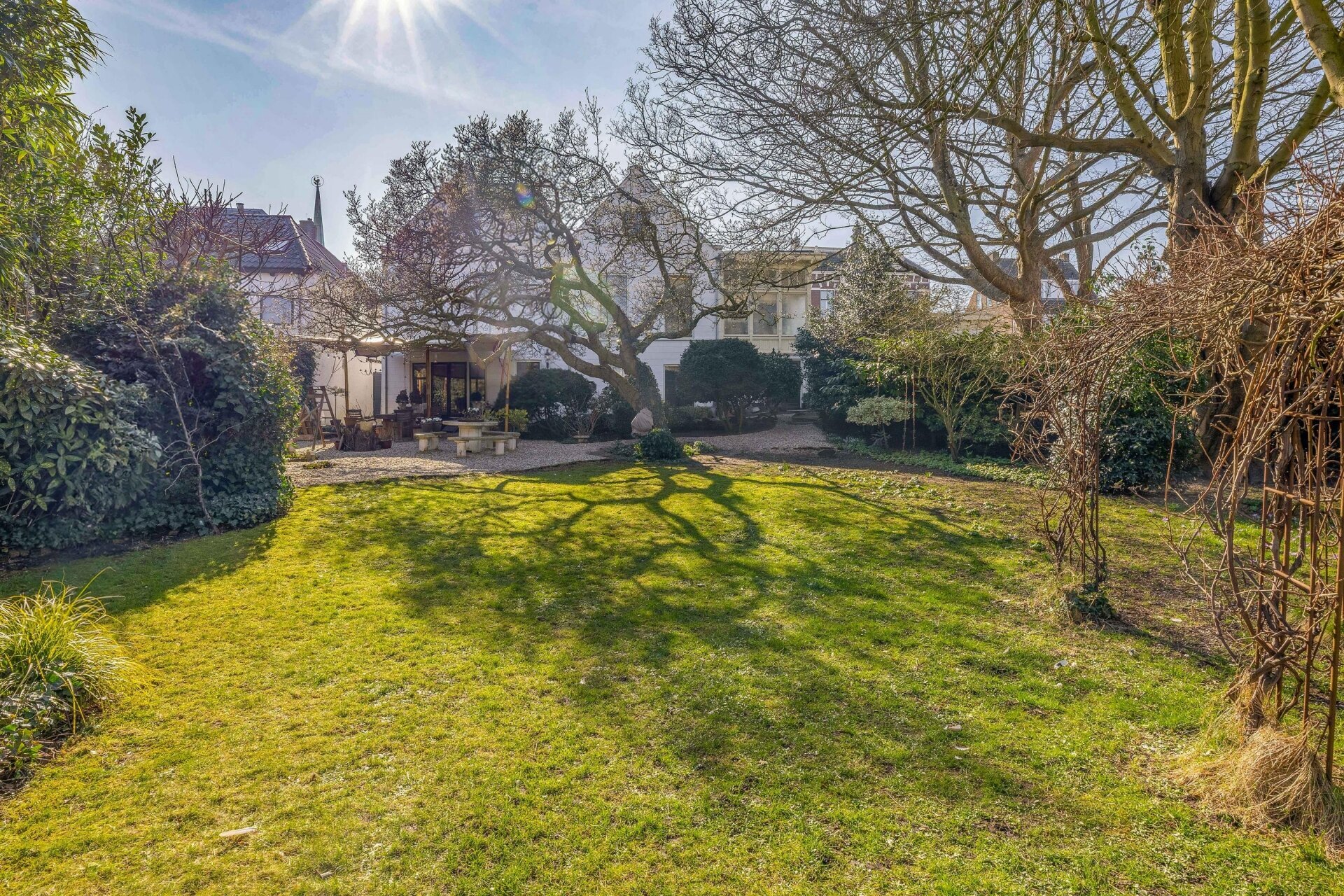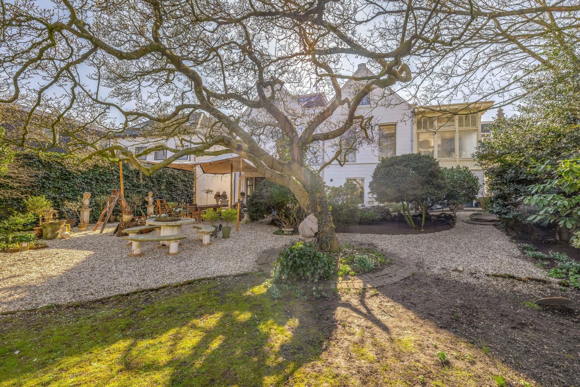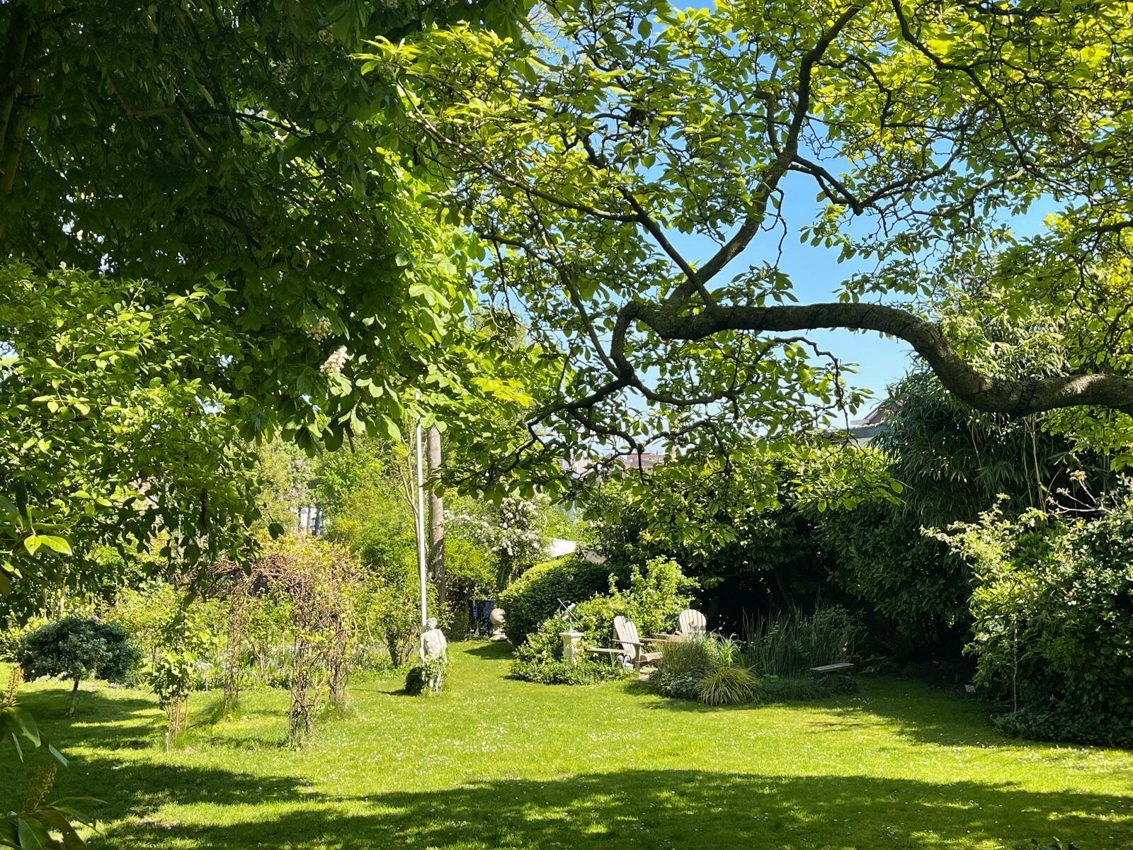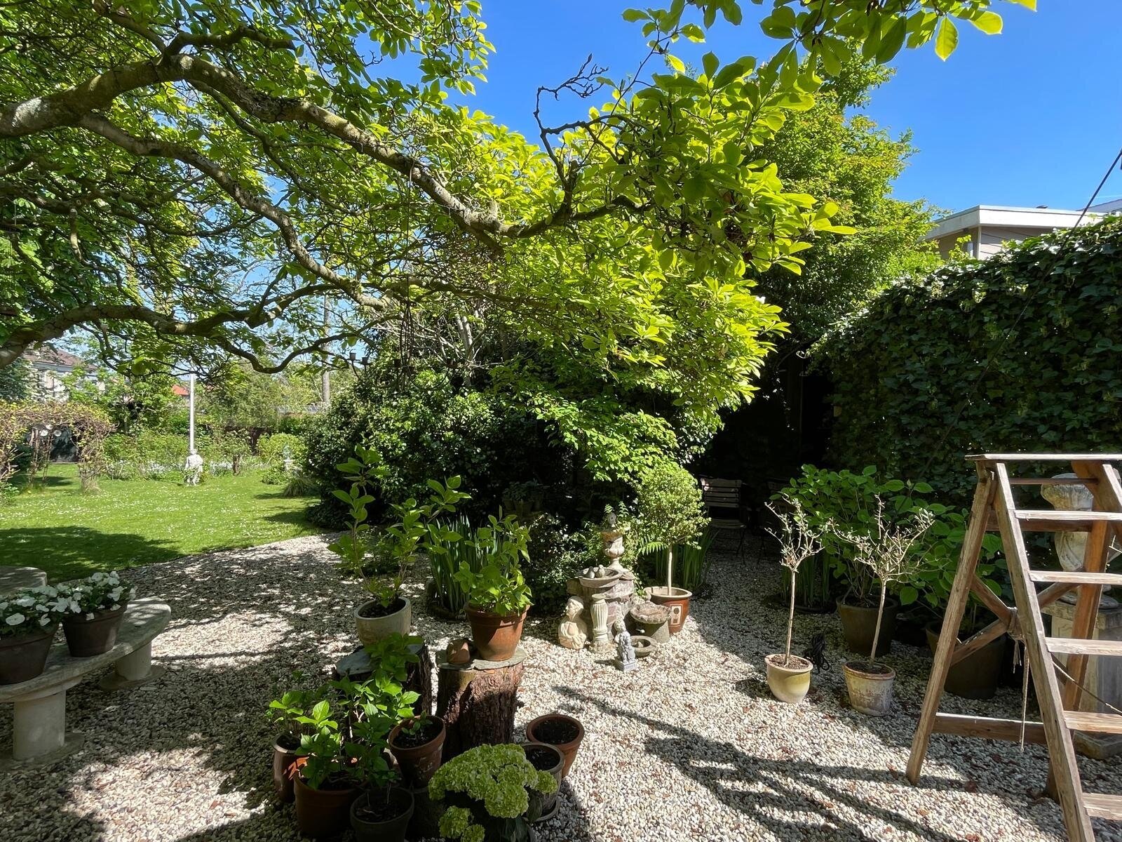 De ommuurde tuin is een oase van rust en harmonie, helemaal in lijn met de grandeur van het huis. Karaktervolle kastanjebomen, kronkelende grindpaden, een vijver en meerdere terrassen zorgen voor een unieke beleving. Achter in de tuin staat een Finse cottage met open haard — een heerlijke plek om te ontspannen of gasten te ontvangen. De tuin heeft bovendien een praktische zijuitgang naar naastgelegen parkeerplaatsen en het voetpad naar winkels en scholen.