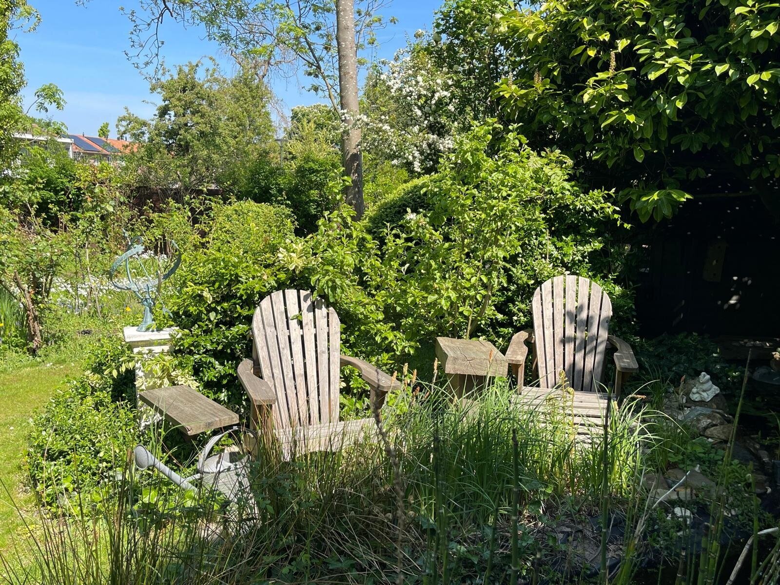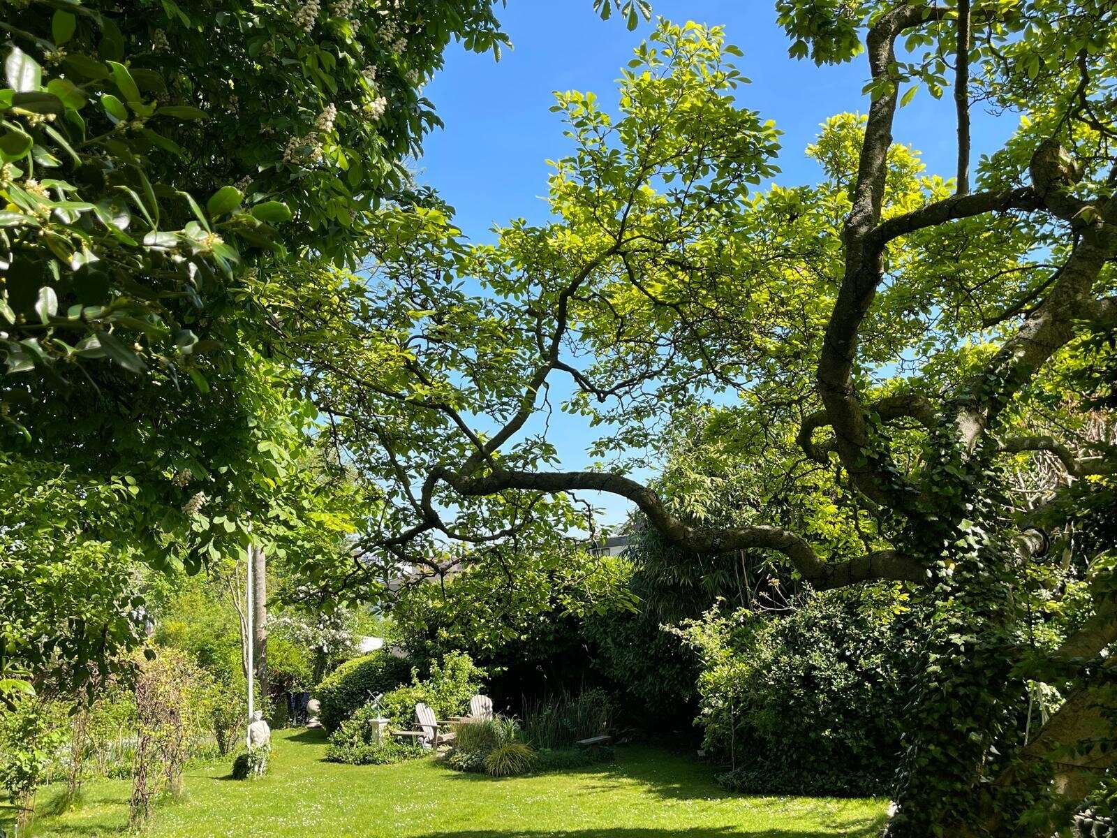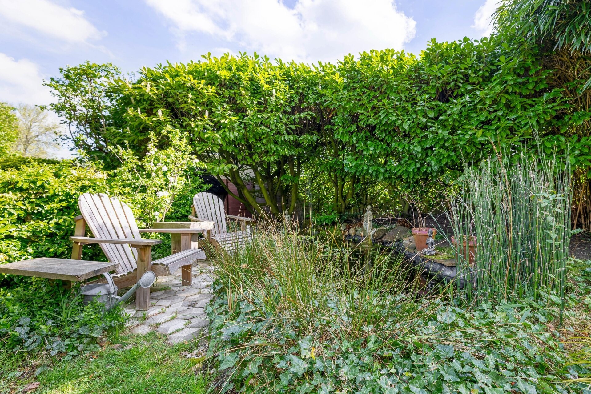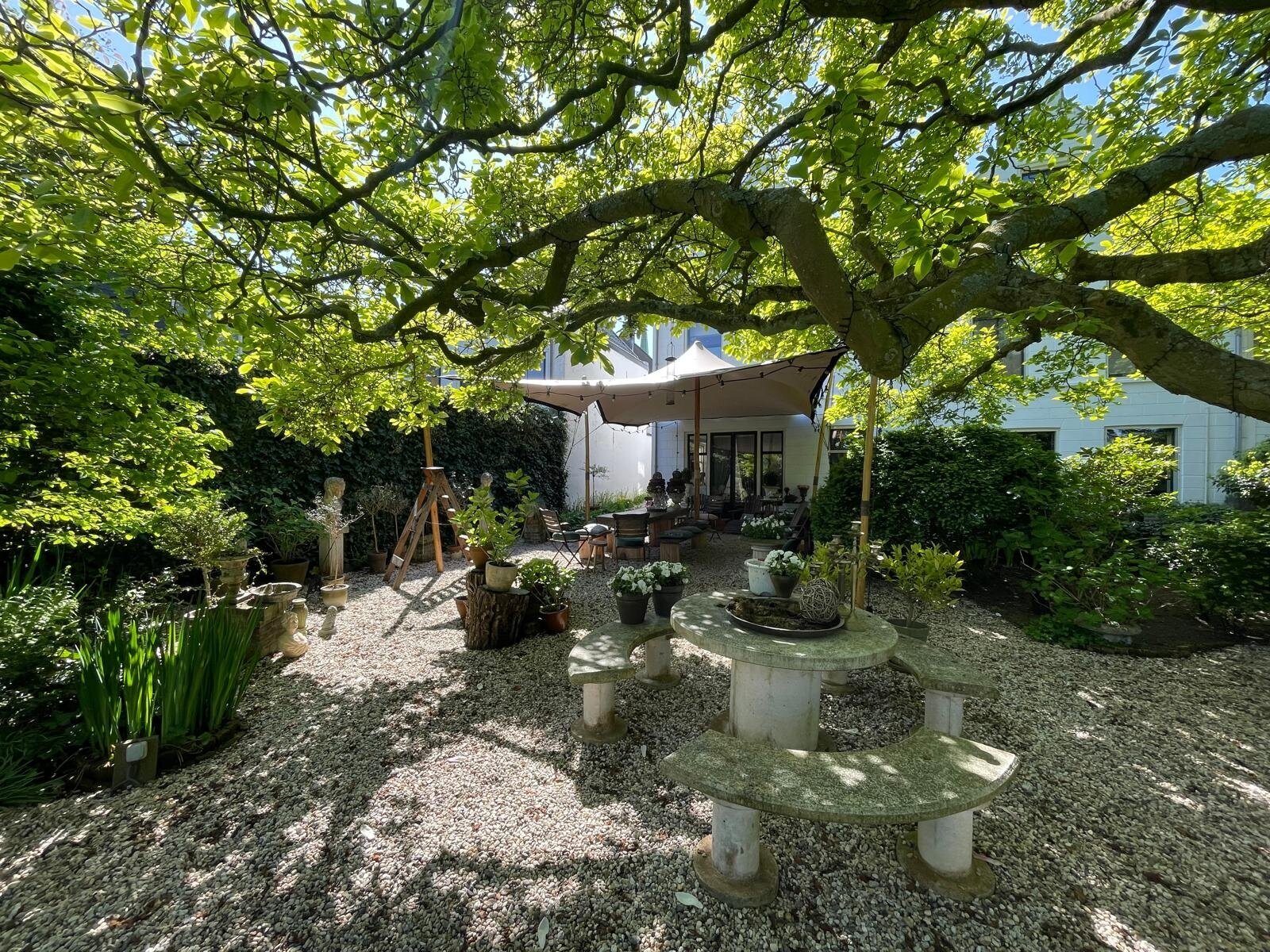 De ommuurde tuin is een oase van rust en harmonie, helemaal in lijn met de grandeur van het huis. Karaktervolle kastanjebomen, kronkelende grindpaden, een vijver en meerdere terrassen zorgen voor een unieke beleving. Achter in de tuin staat een Finse cottage met open haard — een heerlijke plek om te ontspannen of gasten te ontvangen. De tuin heeft bovendien een praktische zijuitgang naar naastgelegen parkeerplaatsen en het voetpad naar winkels en scholen.