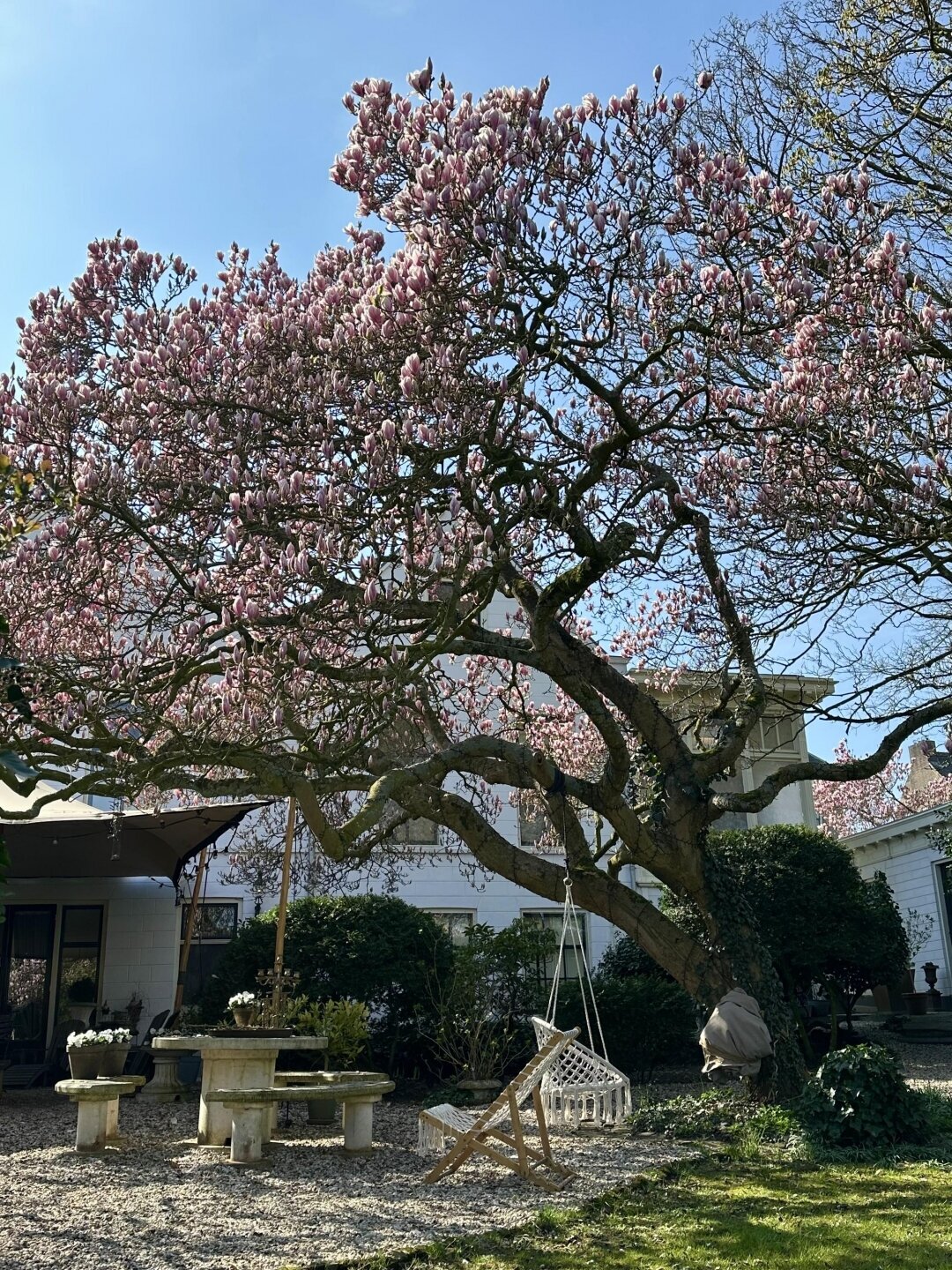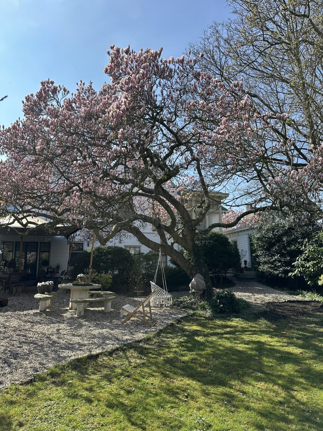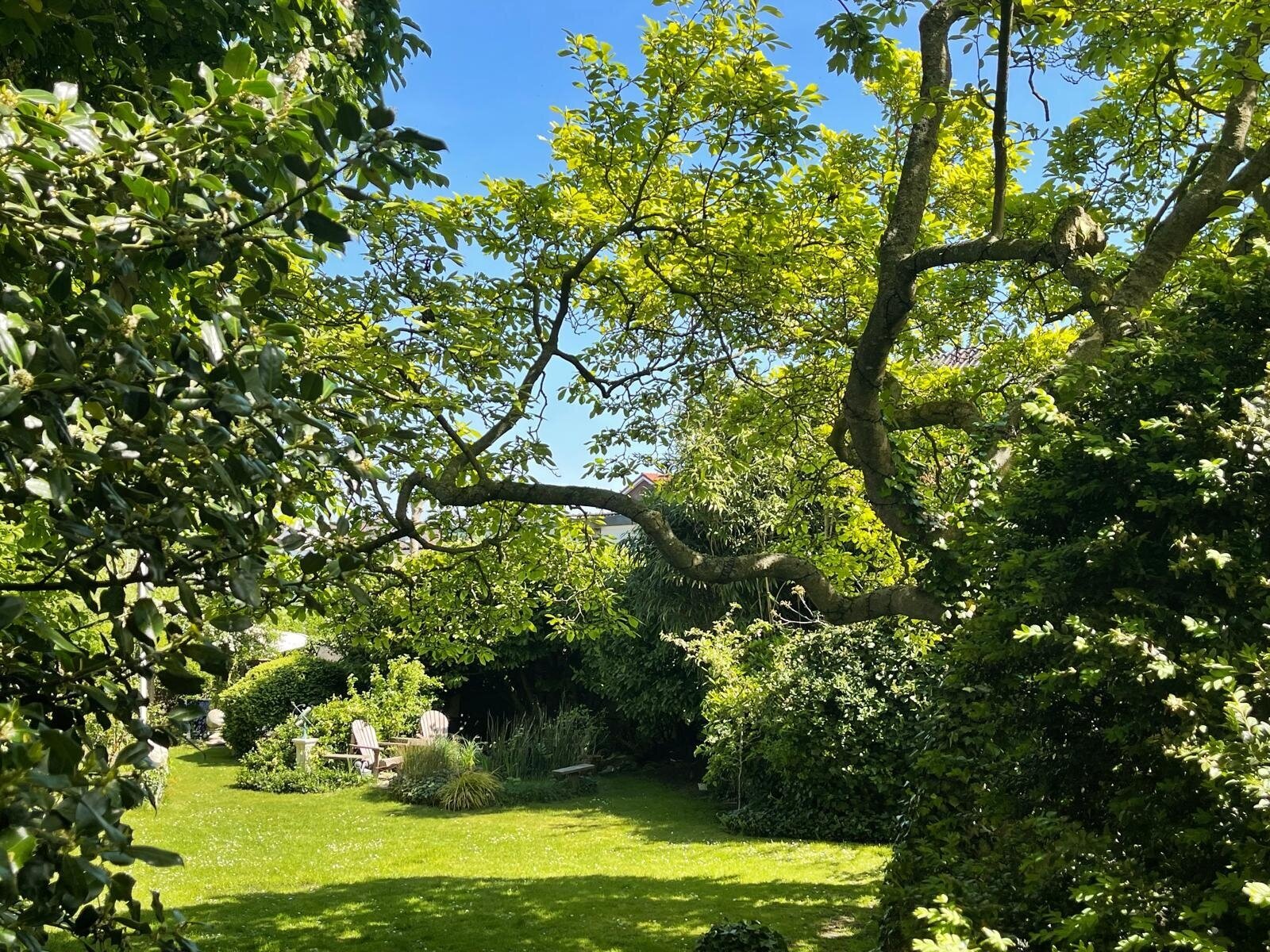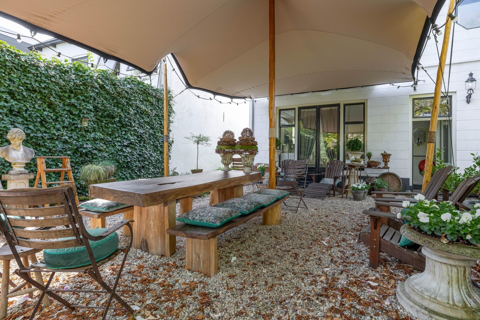 De ommuurde tuin is een oase van rust en harmonie, helemaal in lijn met de grandeur van het huis. Karaktervolle kastanjebomen, kronkelende grindpaden, een vijver en meerdere terrassen zorgen voor een unieke beleving. Achter in de tuin staat een Finse cottage met open haard — een heerlijke plek om te ontspannen of gasten te ontvangen. De tuin heeft bovendien een praktische zijuitgang naar naastgelegen parkeerplaatsen en het voetpad naar winkels en scholen.