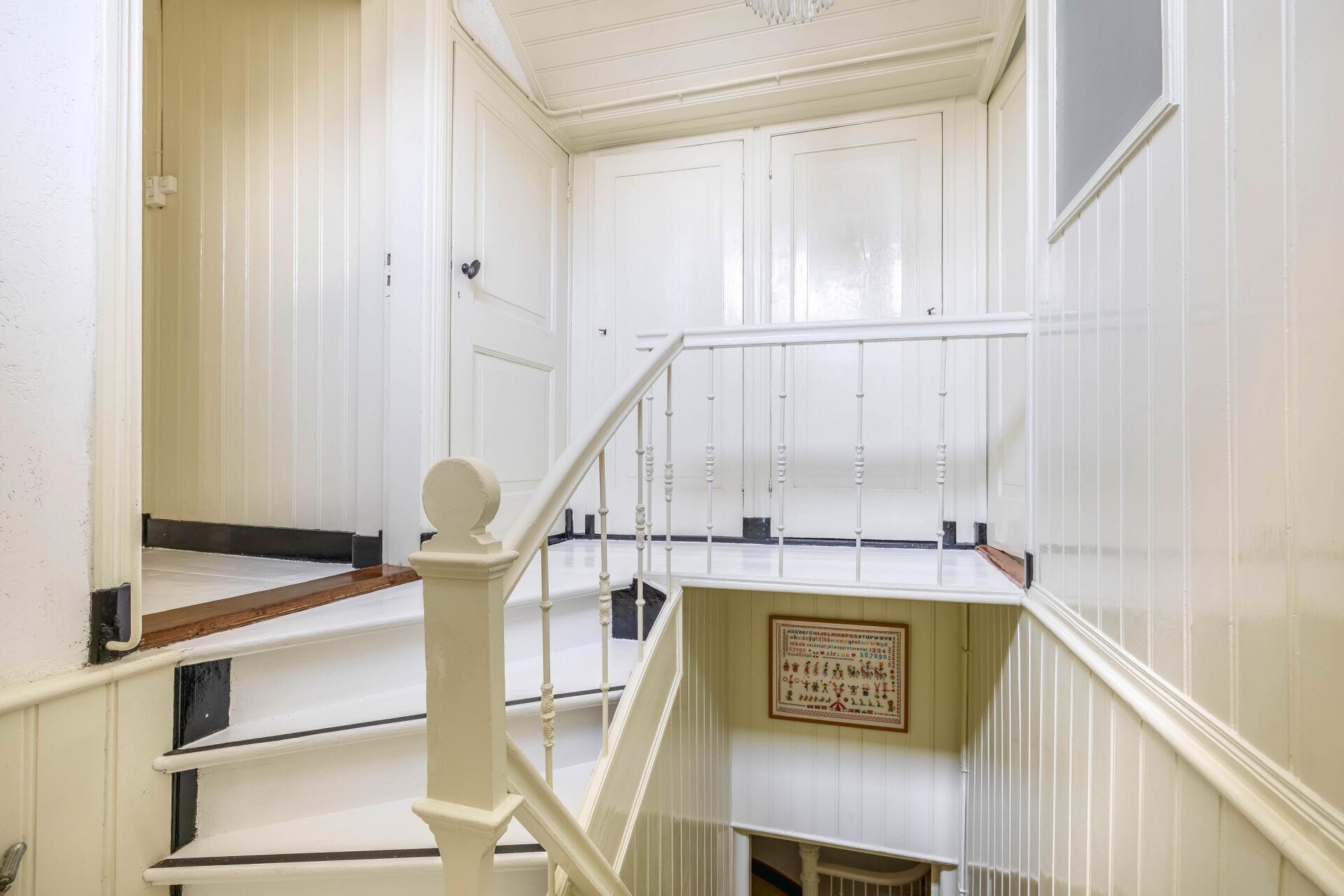 Het huis heeft een zeer praktische indeling over meerdere niveaus. Op dijkniveau vind je onder andere de sfeervolle woonkamer met open haard en plafondschildering, een eetkamer die door schuifdeuren verbonden is met de indrukwekkende serre, een slaapkamer en een badkamer met antiek ligbad. De eerste verdieping biedt royale slaapkamers, waaronder een kamer met eigen pantry en uitzicht op de rivier de Lek — perfect voor B&B of zelfstandig appartement. De tweede verdieping herbergt een sfeervolle grote zolderkamer met vernieuwde kozijnen. In het souterrain tref je een woonkeuken, een gezellige tuinkamer met openslaande deuren naar de tuin, diverse kelderruimtes en een wijnkelder.