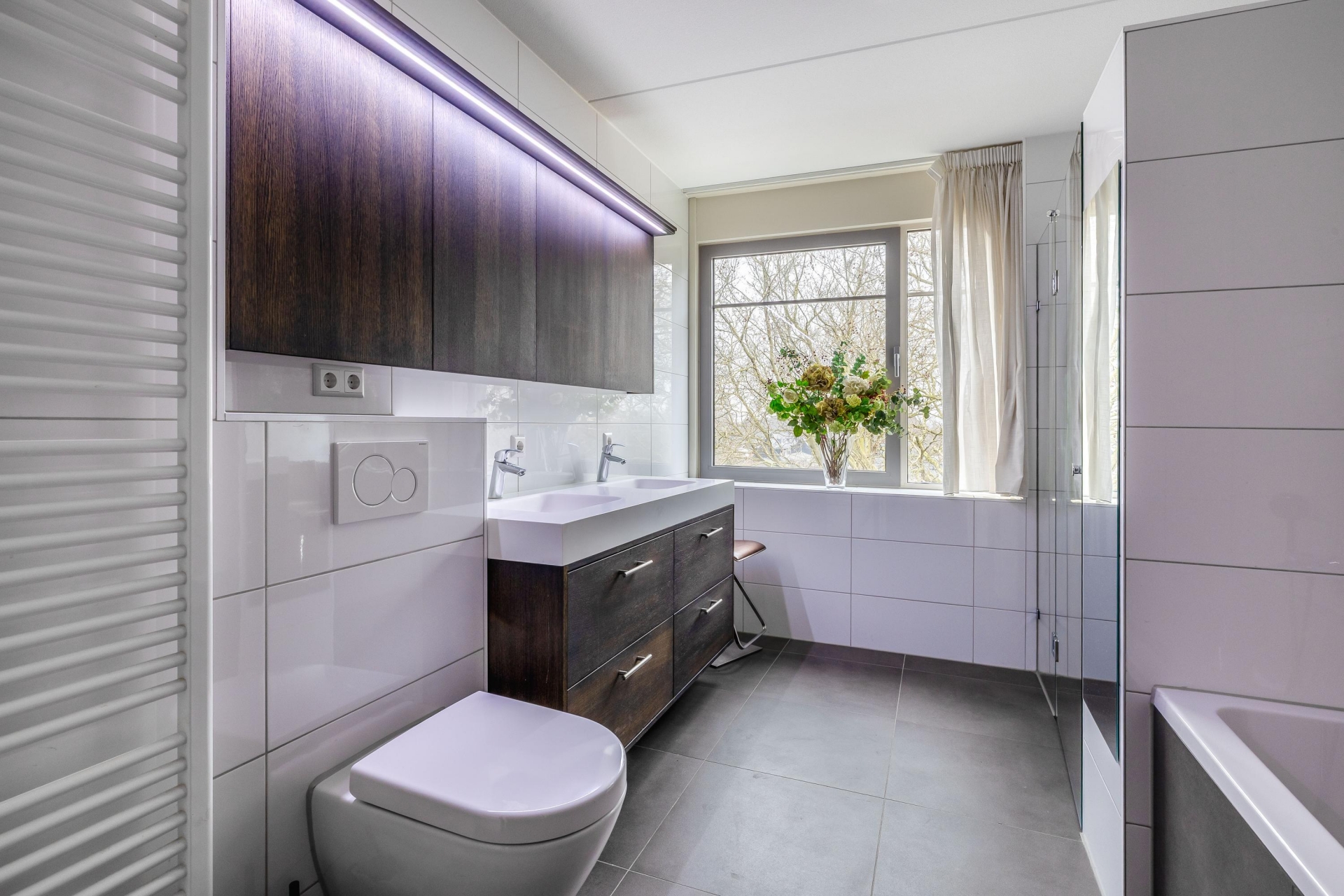 De ensuite badkamer is stijlvol en comfortabel ingericht en beschikt over een ligbad, ruime inloopdouche, dubbele wastafel en hoogwaardige afwerking. Alles is ruim opgezet en perfect passend bij de doelgroep die gelijkvloers wil wonen zonder concessies te doen aan luxe en comfort. De tweede badkamer is ideaal voor logees of (klein) gezin en zorgt ervoor dat iedereen hier zijn eigen plek heeft.