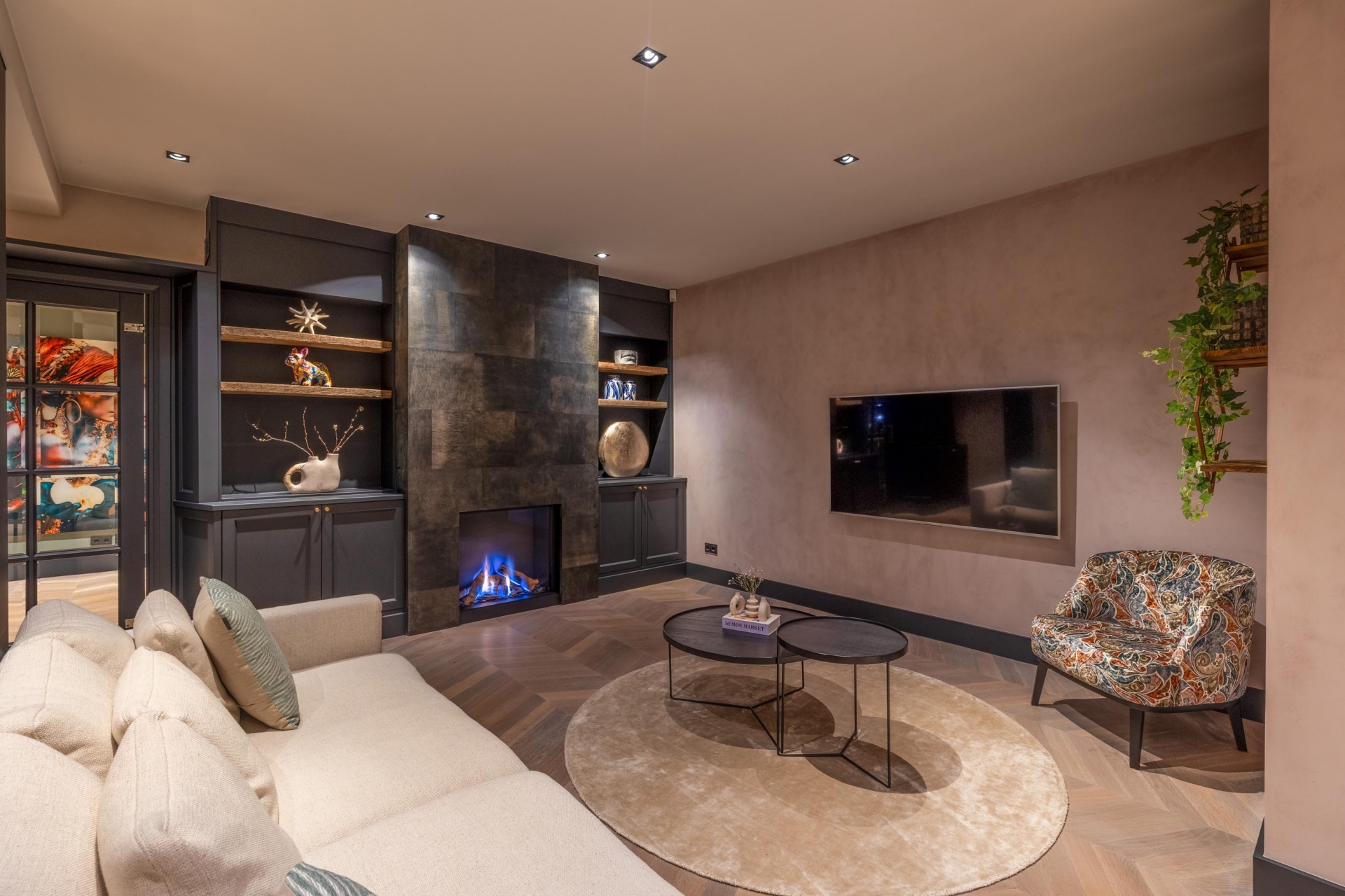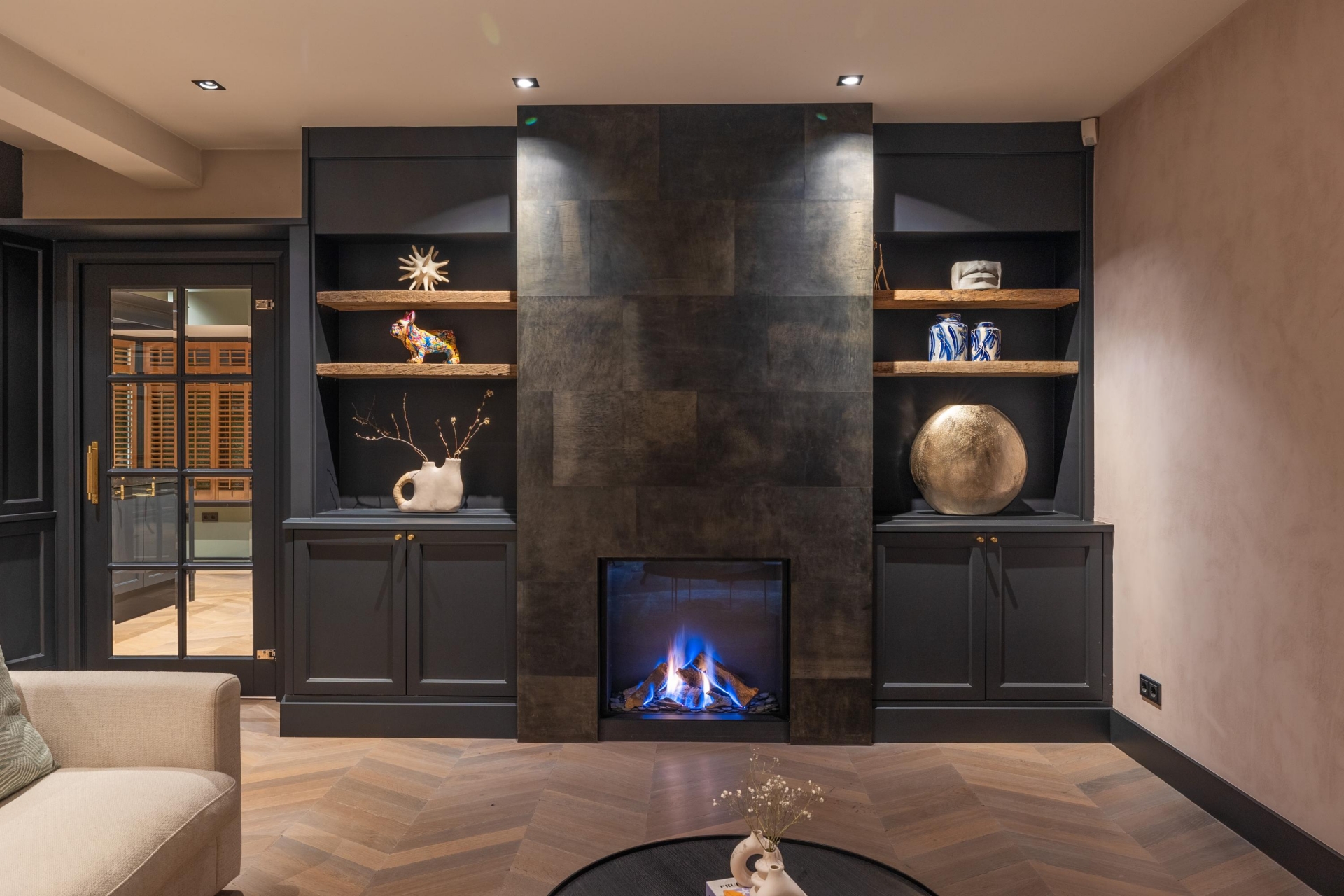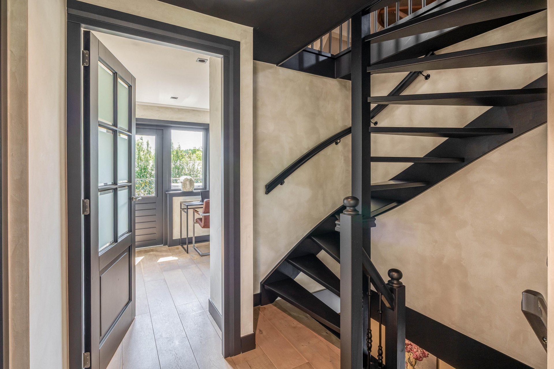 De begane grond biedt volop ruimte om te leven, te koken en te ontspannen. De inrichting is harmonieus, met aandacht voor detail – van de perfecte verlichting tot aan de luxueus uitgevoerde afwerking van vloeren, wanden en ingebouwde elementen. Alles draagt bij aan een sfeer van ingetogen luxe.