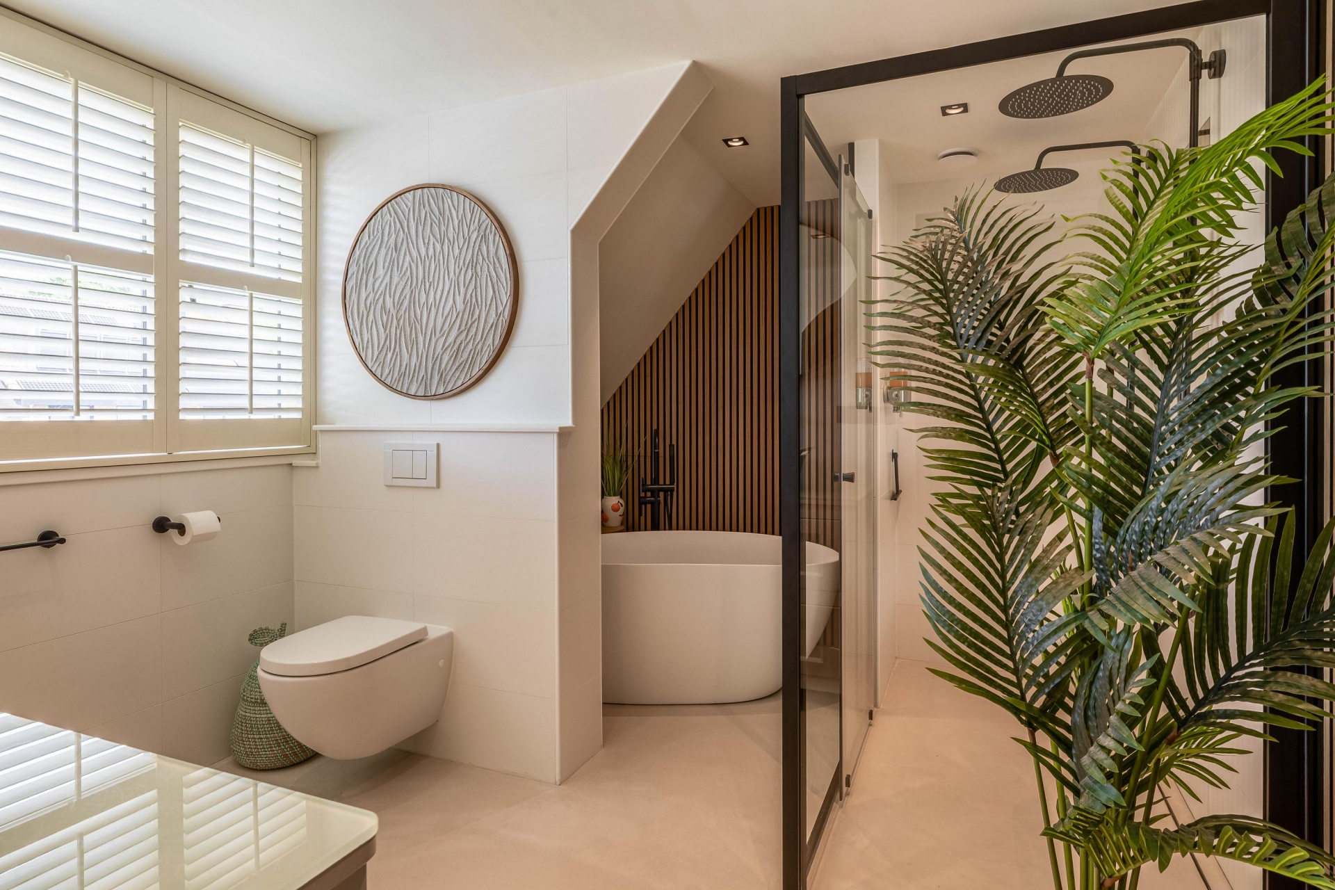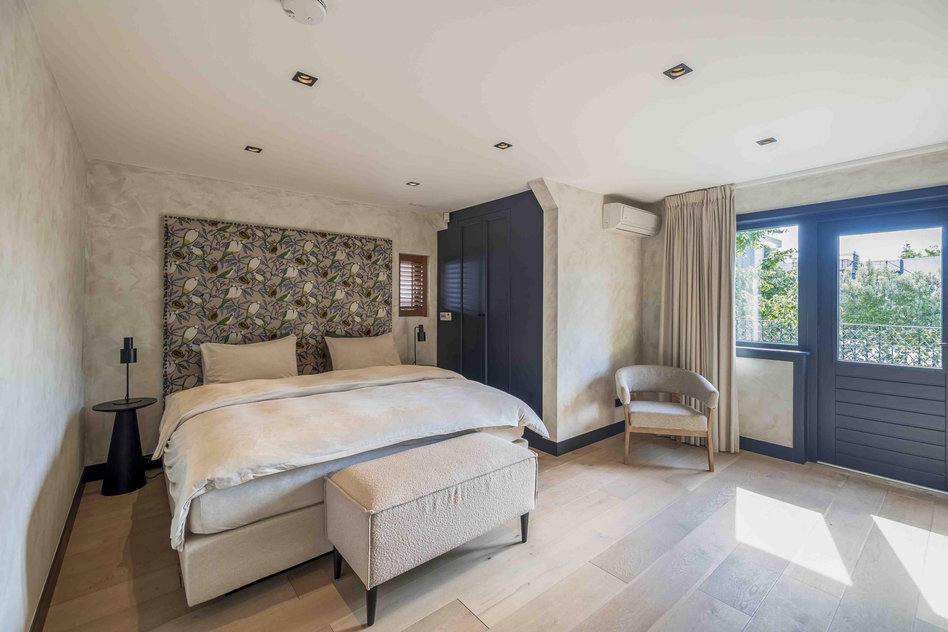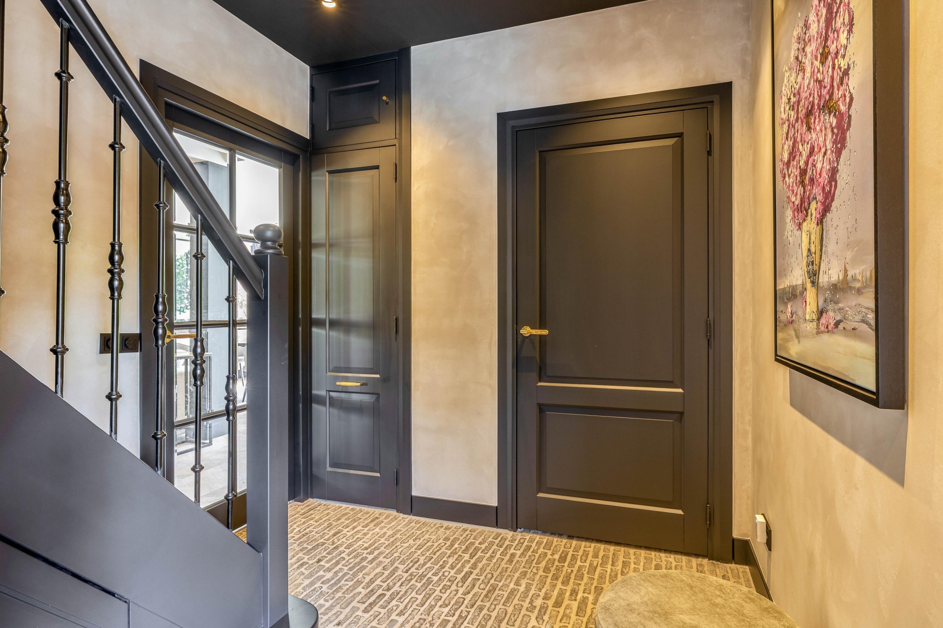De begane grond biedt volop ruimte om te leven, te koken en te ontspannen. De inrichting is harmonieus, met aandacht voor detail – van de perfecte verlichting tot aan de luxueus uitgevoerde afwerking van vloeren, wanden en ingebouwde elementen. Alles draagt bij aan een sfeer van ingetogen luxe.