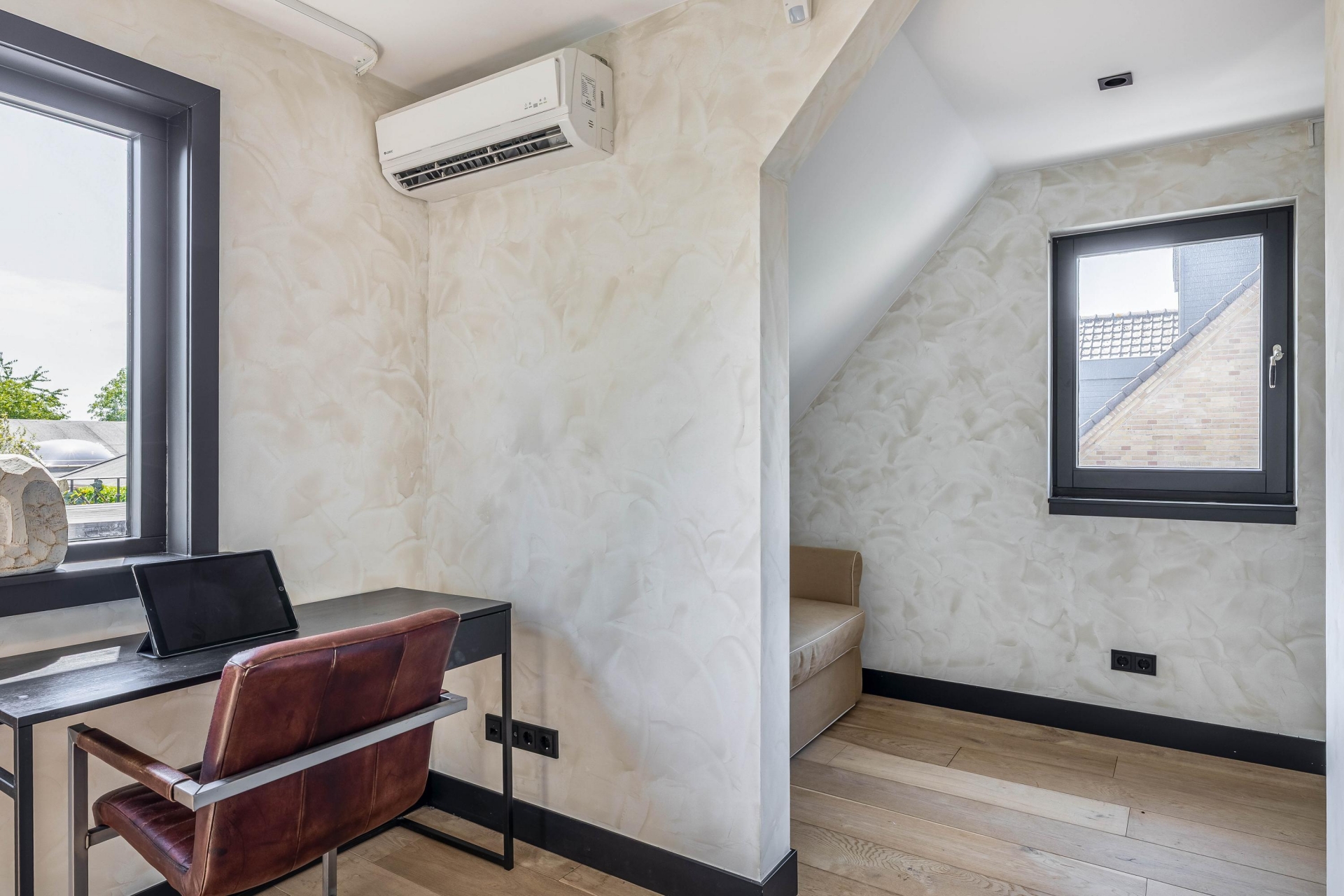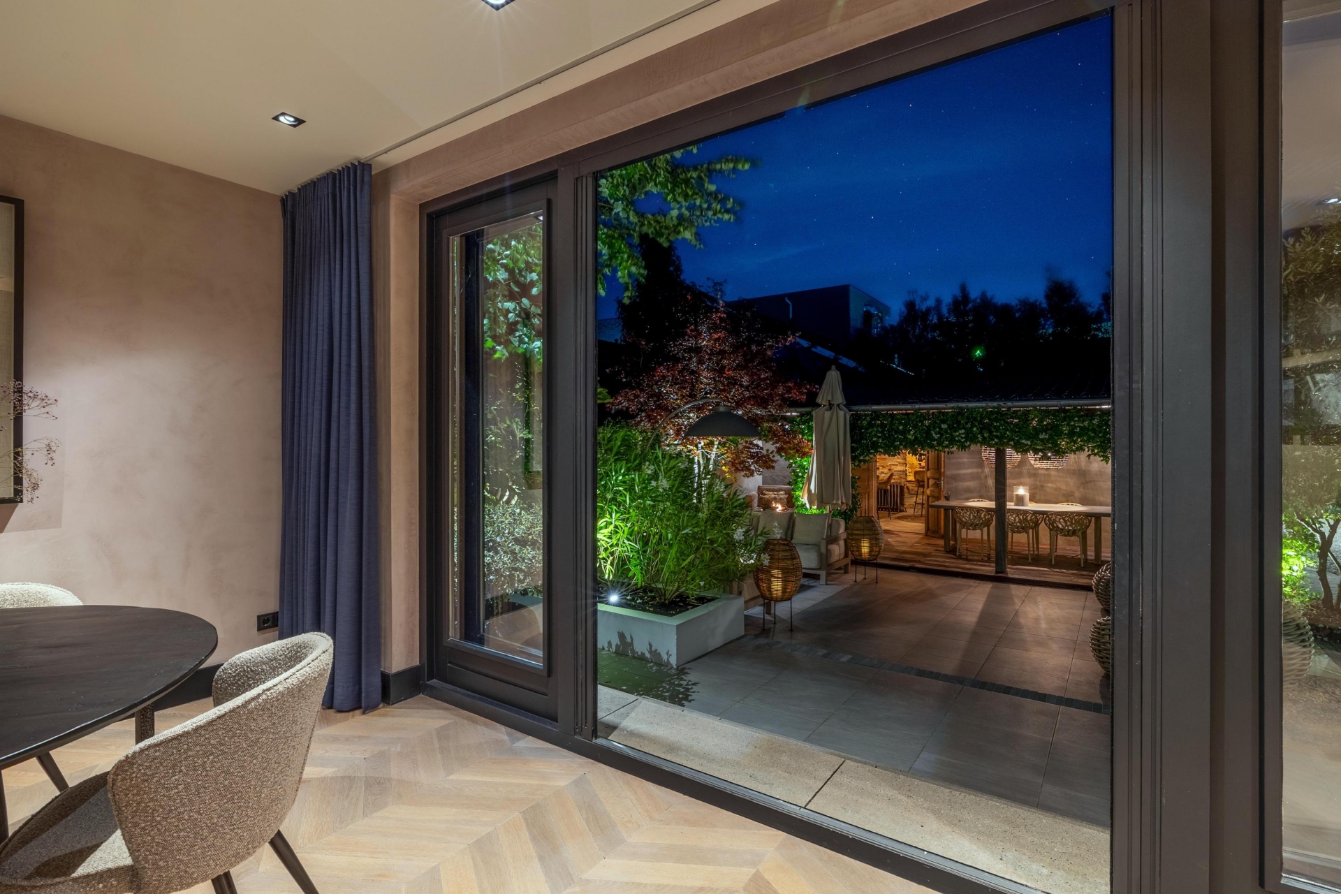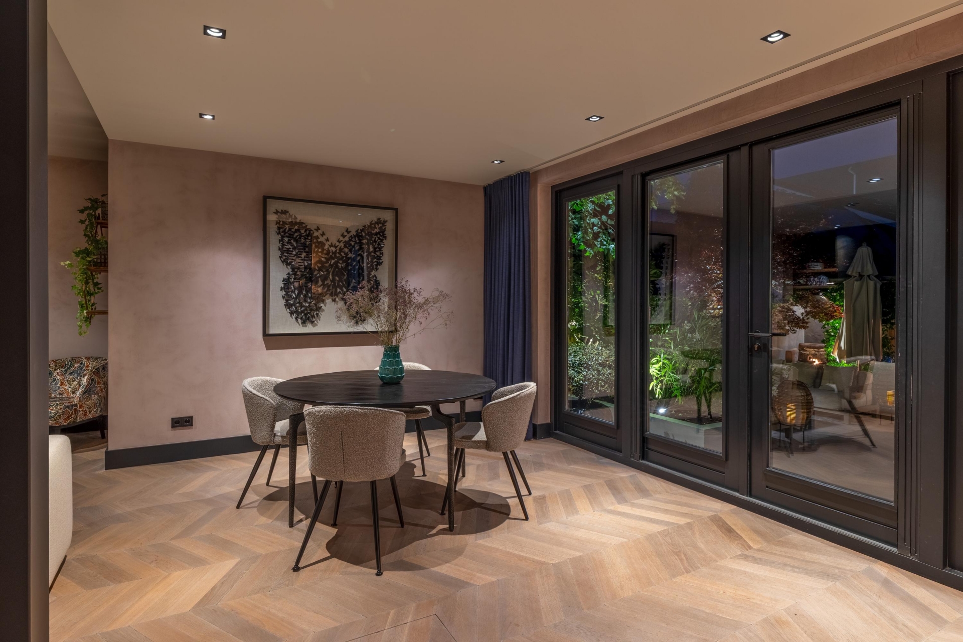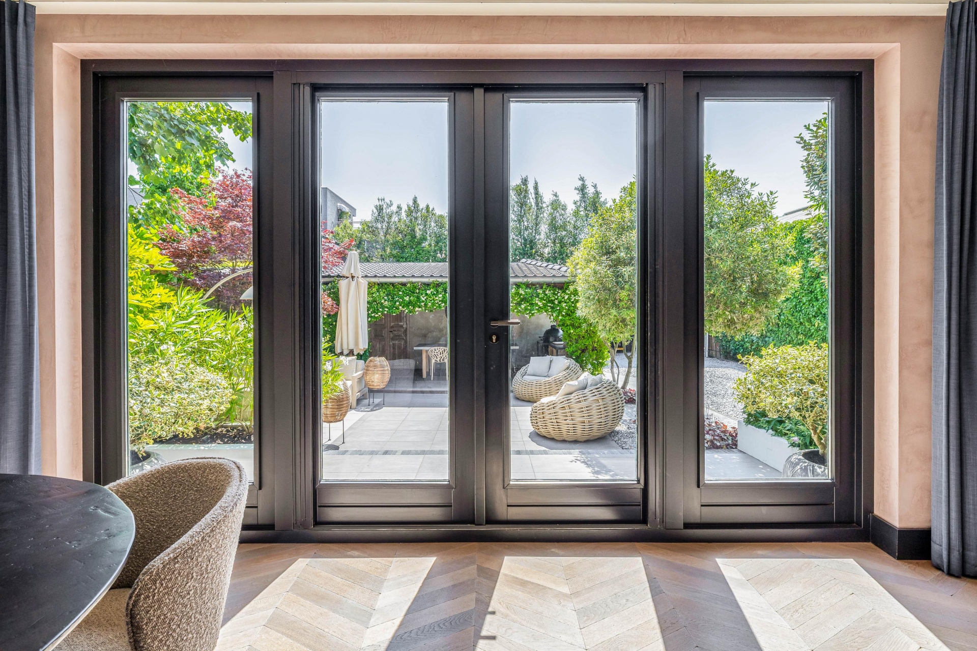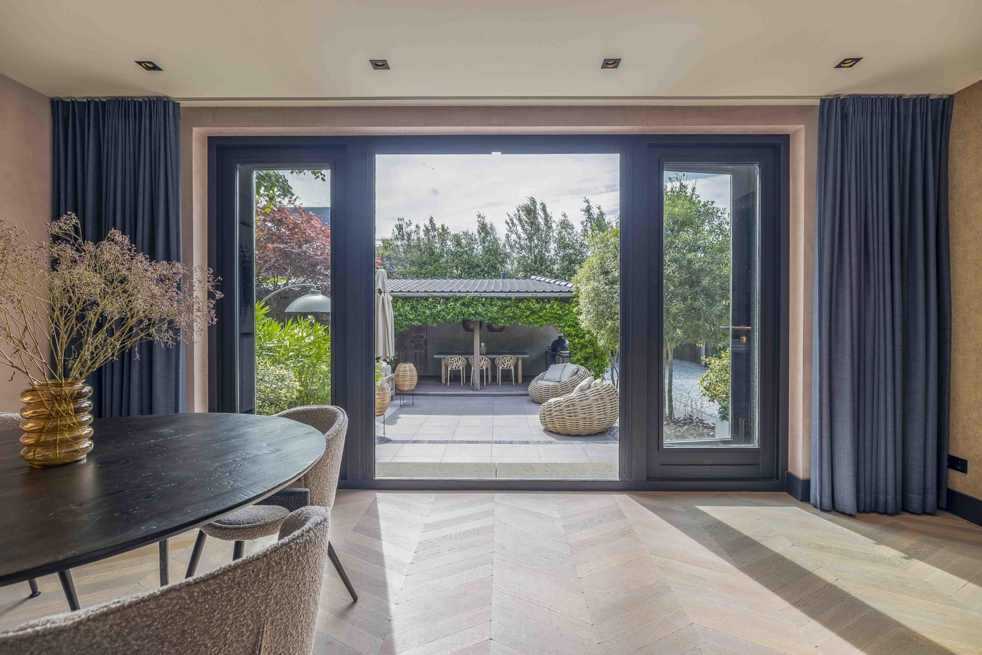 De riante woonkamer ademt rust en klasse dankzij een stijlvolle wandafwerking, een prachtige vloer in Hongaarse punt en openslaande deuren naar de tuin. De grote raampartijen zorgen voor een natuurlijke lichtinval, wat bijdraagt aan de warme, uitnodigende ambiance van het huis.