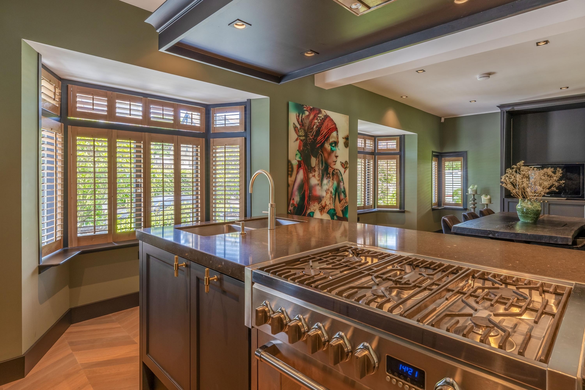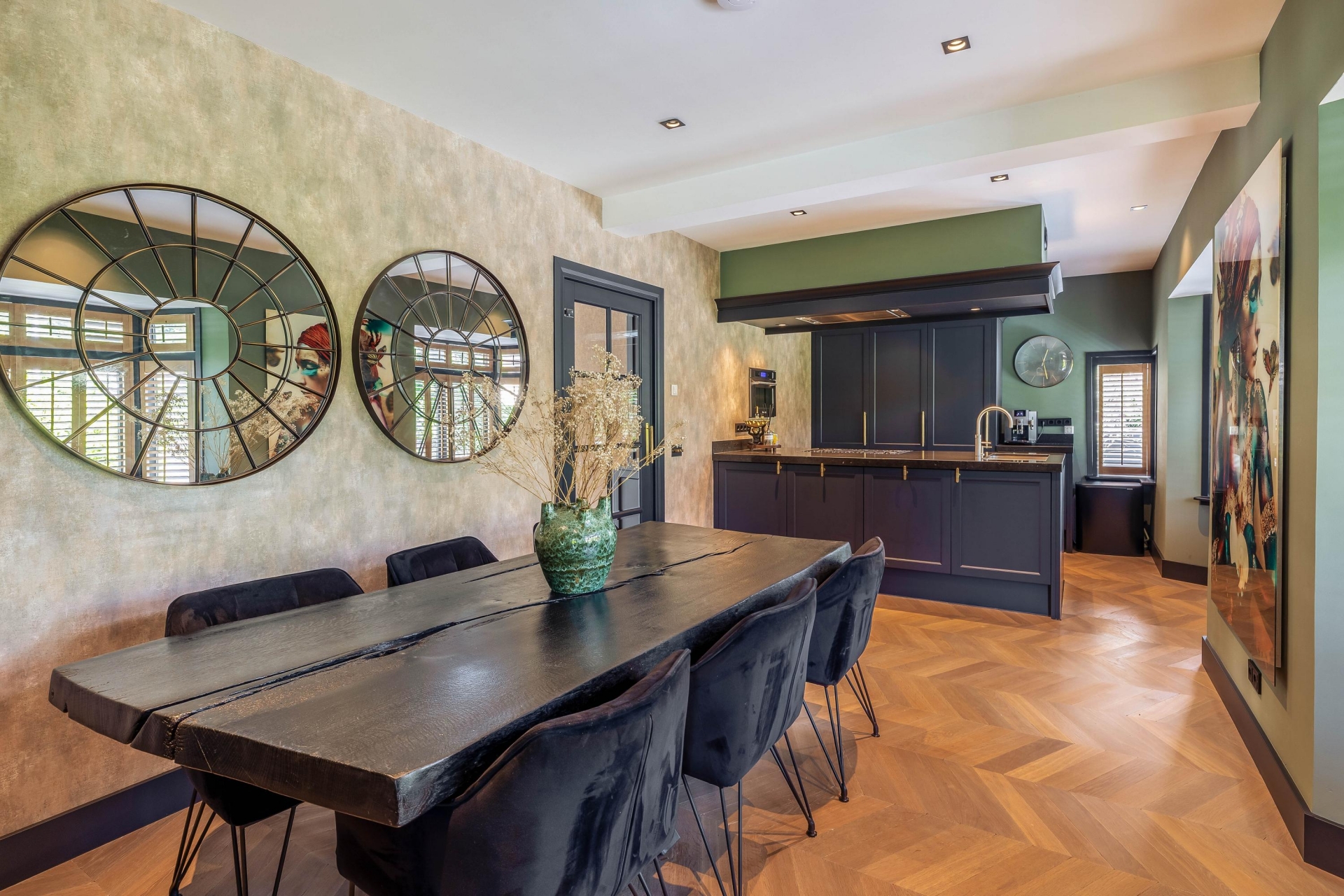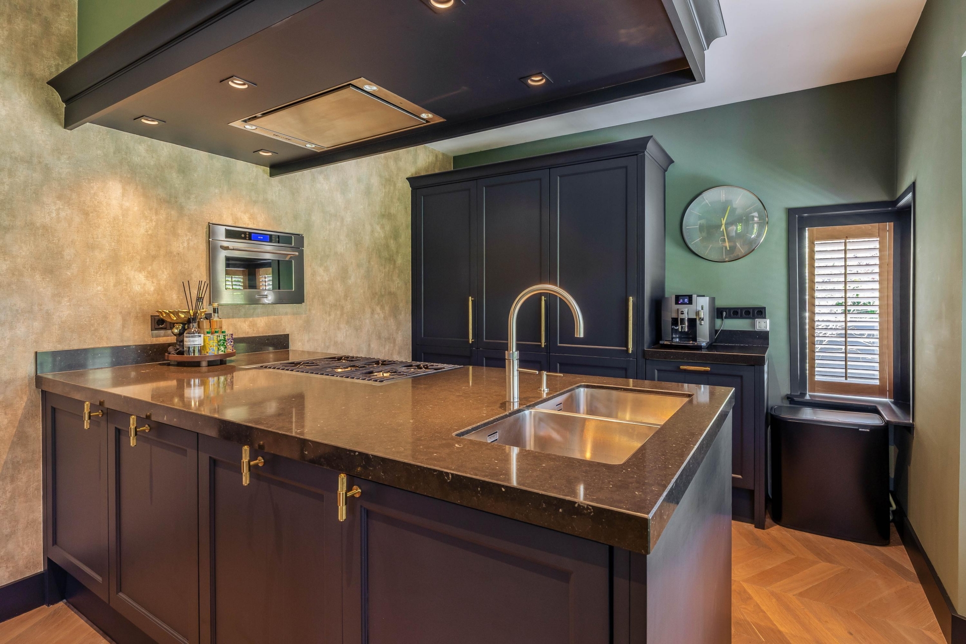 De keuken vormt het kloppend hart van de woning. Hier komen esthetiek en functionaliteit samen in een ruimte die uitnodigt tot koken, tafelen en samenzijn. De combinatie van verfijnde kleurstelling en zorgvuldig gekozen materialen geeft deze keuken een warme, exclusieve uitstraling. Niet alleen is het een volwaardige werkplek voor culinaire creativiteit, maar ook de ideale plek voor lange avonden met vrienden of familie. De open verbinding met de woonkamer onderstreept de samenhang van het interieur.