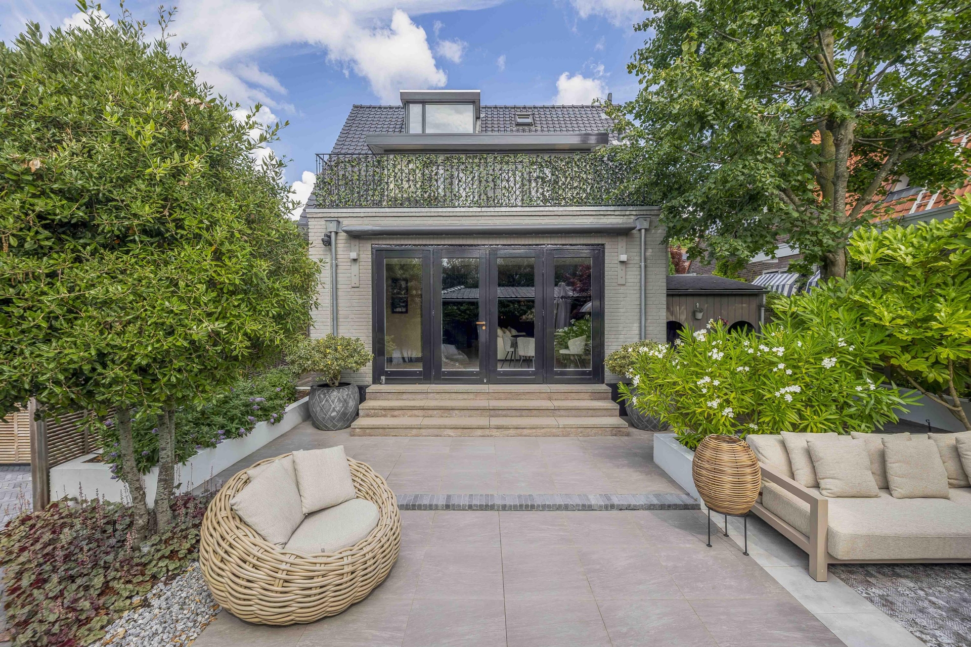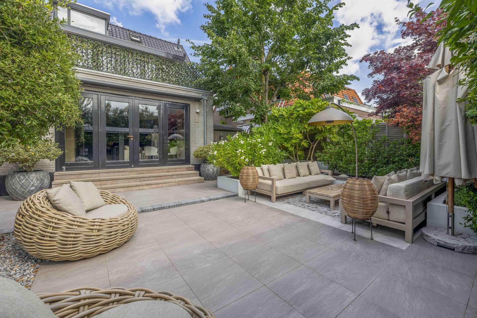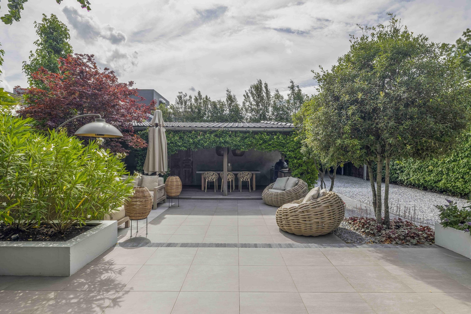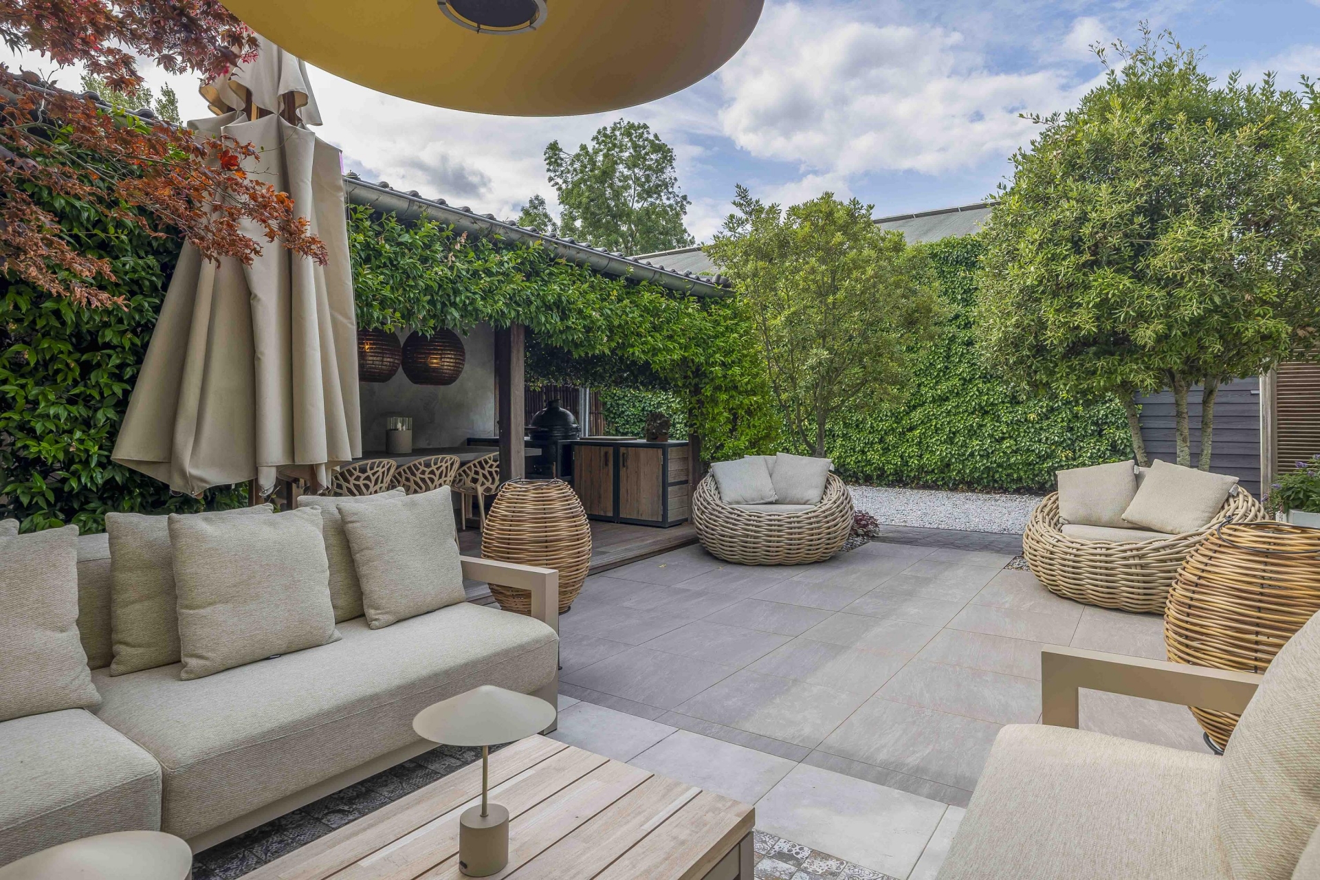 Achterin de tuin bevindt zich een stijlvolle overkapping met buitenkeuken en open haard – perfect voor ontspannen zomeravonden.
