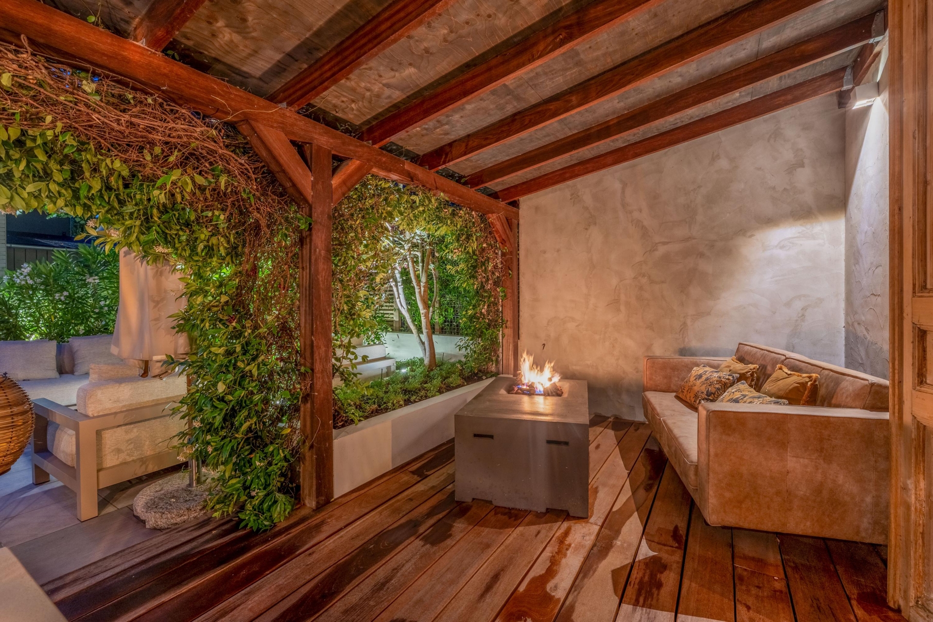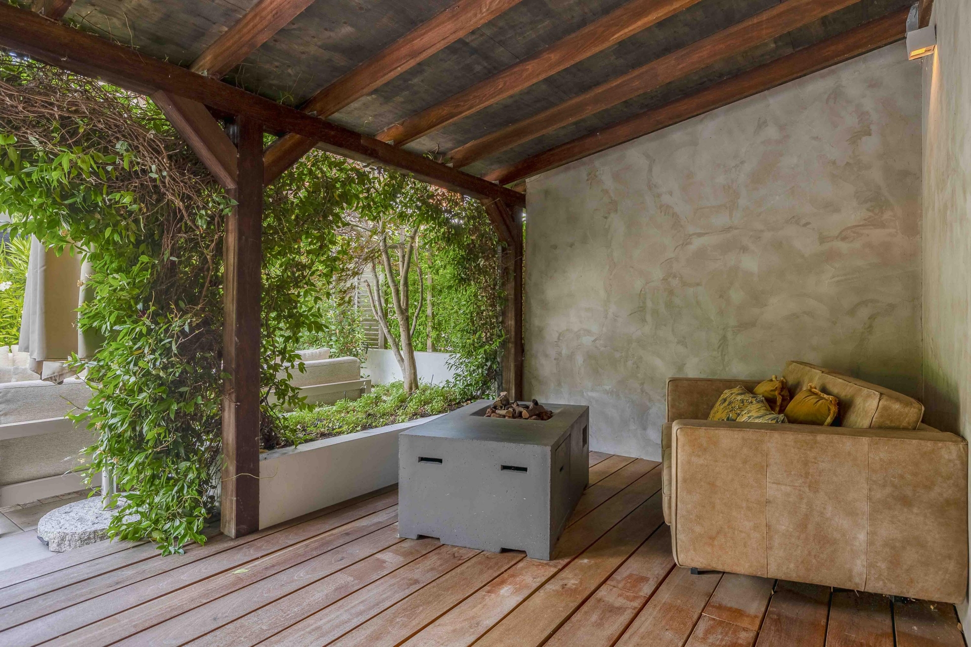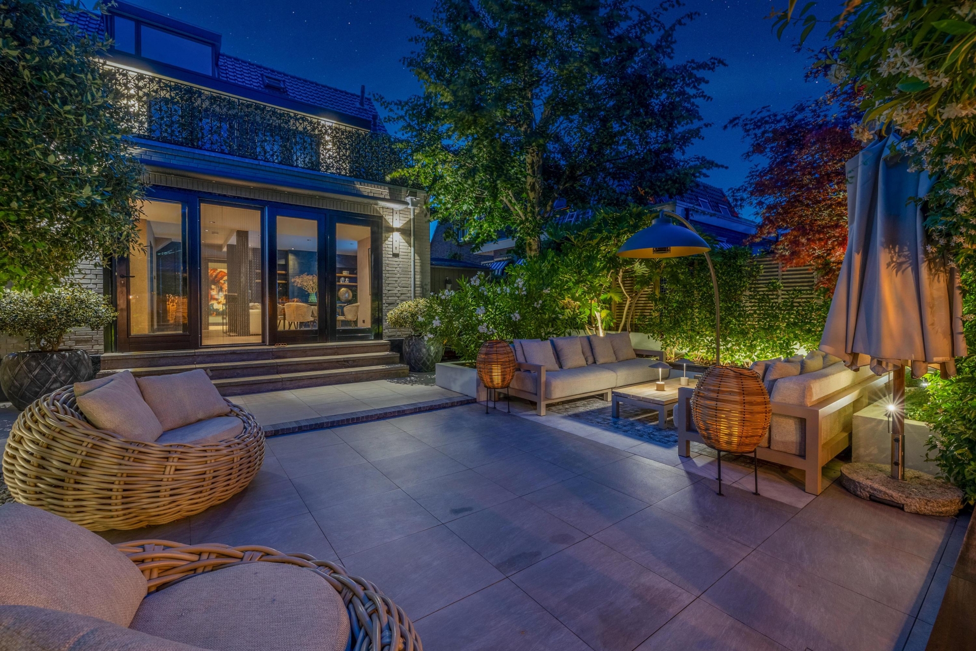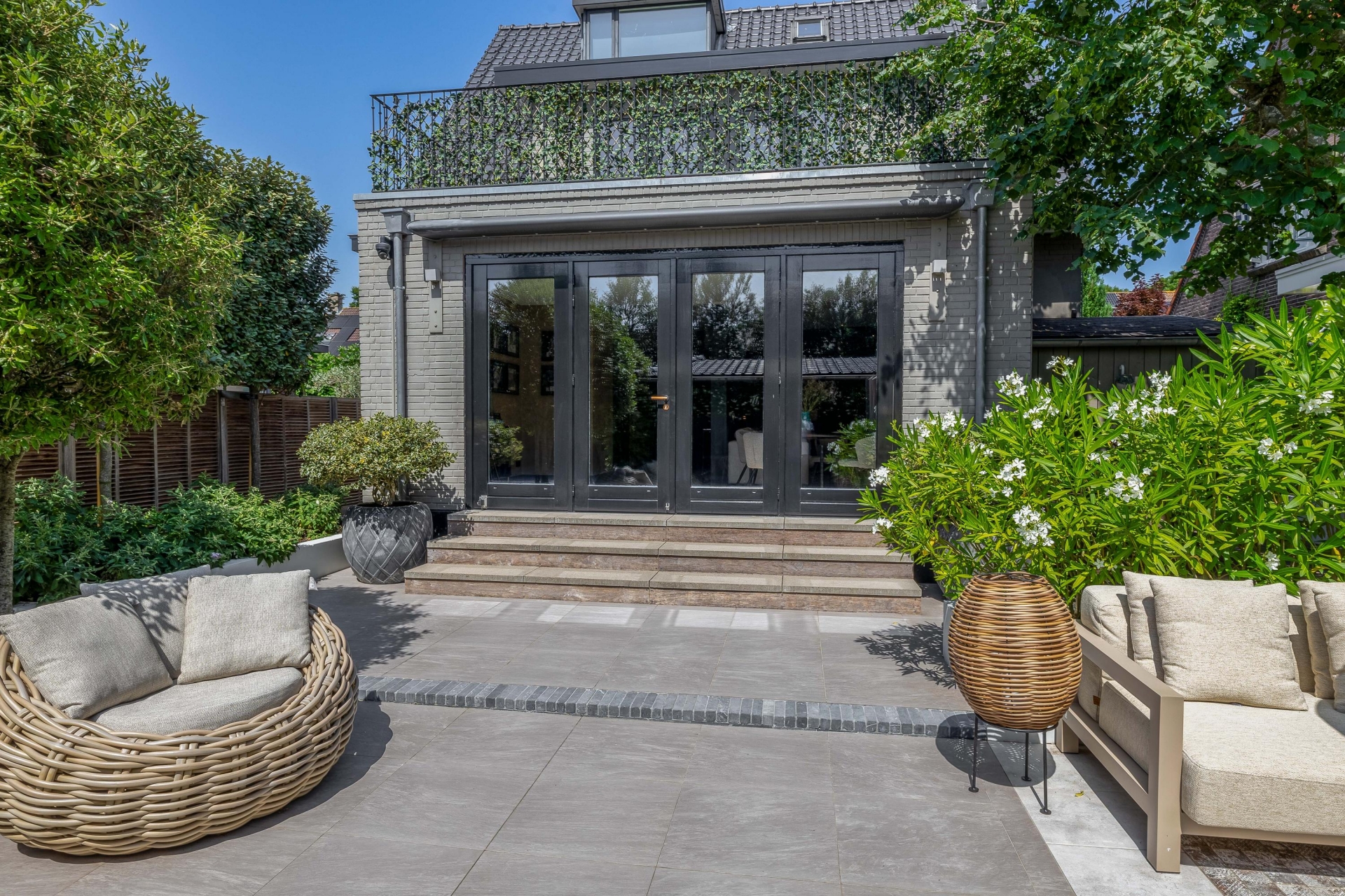 Achterin de tuin bevindt zich een stijlvolle overkapping met buitenkeuken en open haard – perfect voor ontspannen zomeravonden.