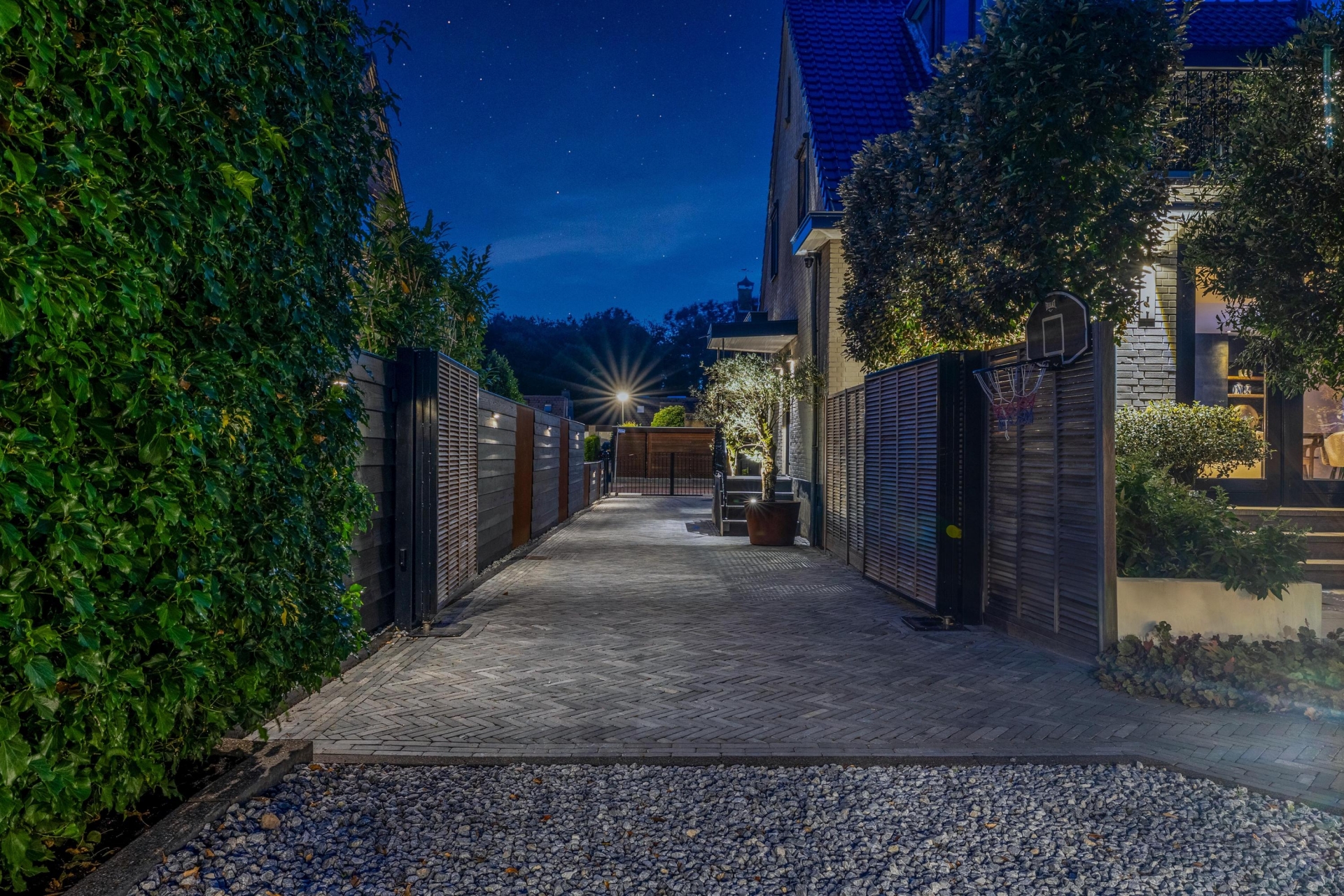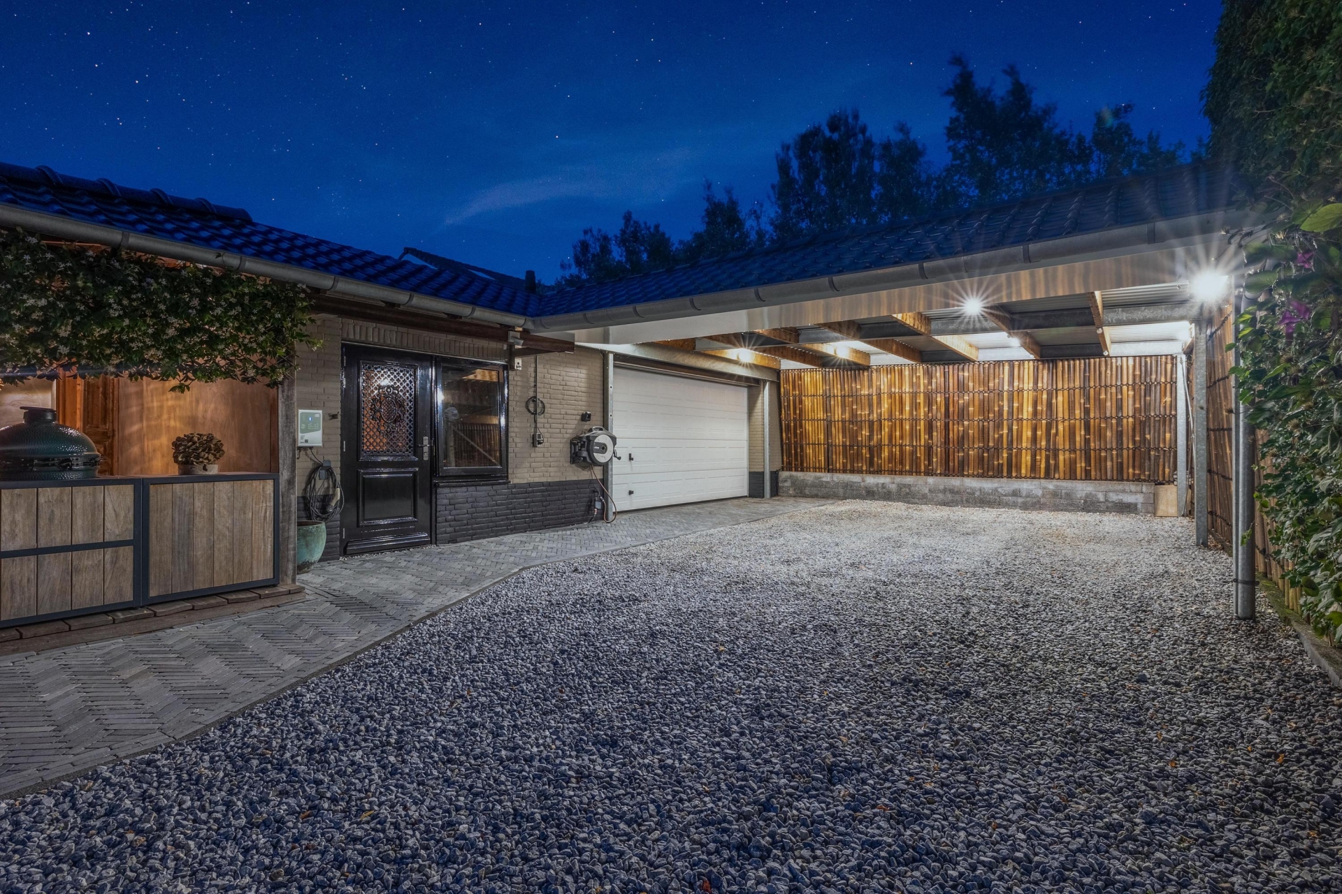 De luxe ervaring wordt doorgetrokken in het bijgebouw, ingericht als comfortabele lounge met bar en eigen toilet. Deze veelzijdige ruimte biedt volop mogelijkheden, zoals een hobbyruimte, thuiskantoor of plek om gasten te ontvangen. De hoogwaardige afwerking sluit perfect aan bij de woning en de tuin. In de royale, verwarmde garage en onder de riante carport is er voldoende ruimte voor meerdere luxe voertuigen. De elektrisch bedienbare toegangspoorten zorgen voor optimale veiligheid.