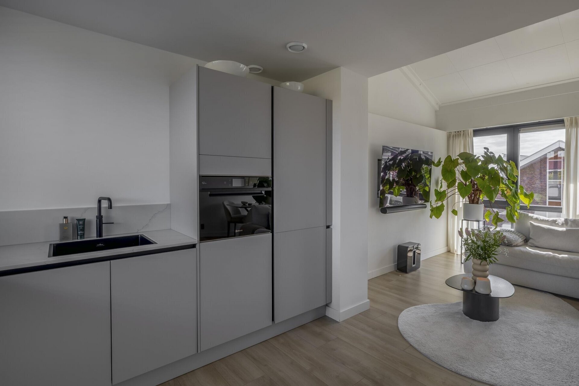 Ruime woonkamer aan de achterzijde van het complex, welke toegang biedt tot het balkon en de open keuken. De open luxe keuken is een ware eyecatcher van de ruimte en is voorzien van alle benodigde inbouwapparatuur. Vanuit de hal zijn nog 2 slaapkamers, een inpandige wasruimte en de badkamer te bereiken. Het luxe afwerkingsniveau wordt in het gastentoilet en de badkamer wederom bevestigd! De badkamer beschikt over een vrijstaand ligbad, douche, toilet en dubbele waskom met meubel. De slaapkamers hebben een oppervlakte van 9 en 16 m². De grootste slaapkamer biedt, net als de woonkamer, toegang tot het balkon. Deze is gesitueerd op het oosten en biedt een fraai zicht over de wijk. Naast het balkon, is aan de galerij nog een buitenruimte om gedurende de middag en avond in de zon te zitten. In de vide van de woonkamer en grootste slaapkamer is een kleine vliering die de woning nog voorziet van extra bergruimte. Verder bevindt zich op de begane grond aan de achterzijde van het complex een ruime berging.