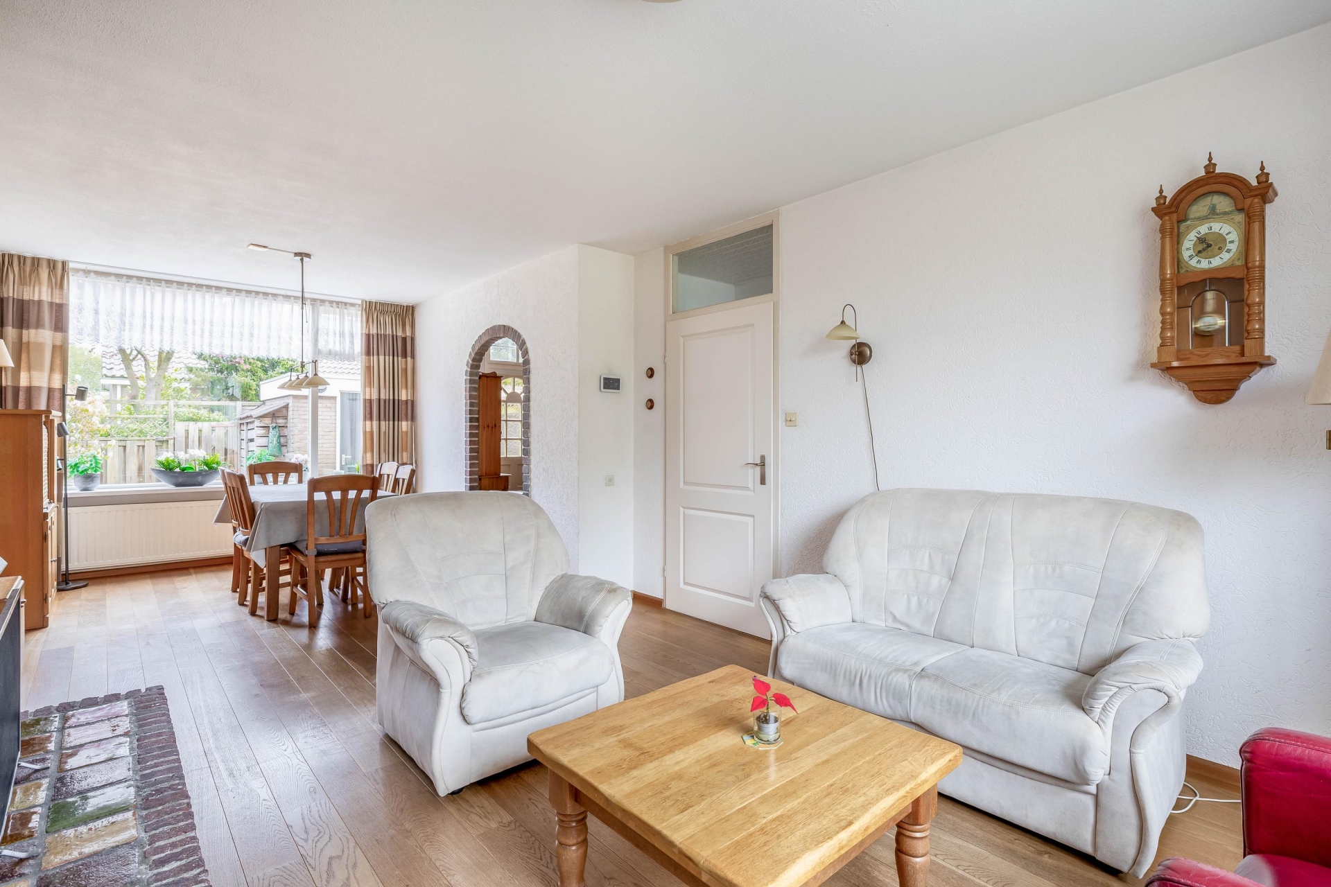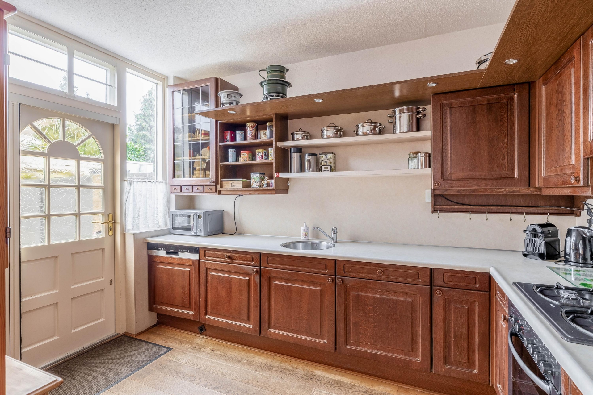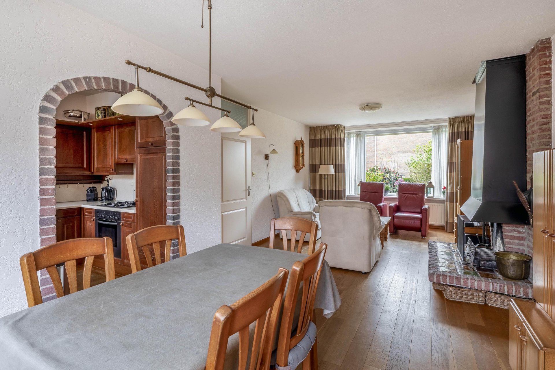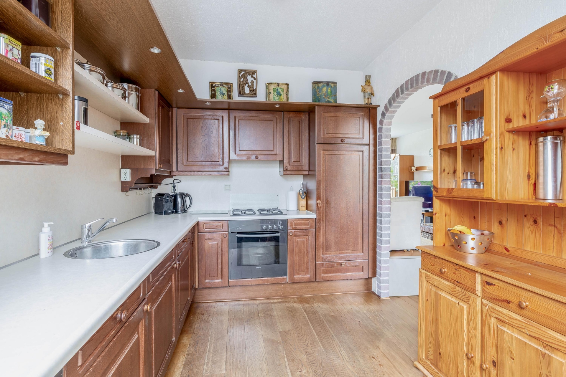 Via de ruime hal met meterkast, toilet (deels licht betegeld met fonteintje) en trapopgang bereikt u de leefruimte. De open keuken bevindt zich aan de achterzijde en is voorzien van diverse inbouwapparatuur en een deur naar de achtertuin.