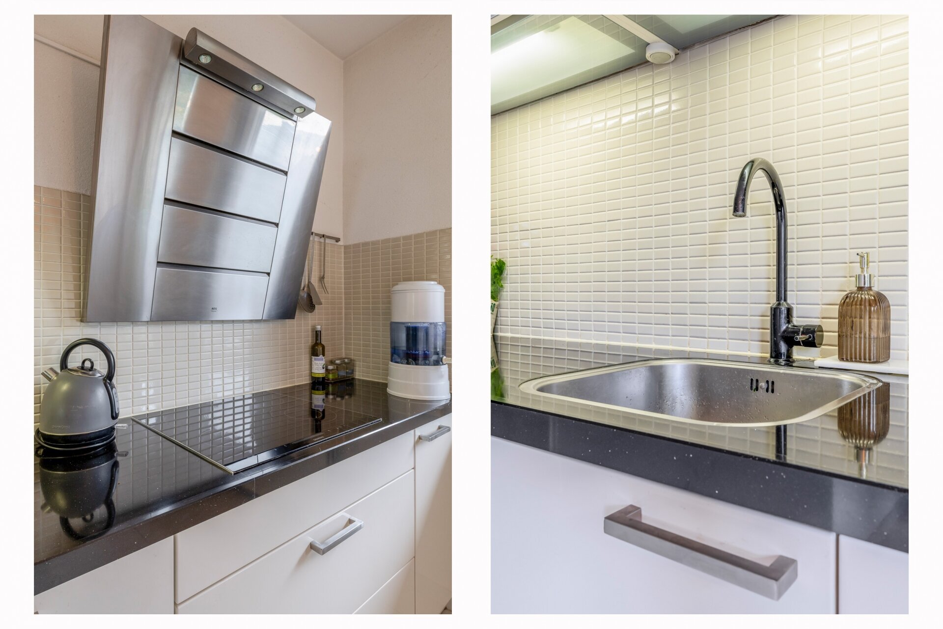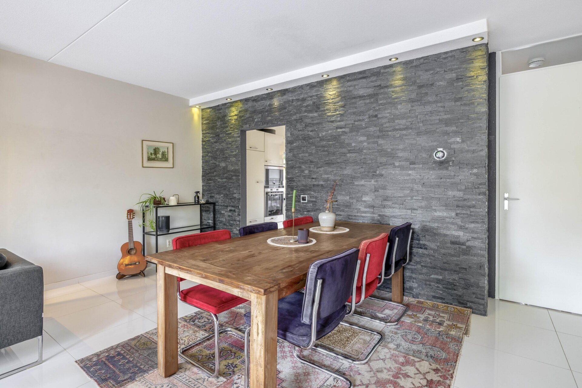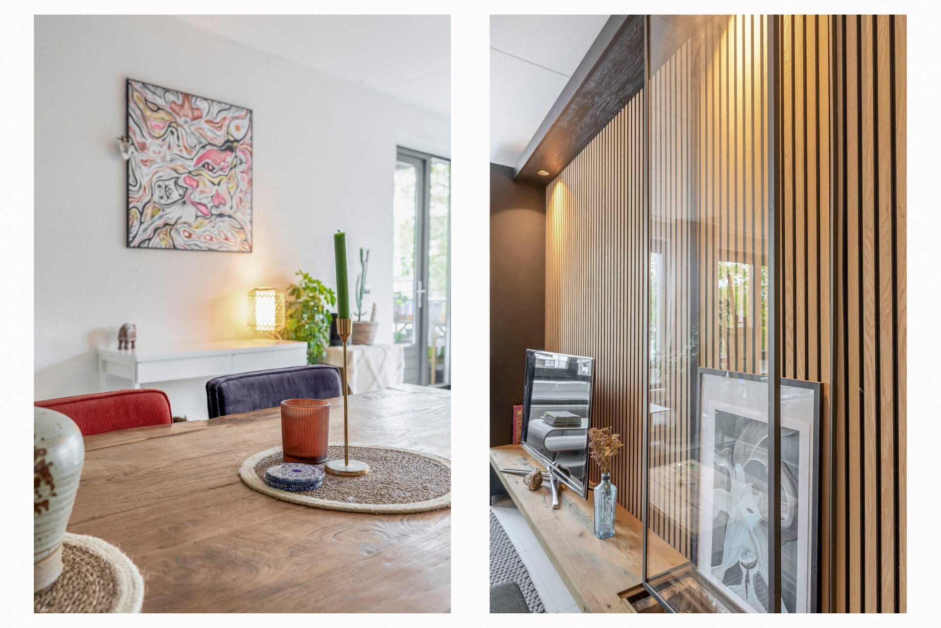 De woonkamer is een echte blikvanger. Grote raampartijen zorgen voor een overvloed aan daglicht, terwijl de woodup panelen direct warmte en sfeer brengen. De strakke plavuizen versterken de moderne uitstraling. De keuken sluit daar naadloos op aan: compleet met inbouwapparatuur en een praktische ontbijtbar waar je gezellig kunt aanschuiven.