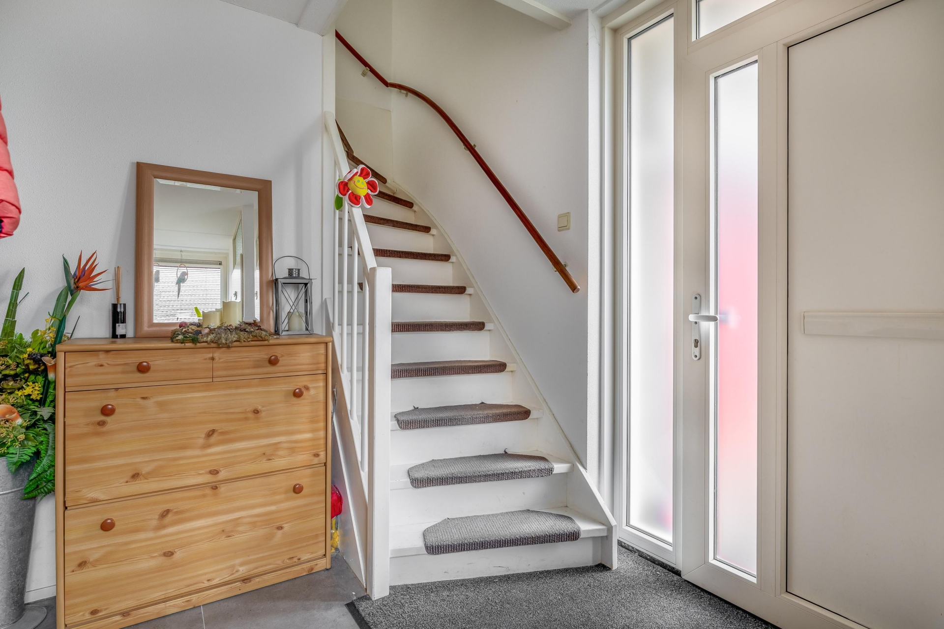 De voortuin is netjes aangelegd en biedt ruimte om te parkeren op eigen terrein. Dat maakt het dagelijkse gemak compleet.