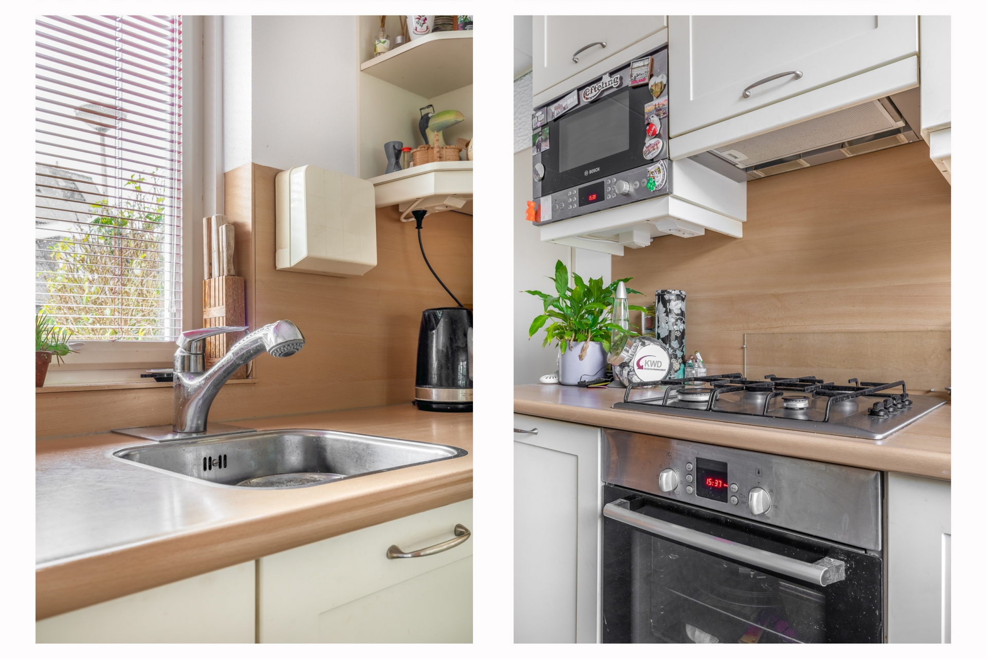 De keuken aan de voorzijde is praktisch ingericht en biedt veel werk- en opbergruimte. Hier kun je makkelijk met meerdere mensen tegelijk koken. De directe verbinding met de woonkamer en de ligging aan de straatzijde maken het een gezellige, levendige plek in huis.
