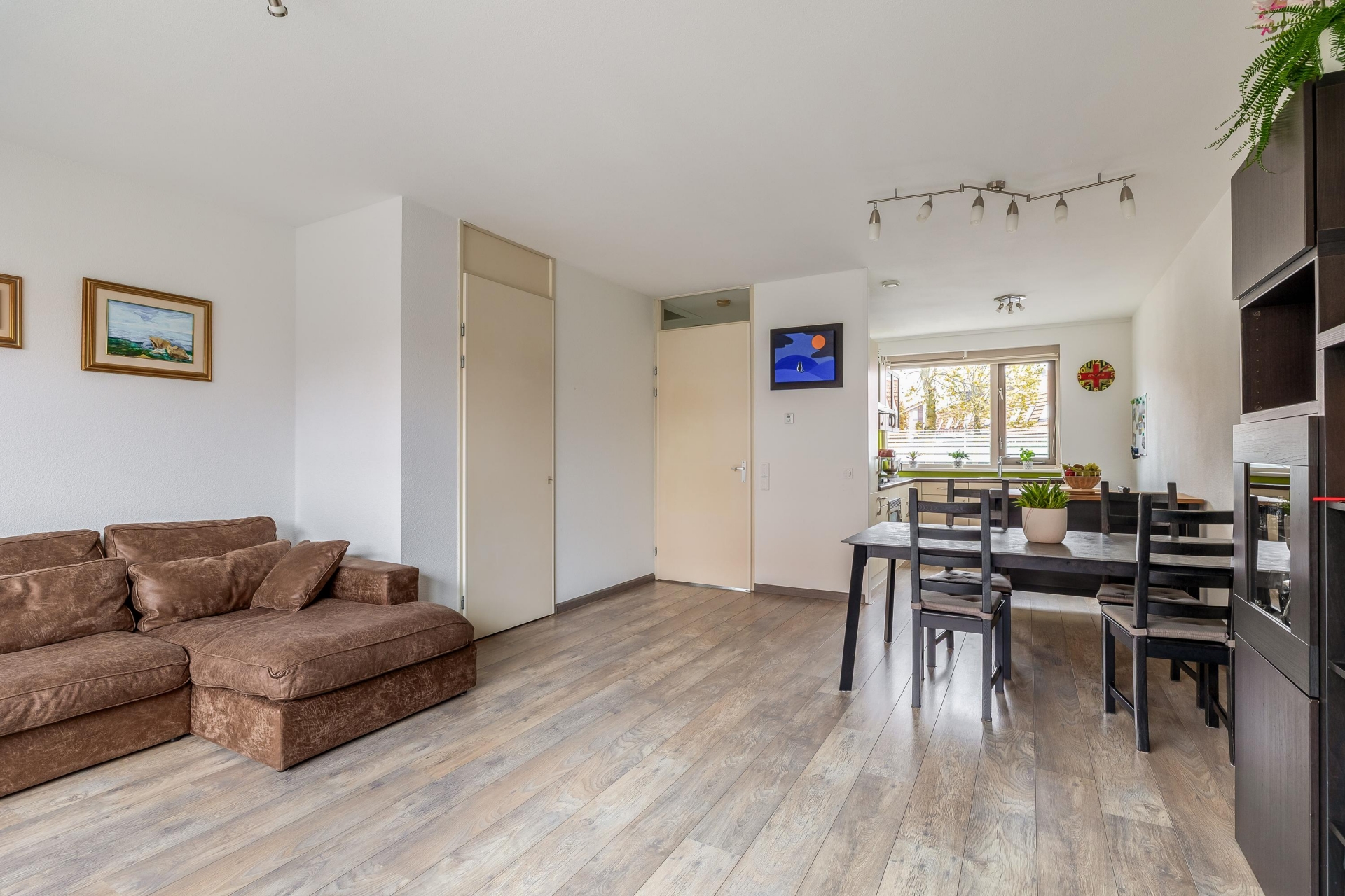 Via de entree met hal, meterkast en toilet met fonteintje betreedt u de lichte woonkamer. De woonkamer biedt volop ruimte voor een comfortabele zithoek en een eethoek en heeft directe toegang tot de zonnige achtertuin.