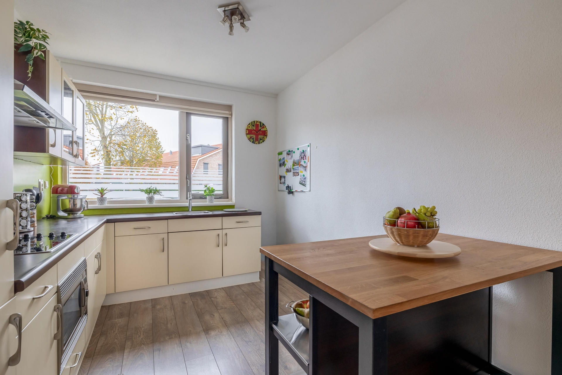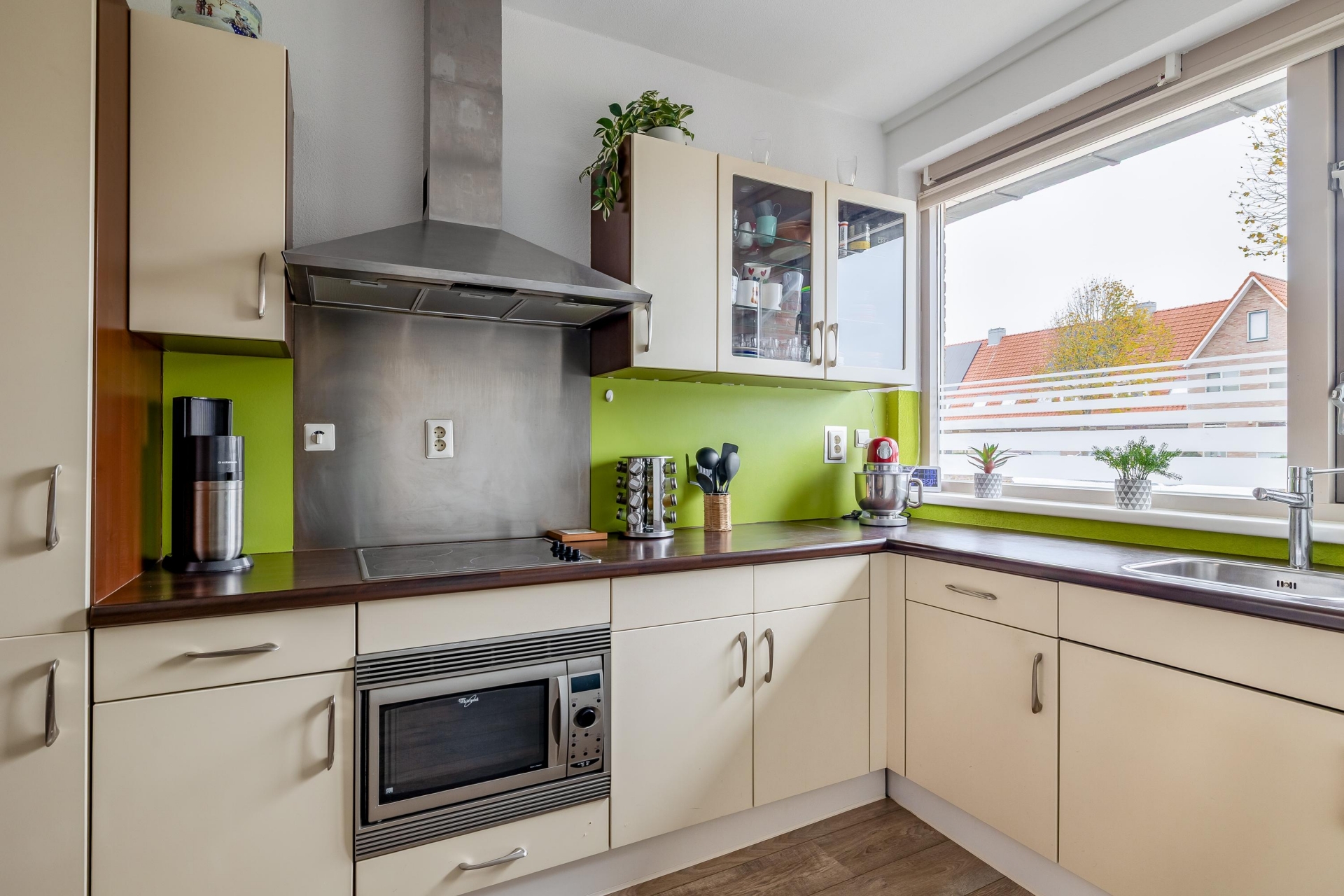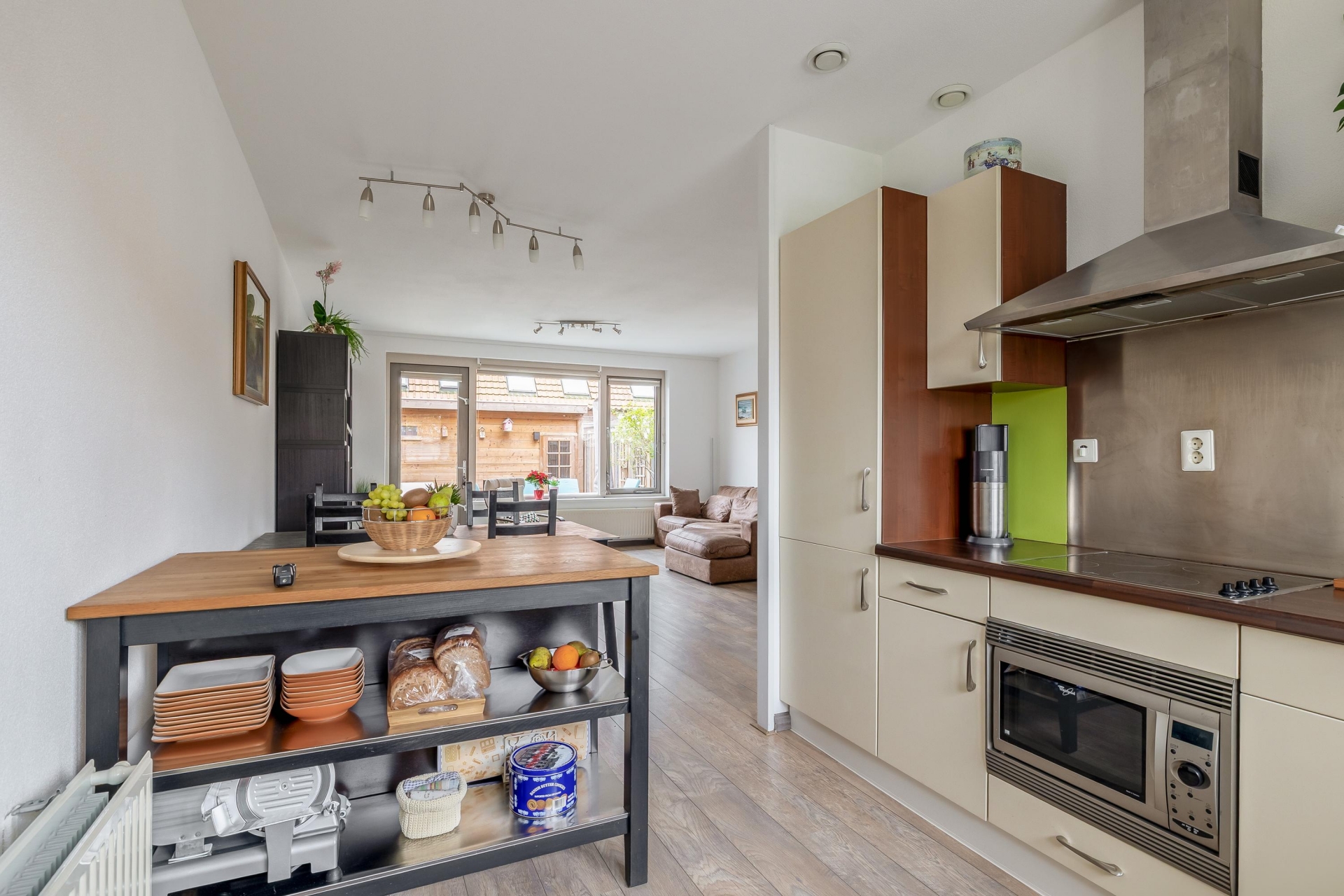 Aan de voorzijde van de woning bevindt zich de open keuken, uitgevoerd in een verzorgde en functionele opstelling uit het bouwjaar van de woning en netjes onderhouden.