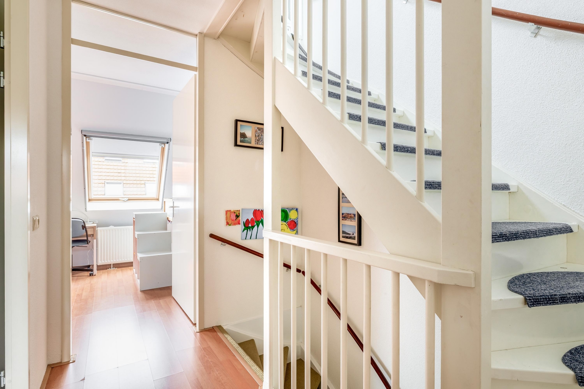 Via de vaste trap bereikt u de tweede verdieping. Op de overloop met dakvenster bevinden zich de technische installaties, waaronder de CV-combiketel en de aansluitingen voor de wasmachine en droger.