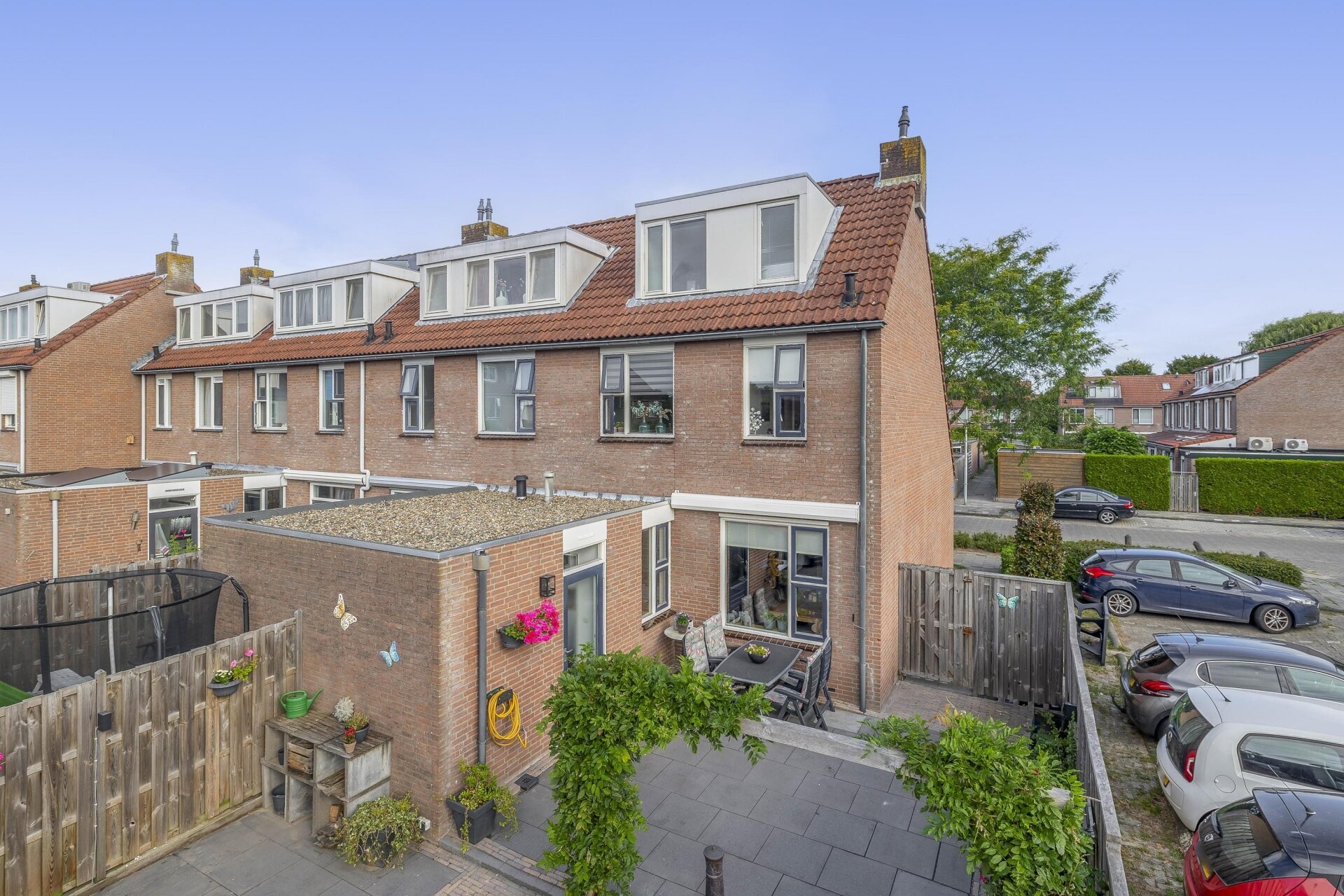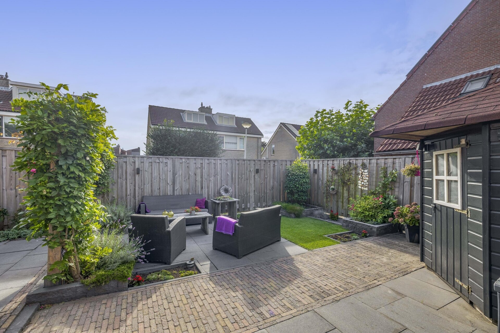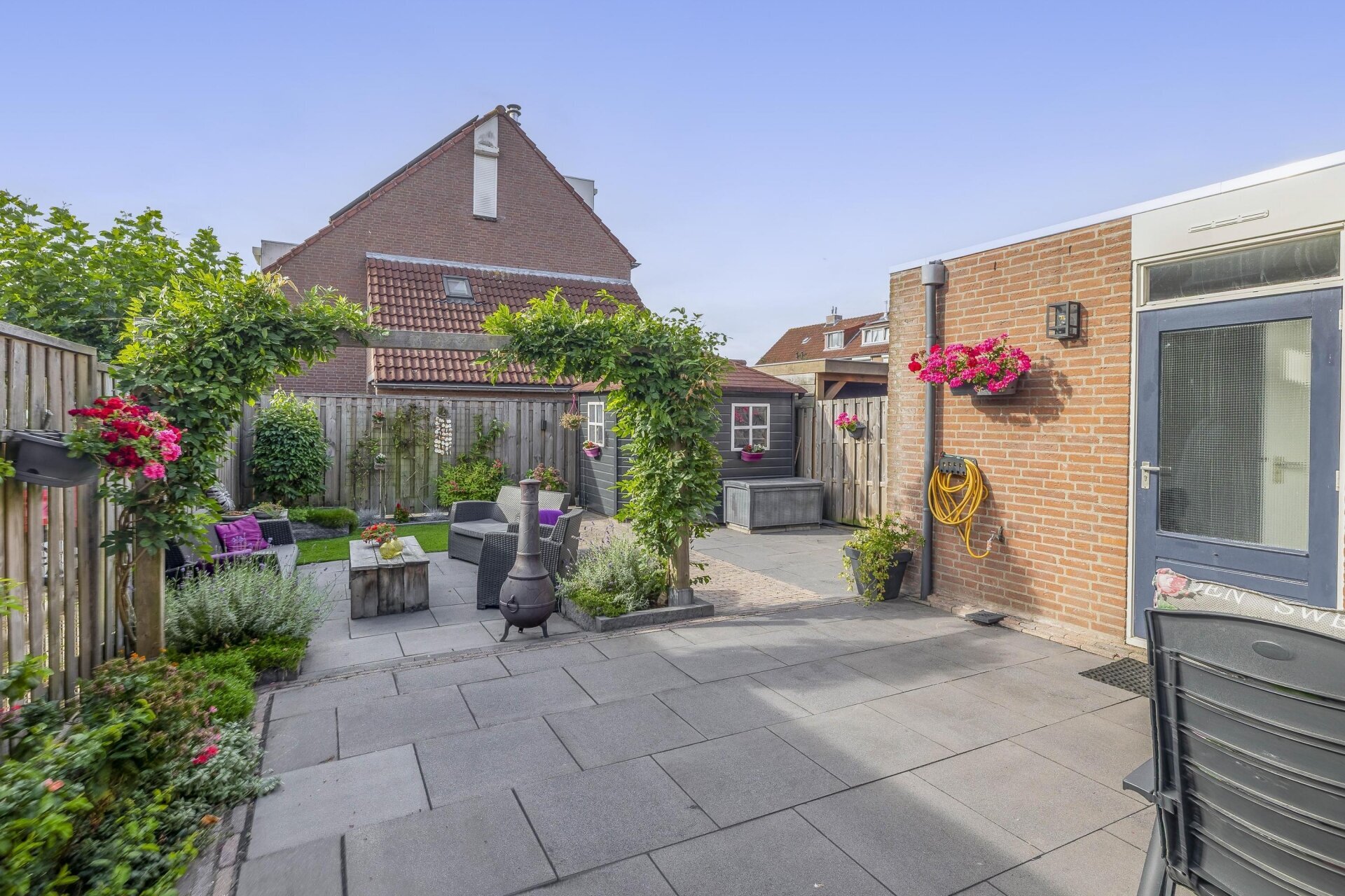 Stap je via de achterdeur naar buiten, dan sta je meteen in een heerlijke tuin op het zuiden. De tuin is met zorg ingericht: mooie bestrating, borders met beplanting, een groot terras én een vrijstaande houten berging maken dit tot een plek waar je ’s zomers het liefst de hele dag doorbrengt. Dankzij de ligging op het zuiden zit je hier al snel in de zon. Met genoeg ruimte voor een loungeset, barbecue en speelhoek is dit een tuin die past bij het gezinsleven én bij lekker buiten leven.