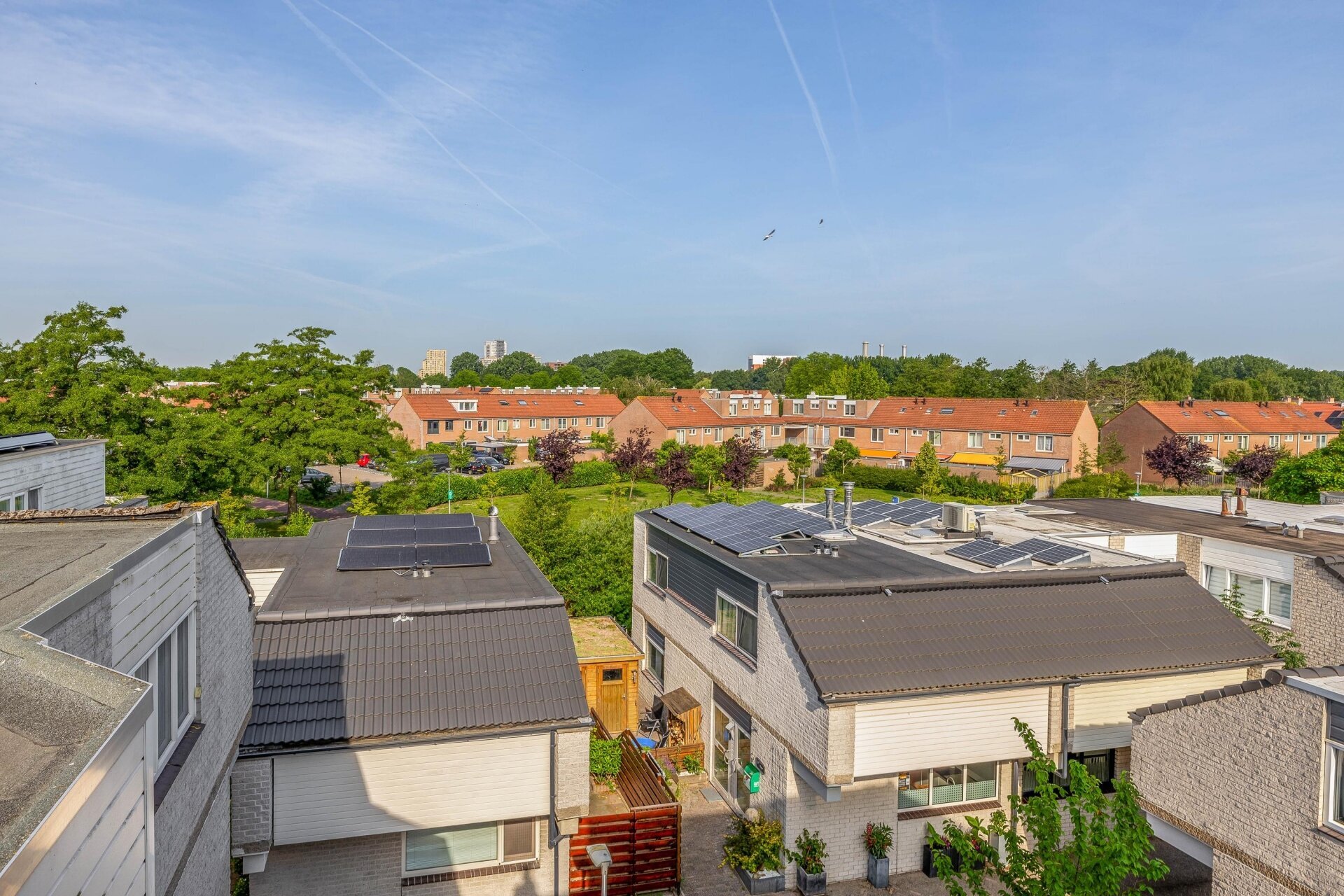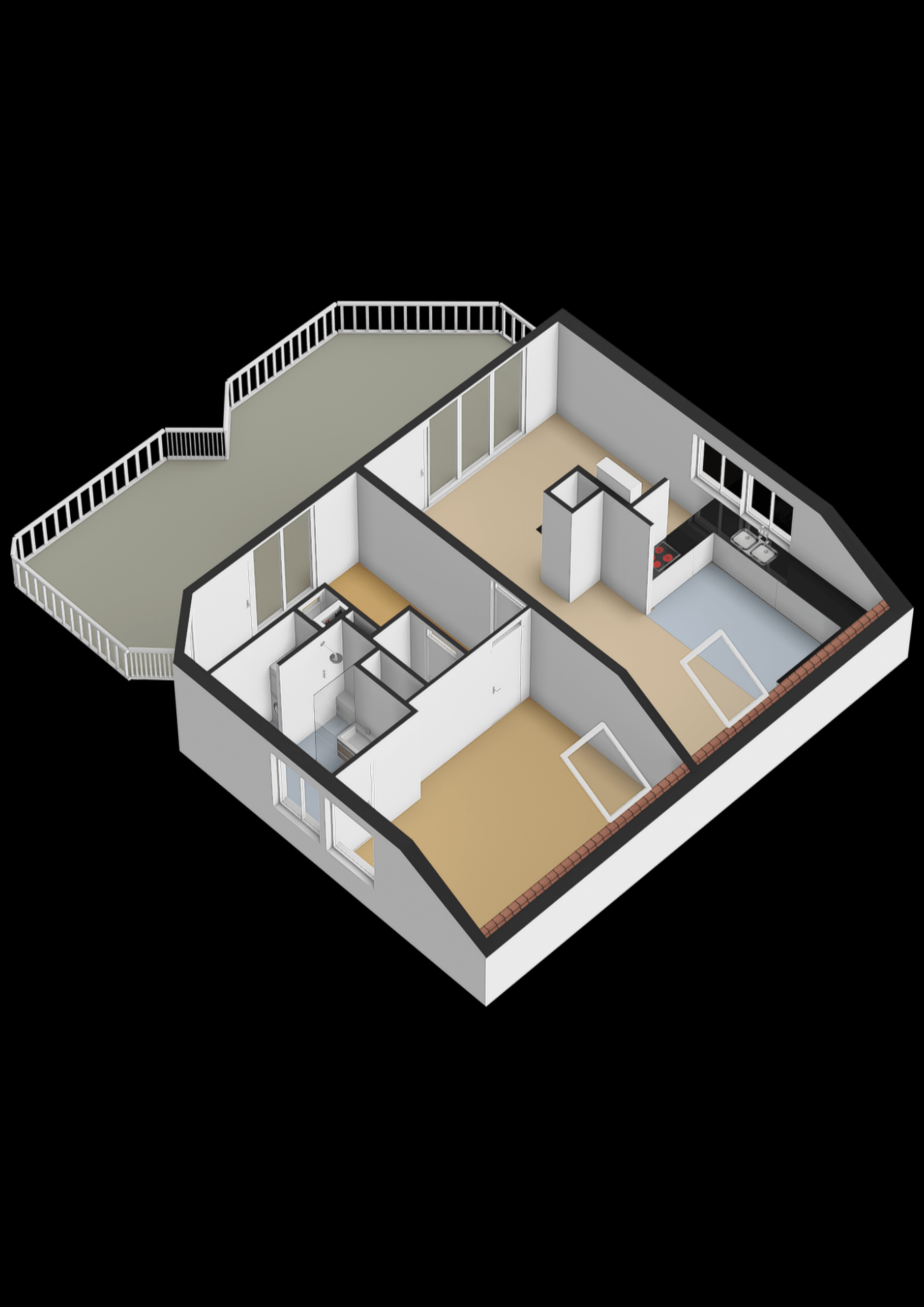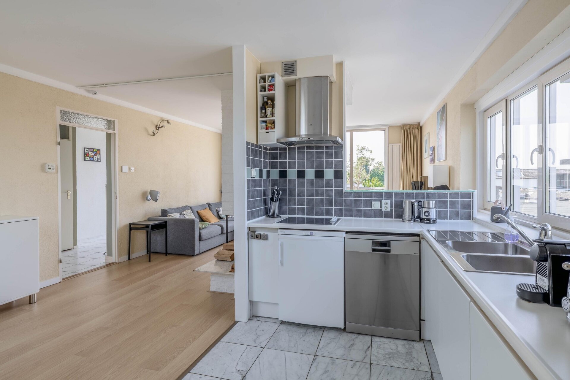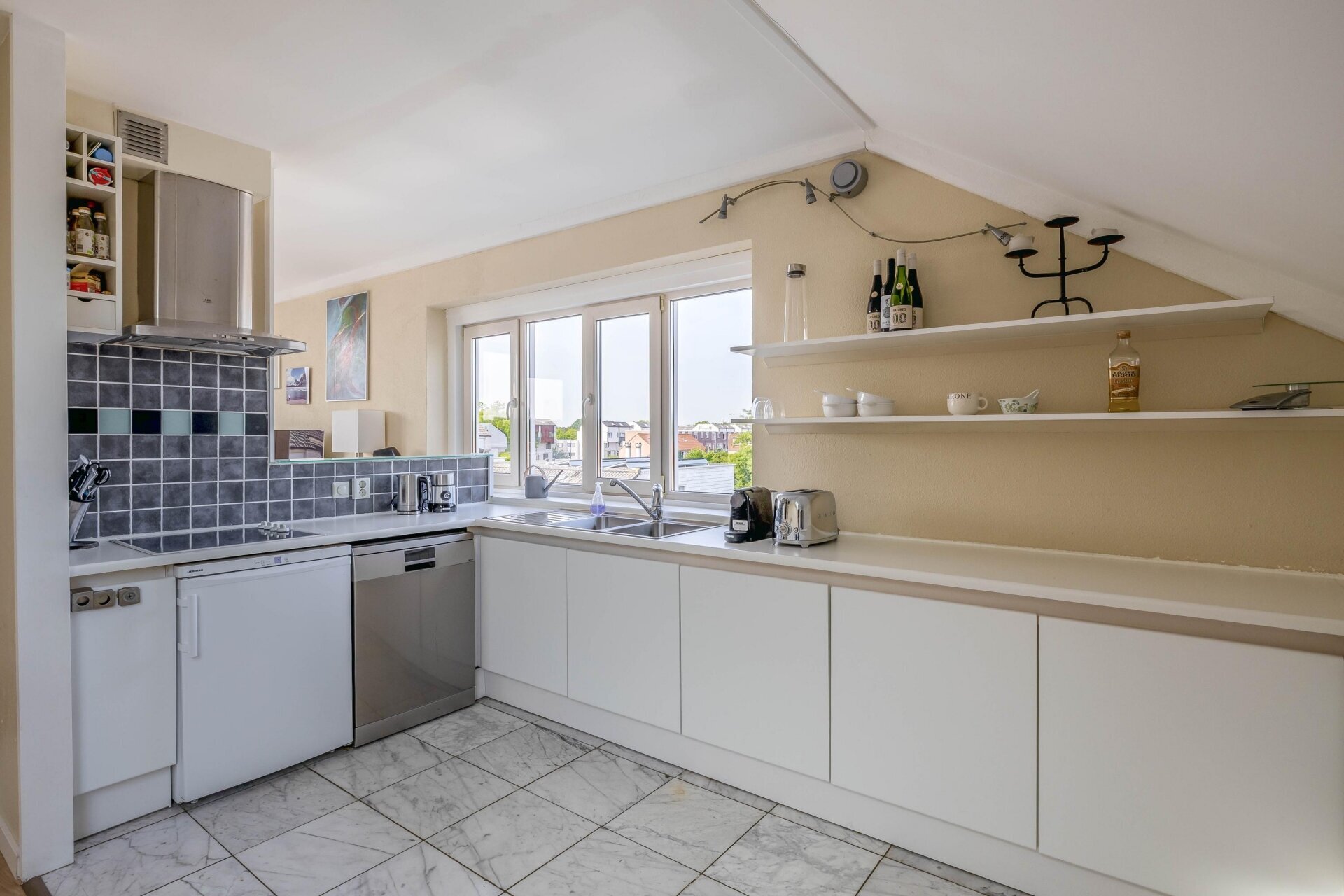 Entree, zeer ruime hal met toegang tot het dakterras, meterkast, het toilet, de slaapkamer en de woonkamer. De lichte woonkeuken is gelegen aan de voorzijde van het complex en vormt samen met de woonkamer een open en gezellige leefruimte. De keuken is voorzien van diverse losstaande apparatuur, waaronder een vaatwasser, een koel-vriescombinatie en een combimagnetron. De woonkamer beschikt over een sfeervolle, werkende open haard en biedt middels een loopdeur toegang tot het dakterras. Dit terras is een ware eyecatcher van het appartement! Door de zonnige ligging op het zuiden kan er optimaal genoten worden van de zon. Vanaf hier is er een fraai wijds uitzicht over de wijk. Op het dakterras bevindt zich bovendien een praktische berging, die in het gebouw is geïntegreerd.