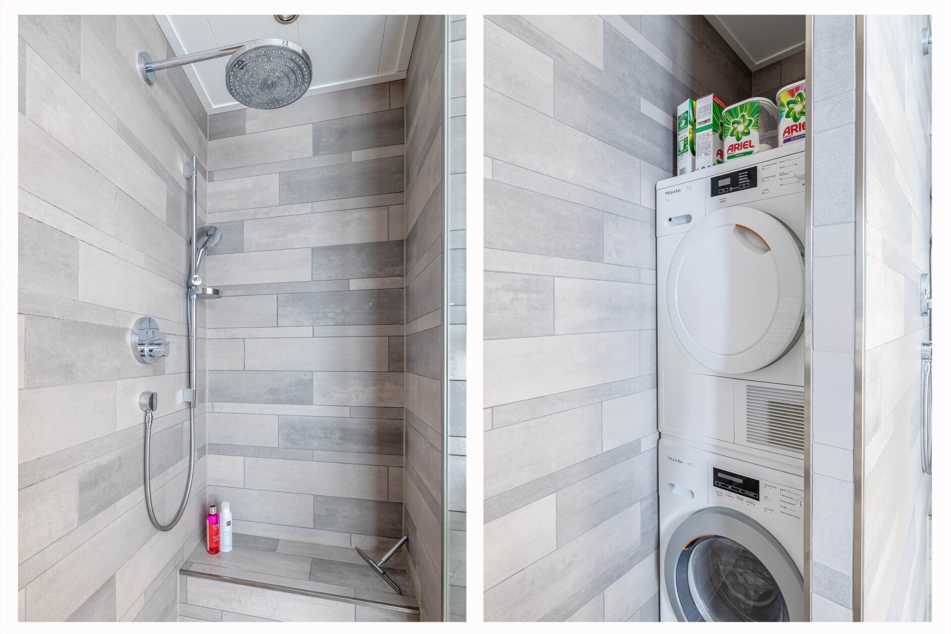 Vanuit de slaapkamer is de badkamer toegankelijk, welke in 2017 compleet vernieuwd is. De badkamer beschikt over een ruime inloopdouche, dubbele wastafel met meubel comfortabele vloerverwarming en een aansluiting met ruimte voor een wasmachine en droger, die onopvallend zijn geplaatst achter een muurtje, uit het directe zicht.
