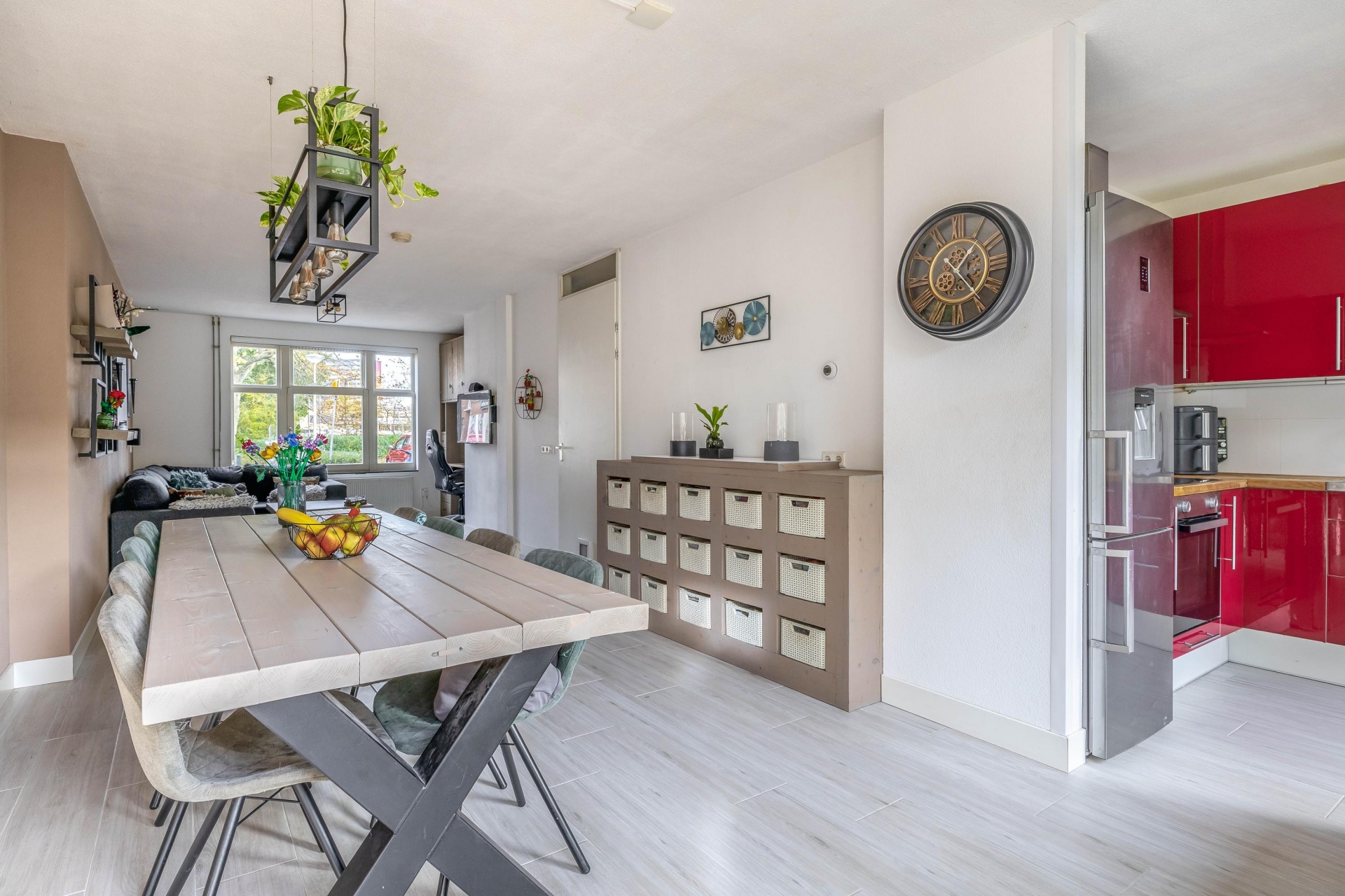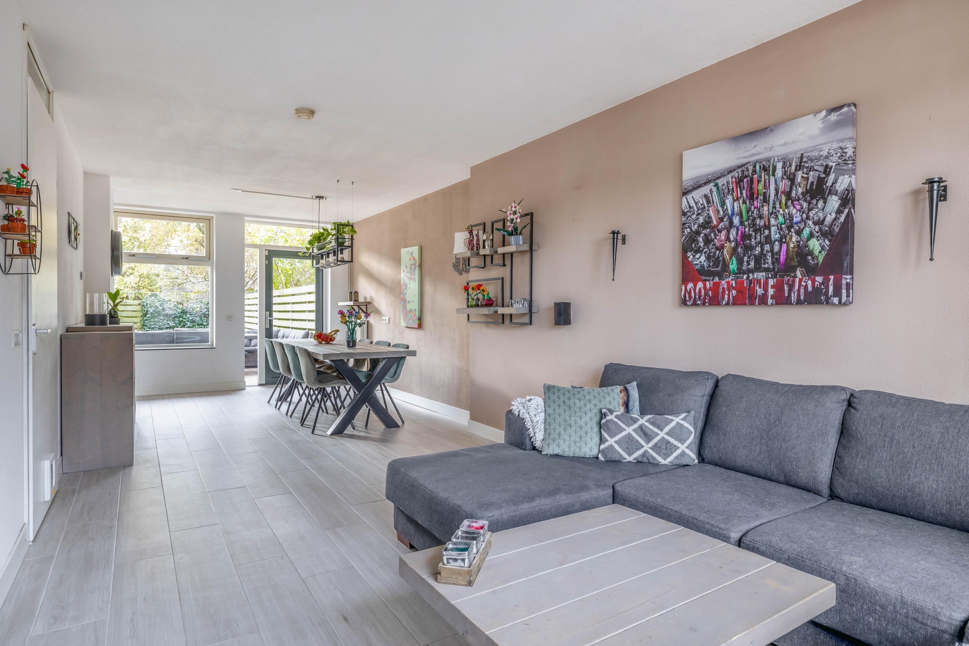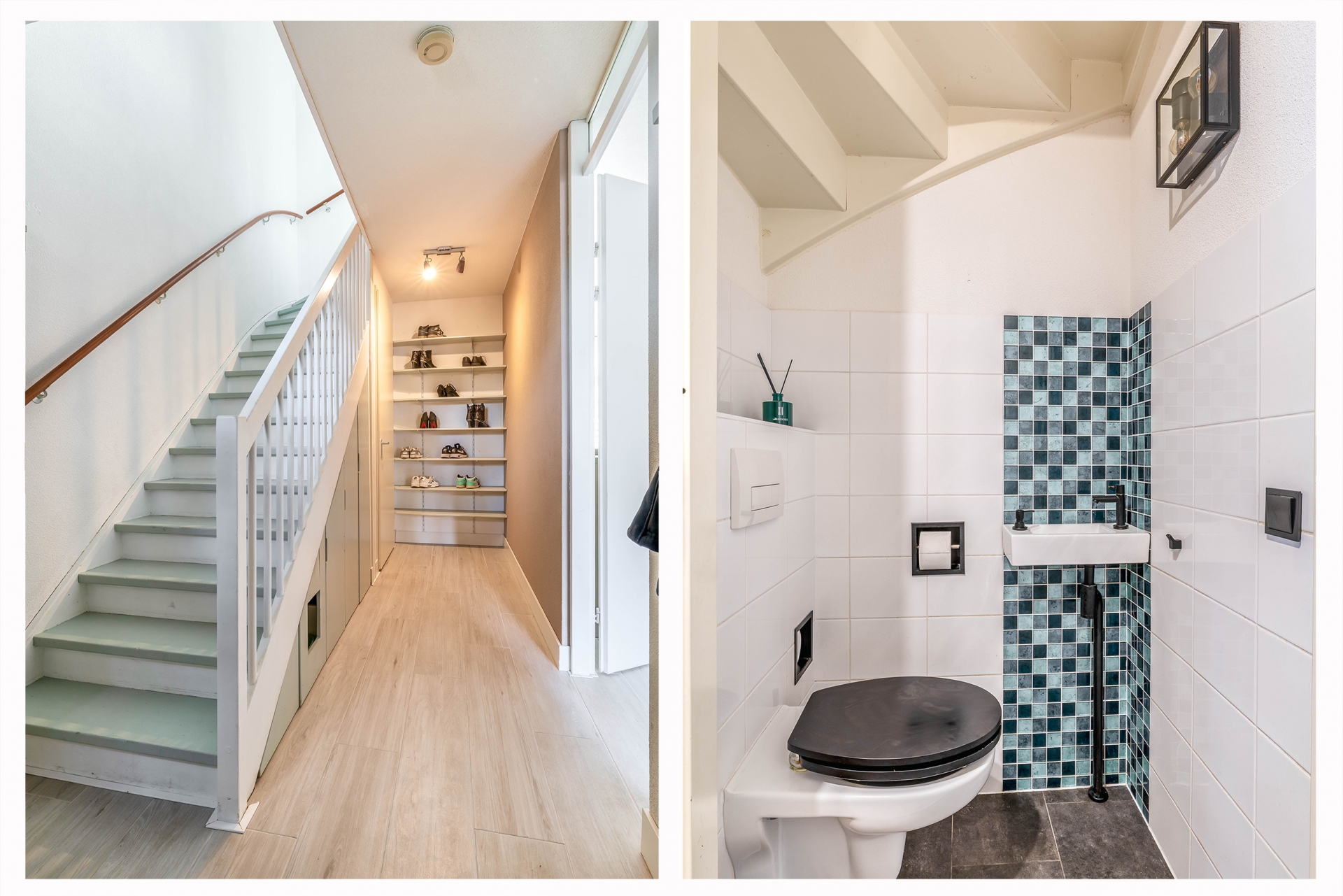 Entree via de hal met meterkast, garderoberuimte en toiletruimte met fonteintje. De woonkamer bevindt zich aan de voorzijde van de woning en staat in open verbinding met het eetgedeelte aan de achterzijde, waardoor een lichte en ruimtelijke leefruimte ontstaat. Aan de achterzijde bevindt zich de half open keuken, voorzien van diverse inbouwapparatuur, waaronder een inductiekookplaat, vaatwasser, oven, magnetron en afzuigkap. Via een enkele deur in de keuken is er directe toegang tot de zonnige achtertuin.