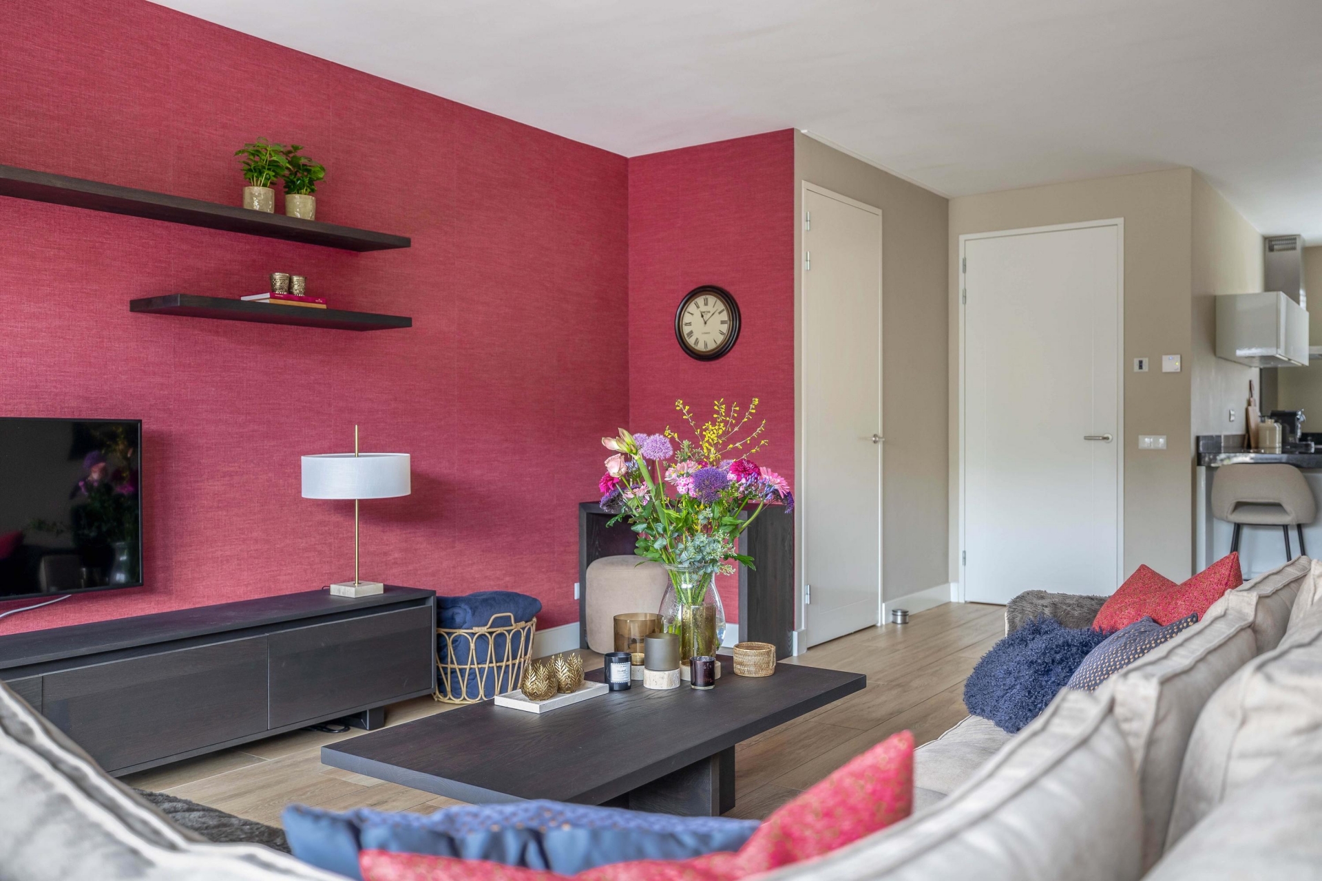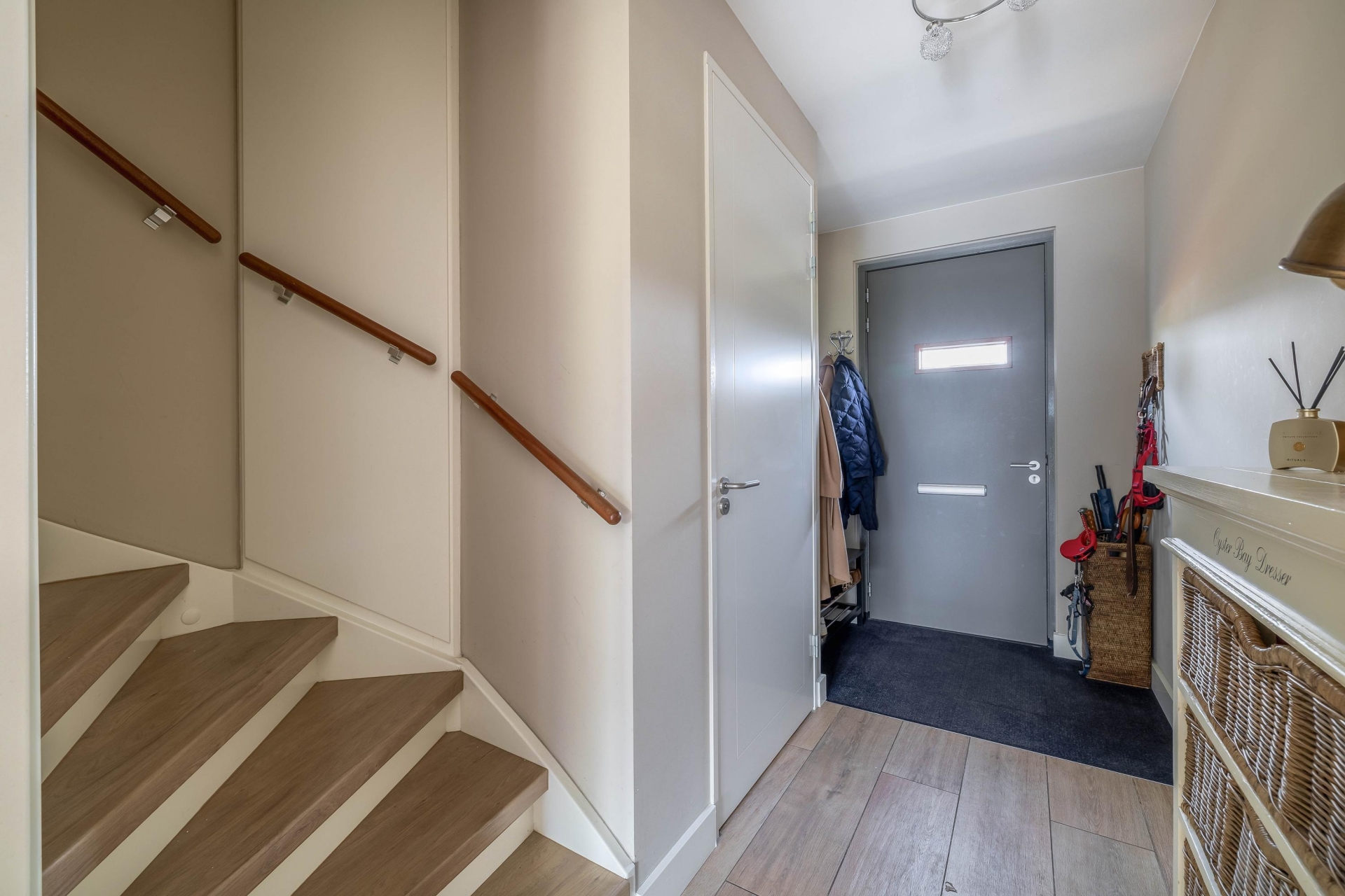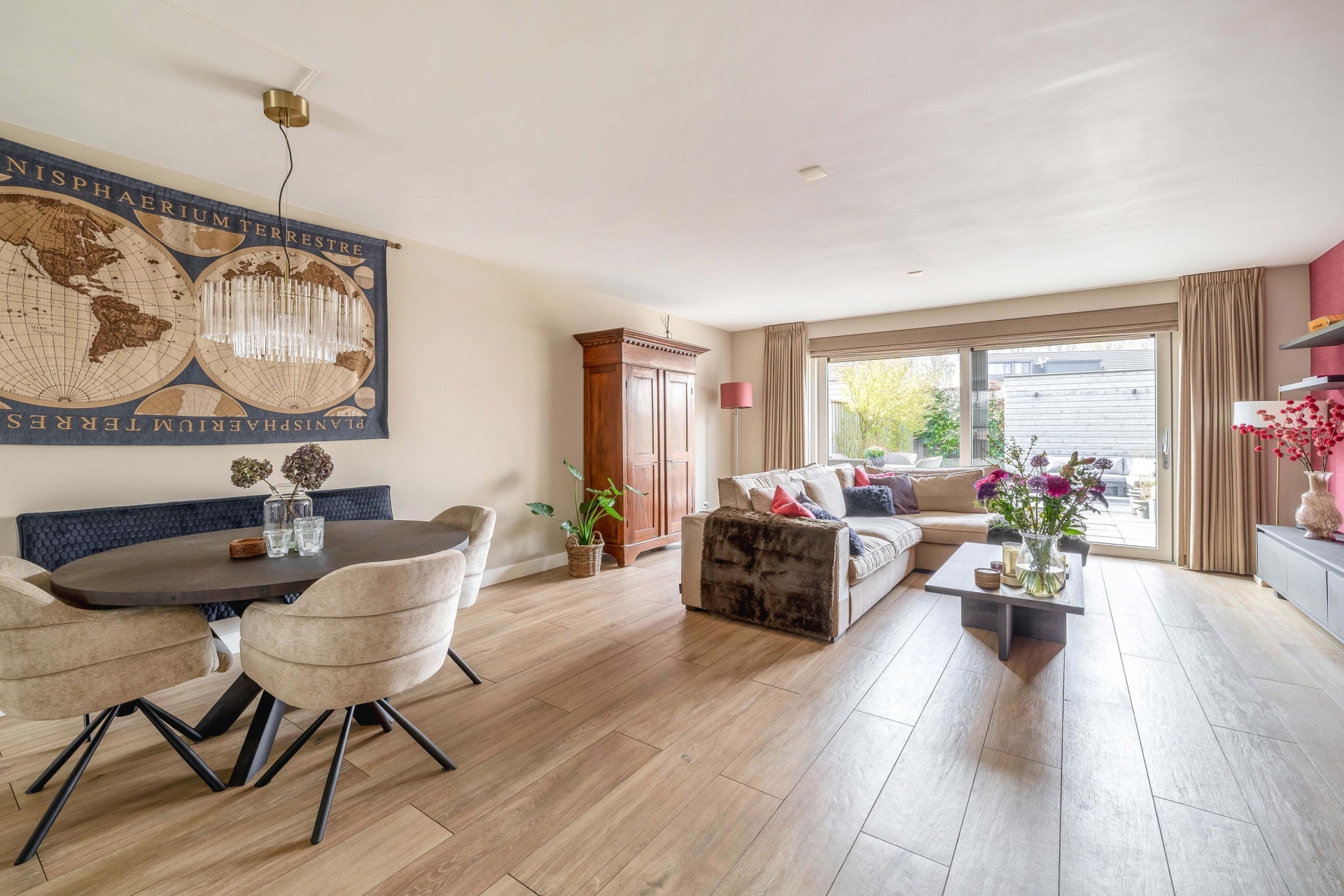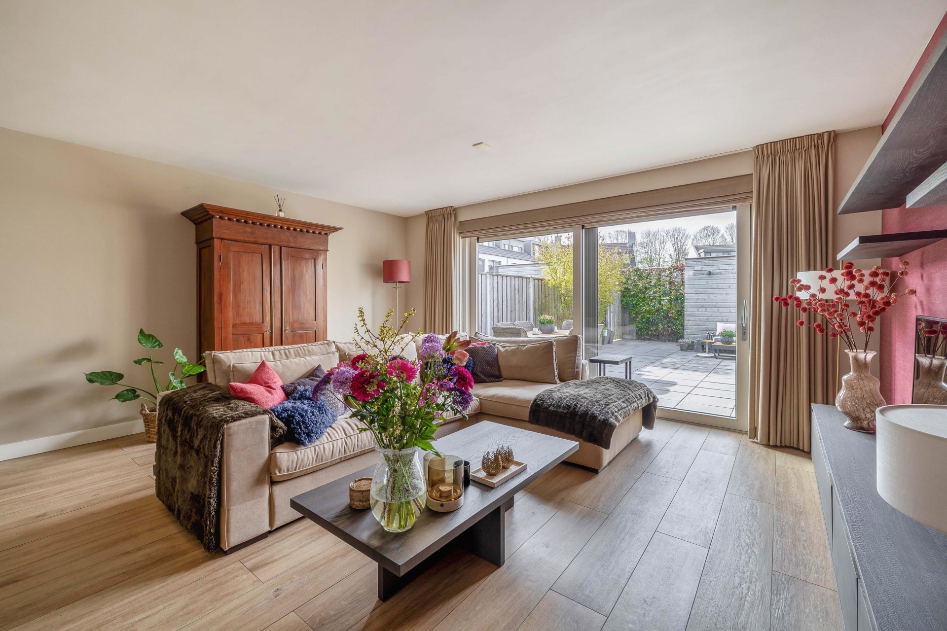 Via de ruime hal met meterkast en modern toilet betreed je de woonkamer. De uitgebouwde living biedt volop leefruimte en is afgewerkt met een fraaie plavuizenvloer voorzien van vloerverwarming. Dankzij de grote schuifpui geniet je hier van veel lichtinval en sta je in directe verbinding met de achtertuin.