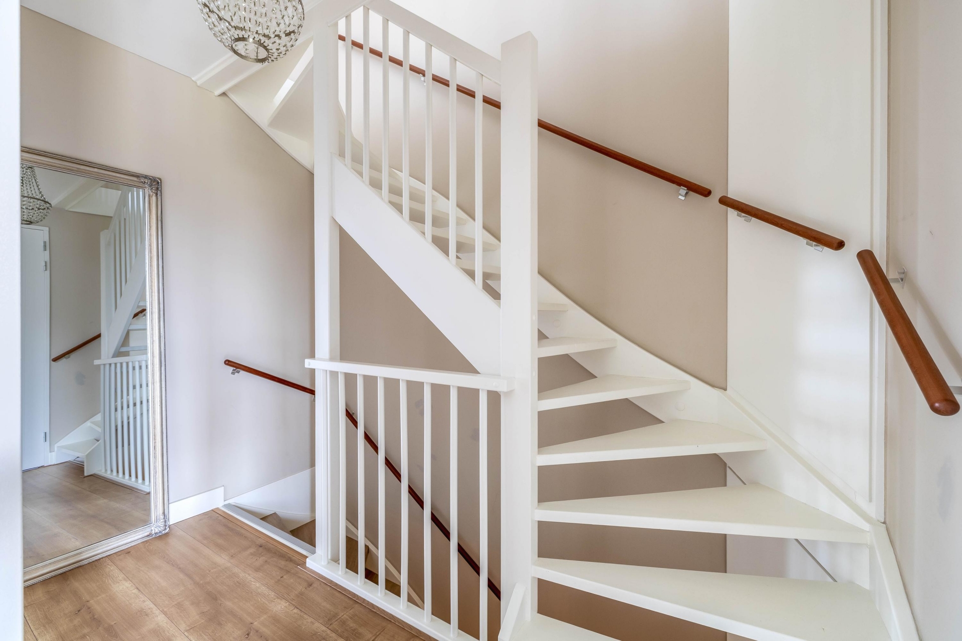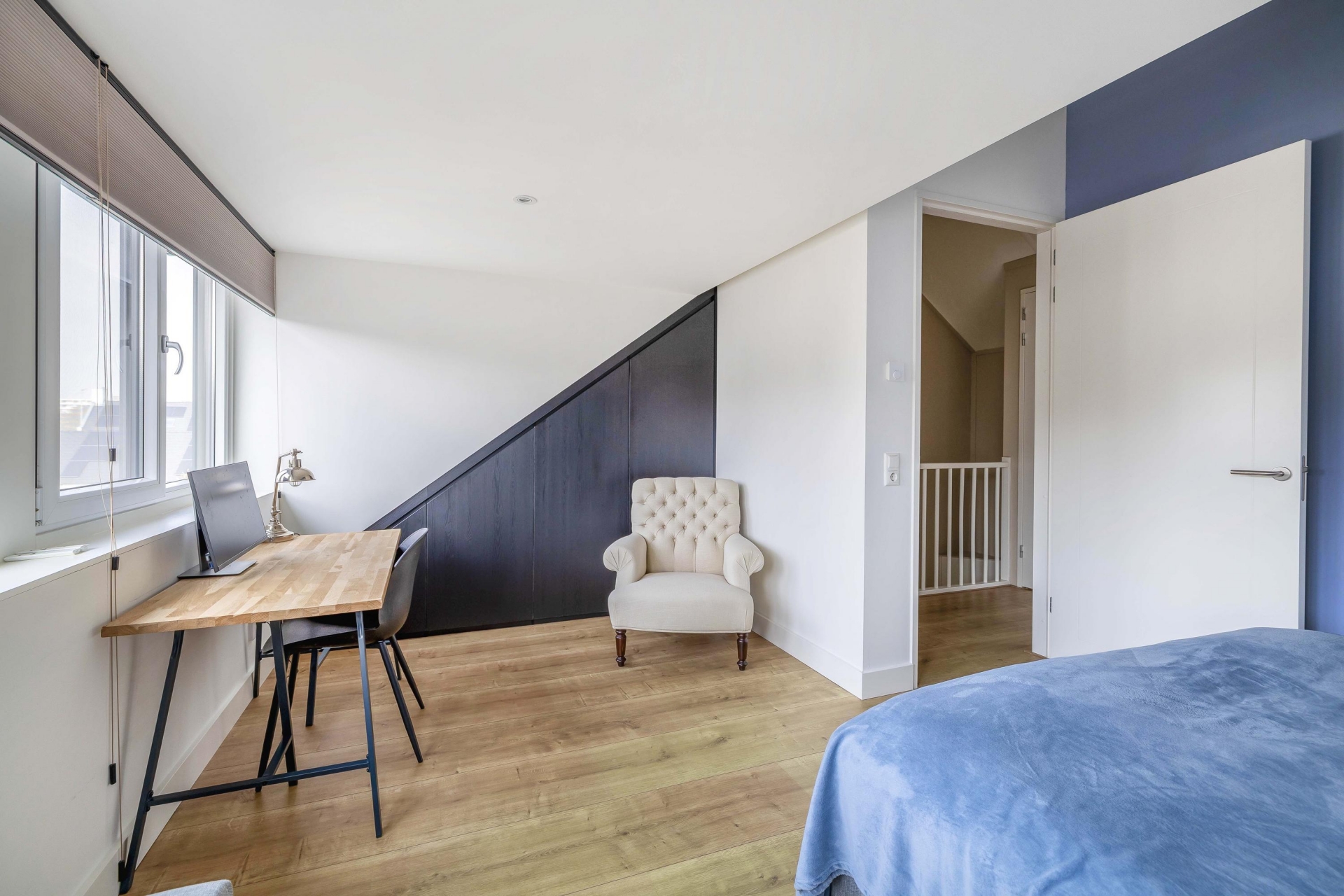 De overloop geeft toegang tot twee ruime slaapkamers aan de voor- en achterzijde, waarvan één is voorzien van een Frans balkon, de andere slaapkamer is voorzien van een ruime inloopkast