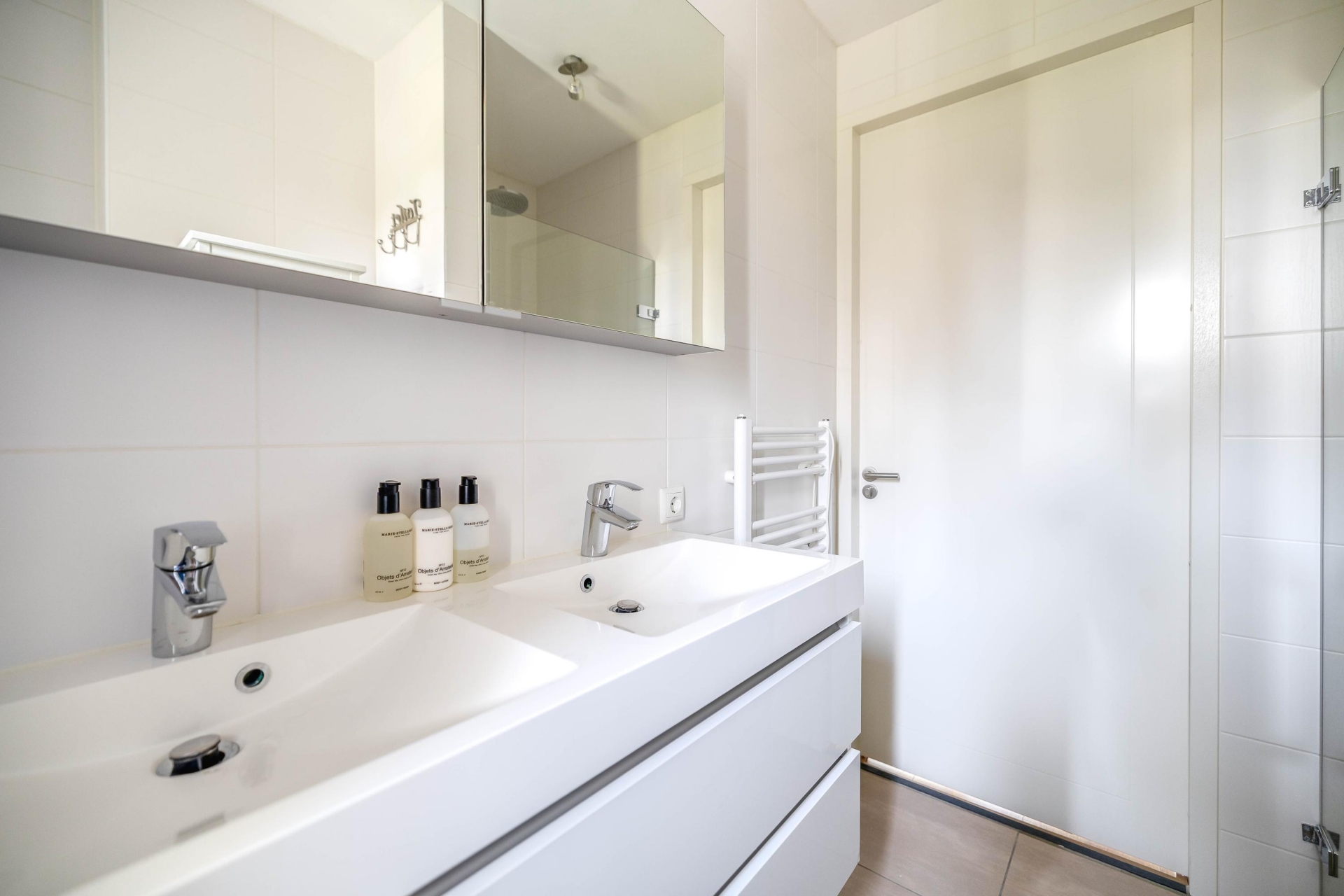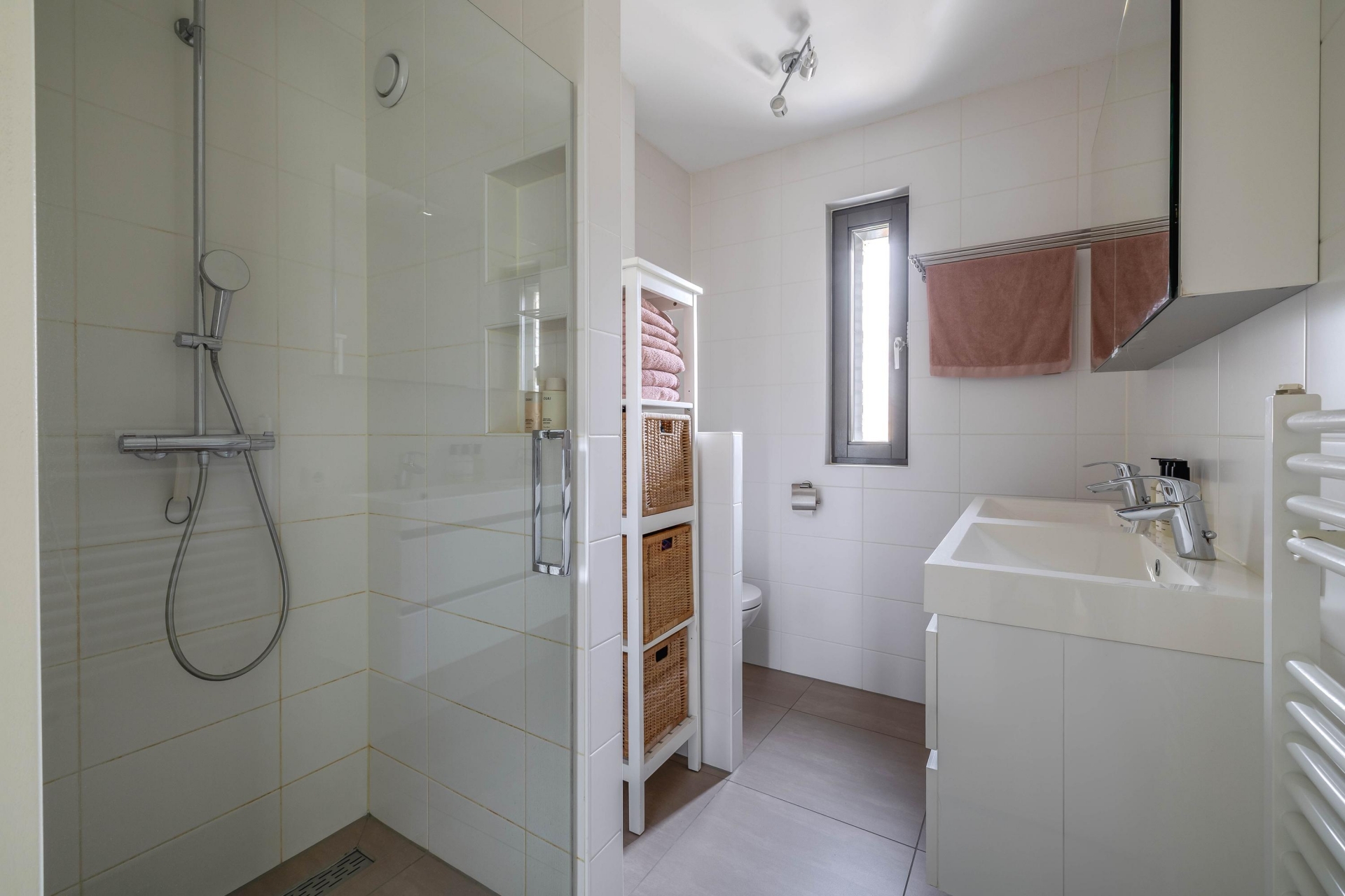 De moderne badkamer is stijlvol afgewerkt en uitgerust met een inloopdouche met stortdouche en drain, een toilet, een dubbel wastafelmeubel en een handdoekradiator.