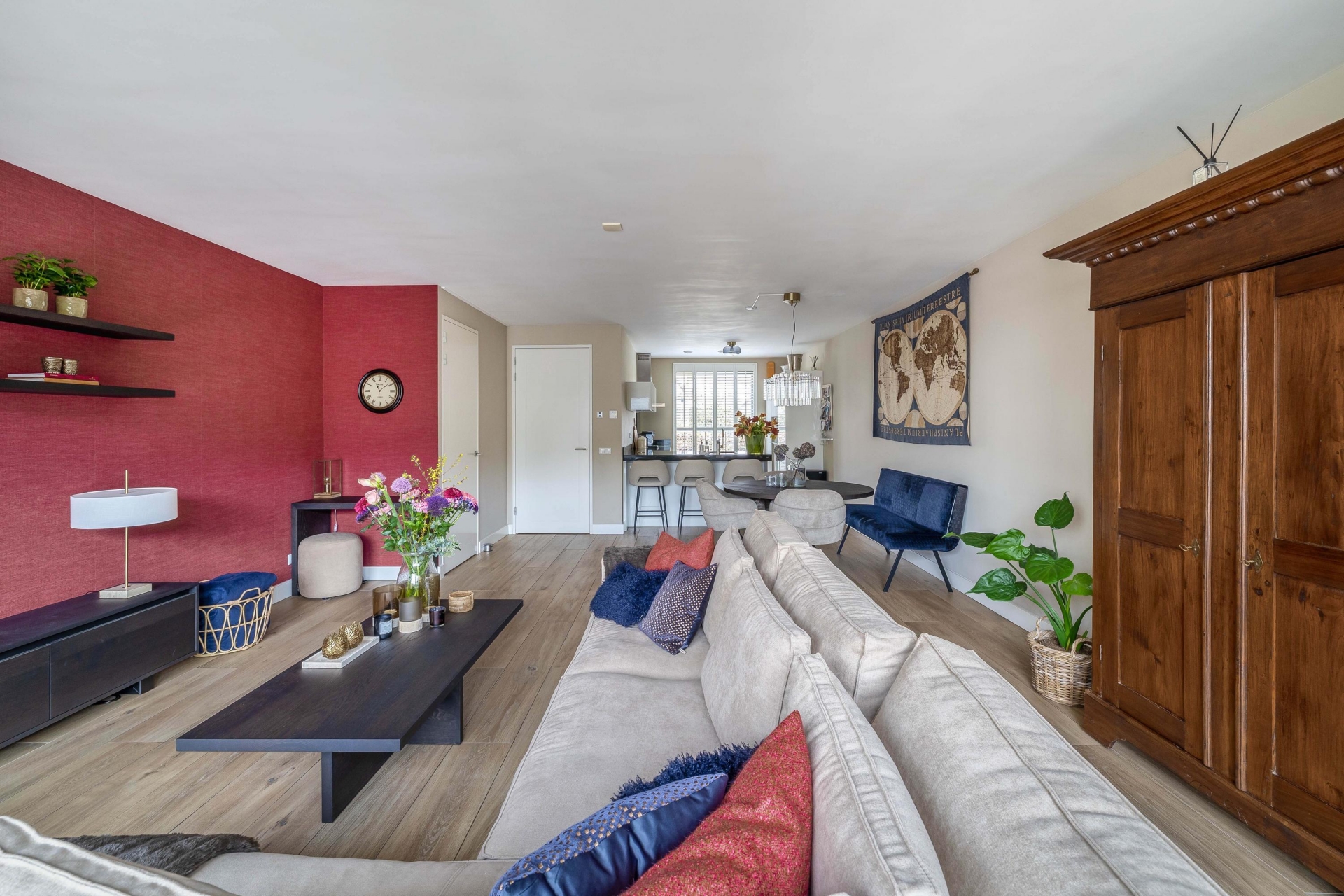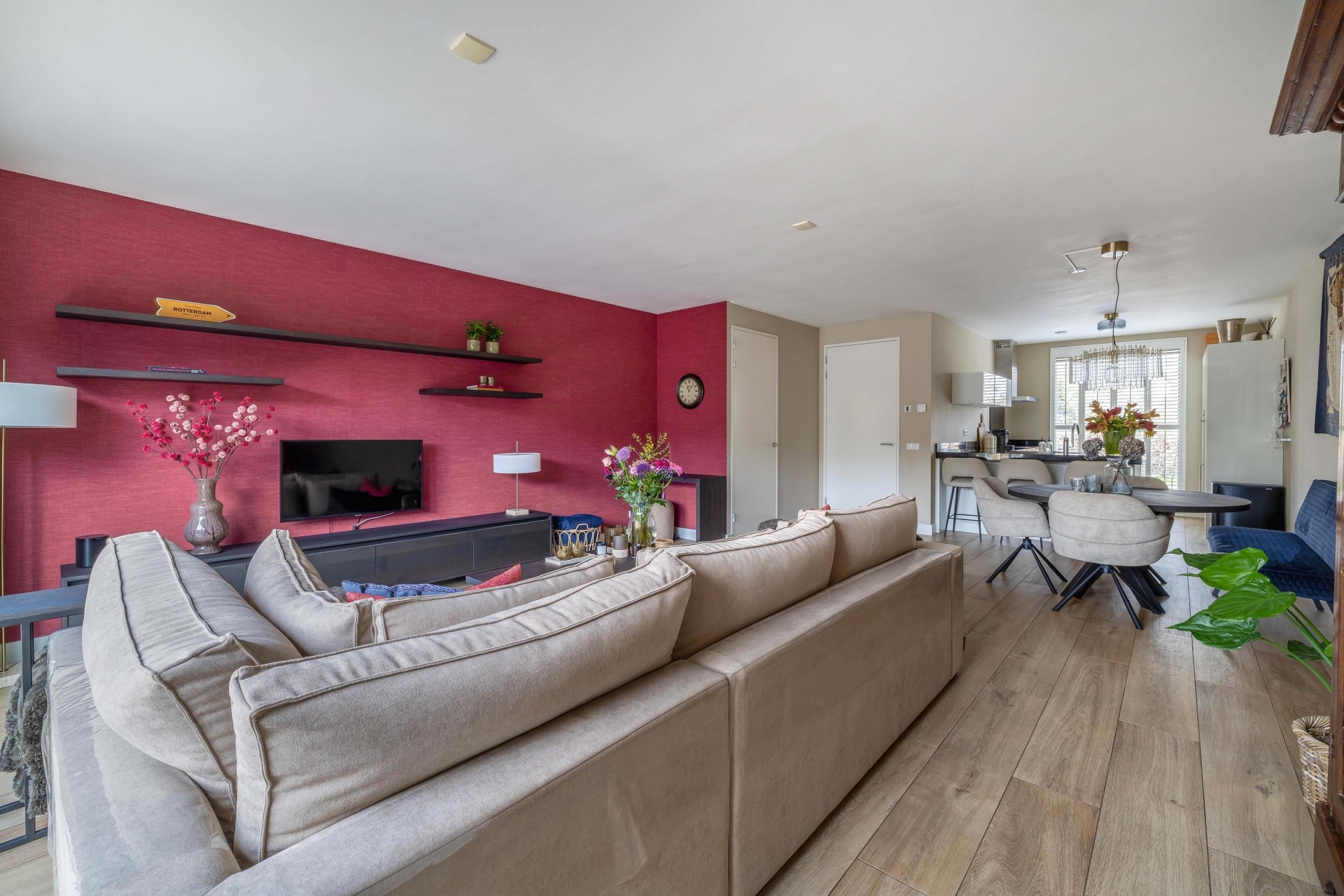 De open keuken aan de voorzijde is ruim opgezet en door het grote raam heerlijk licht. De keuken is compleet uitgevoerd met diverse inbouwapparatuur, waaronder een wijnkoelkast, vriezer, vaatwasser, combimagnetron en een 5-pits inductiekookplaat met afzuigschouw.