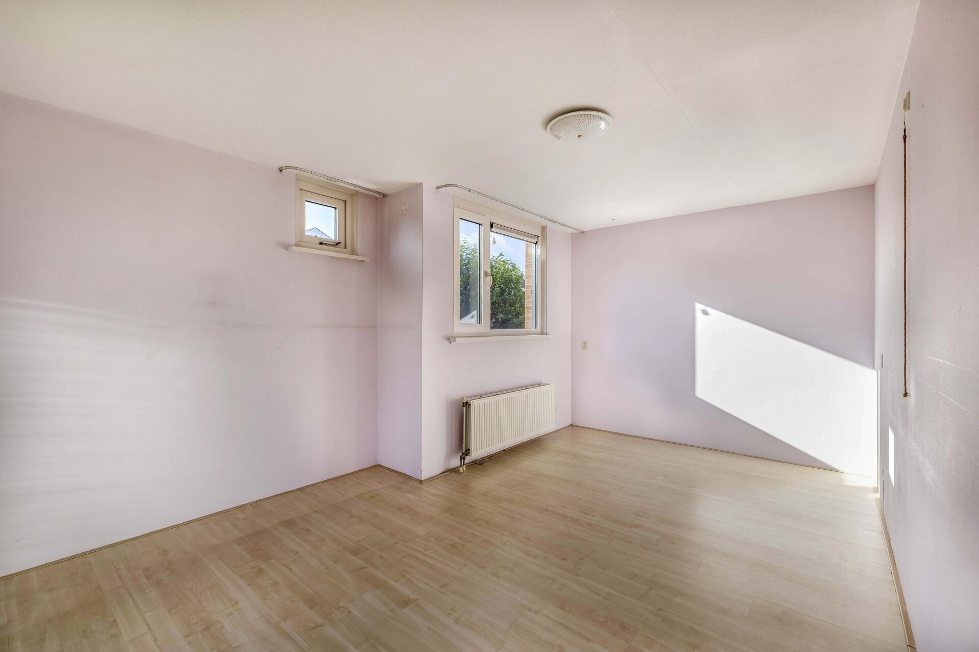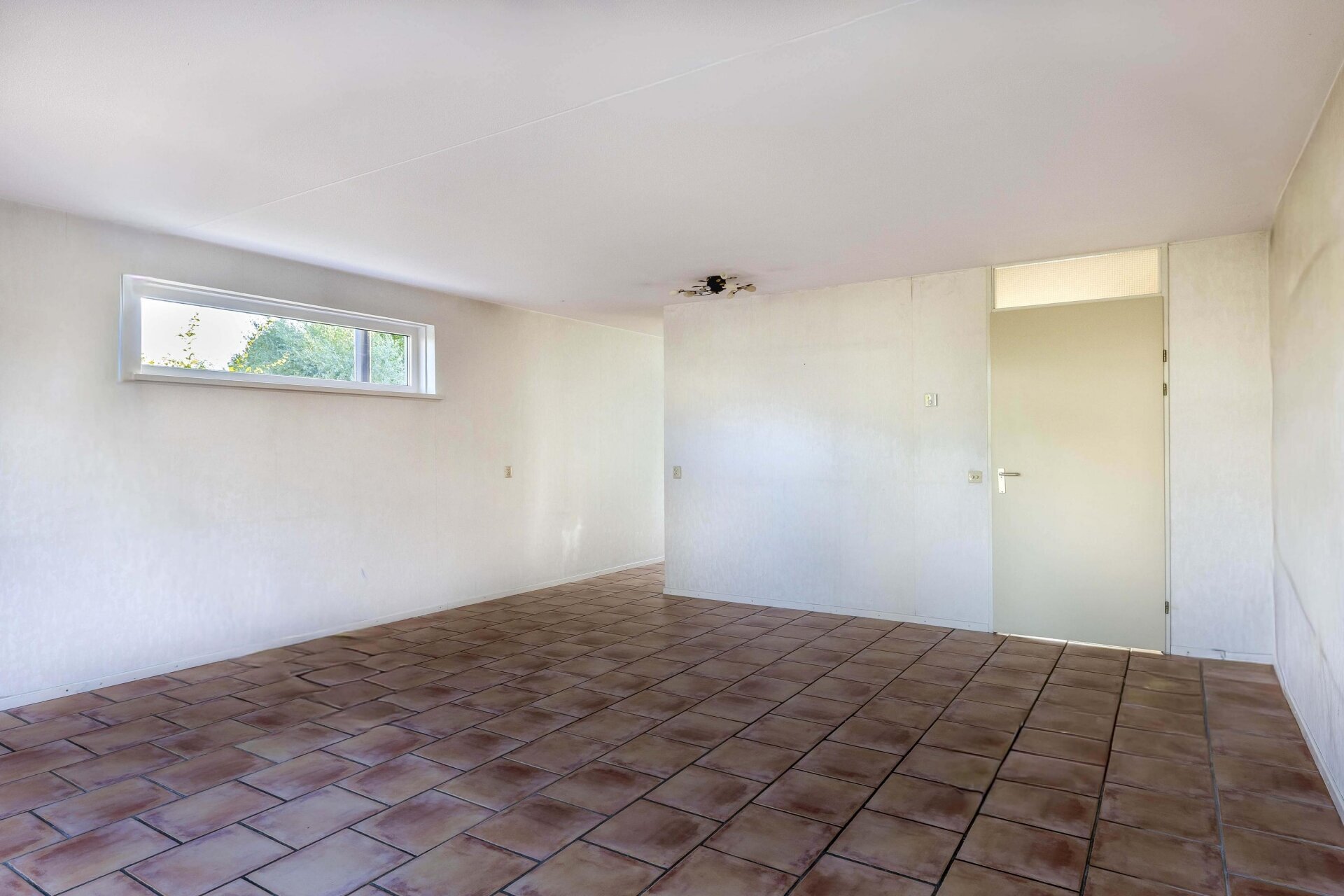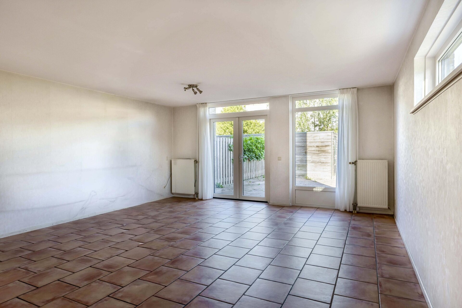 Bij binnenkomst valt direct de lichte en open sfeer op. De woonkamer is royaal van opzet en biedt door de openslaande deuren direct toegang tot de achtertuin. Dankzij het zijraam profiteer je van extra lichtinval, wat het geheel nog ruimtelijker maakt. De neutrale afwerking met tegelvloer en lichte wanden vormt een prima basis om je eigen stijl aan toe te voegen. De open verbinding met de keuken zorgt voor een fijne leefruimte waarin je zowel kunt ontspannen als gezellig tafelen. Vanuit de woonkamer kijk je uit op de tuin en het achterliggende groen, wat een gevoel van rust en privacy geeft.