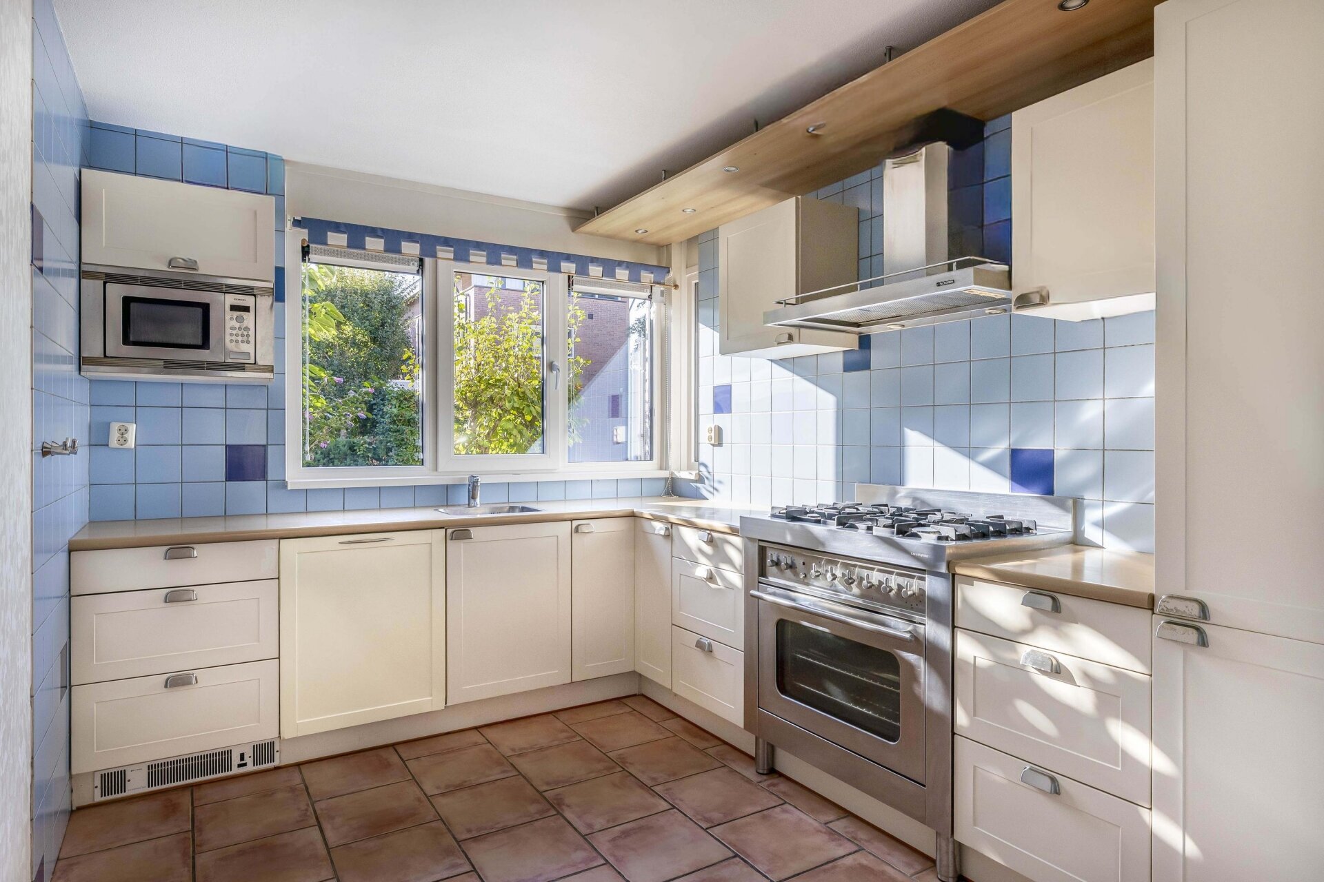 De keuken aan de voorzijde is uitgevoerd in een lichte kleurstelling en voorzien van diverse inbouwapparatuur, waaronder een groot gasfornuis met oven, afzuigkap, vaatwasser, koelkast en magnetron. Dankzij de U-opstelling is er veel werk- en bergruimte, en heb je direct zicht op de straat. De trapkast zorgt voor de nodige bergruimte.