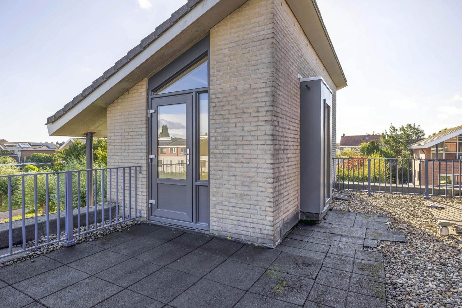 Een van de grote pluspunten van deze woning is het dakterras, gelegen op de tweede verdieping. Hier geniet je van een vrij uitzicht en heb je een ideale plek om te ontspannen met een boek of borrel, in alle privacy.