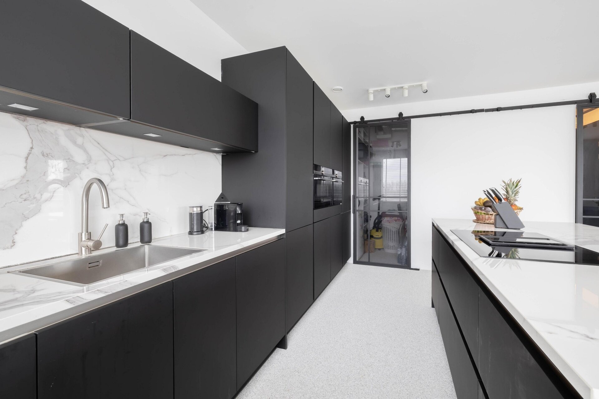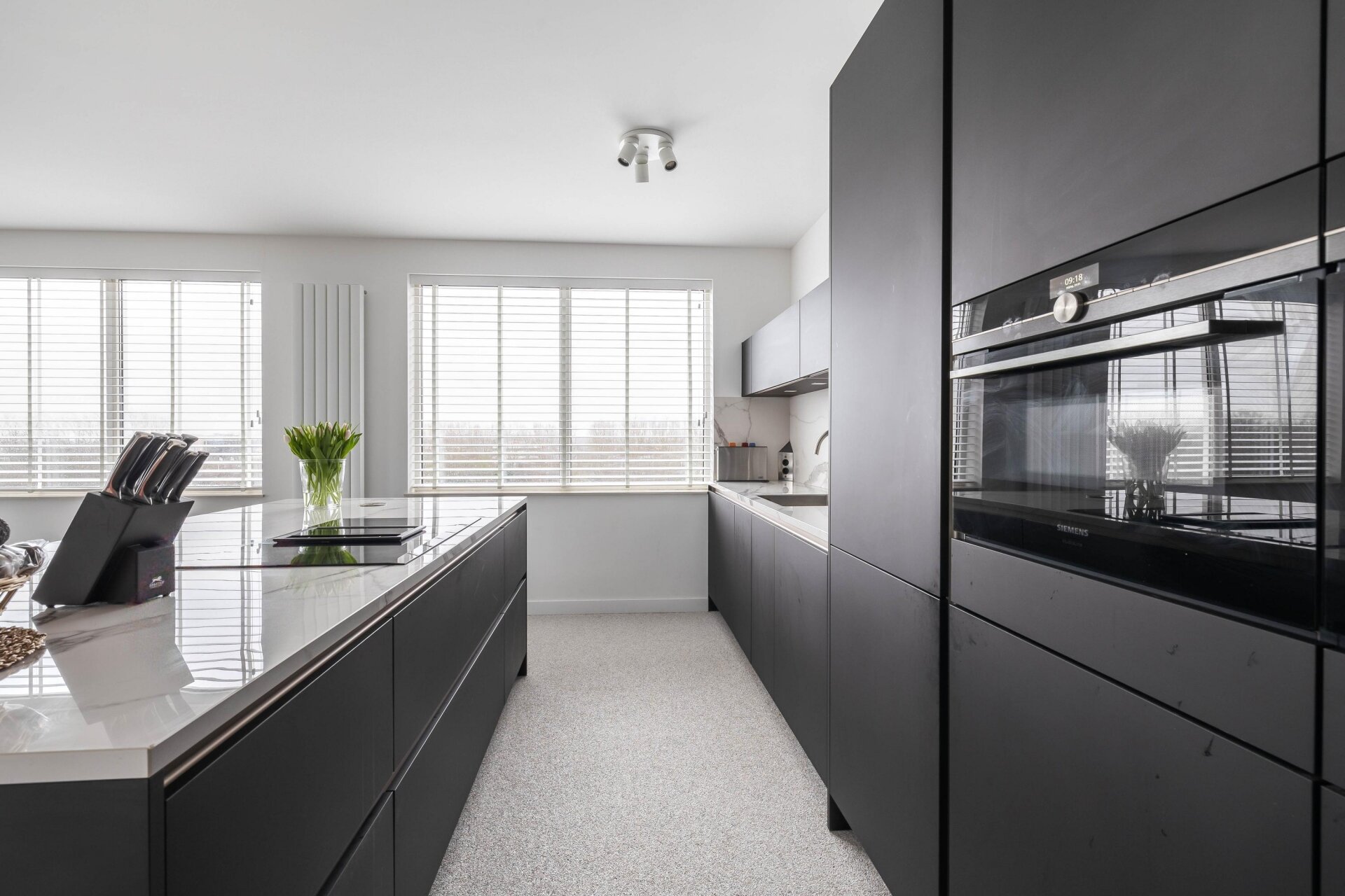 Aangekomen bij het appartement is het lichtinval en het uitzicht vanuit de woonkamer en woonkeuken een ware eyecatcher. De mat zwarte keuken met kookeiland is voorzien van alle benodigde inbouwapparatuur en beschikt over een sfeervol barretje. Vanuit de keuken is er nog een handige bijkeuken toegankelijk, waar zich ook de aansluiting voor de wasmachine bevindt. Vanuit de hal is er toegang tot de overige vertrekken, zoals 2 slaapkamers, een luxe badkamer en separaat het toilet. Beide slaapkamers beschikken over een vaste kastenwand die tal van ruimte biedt. De inpandige badkamer is voorzien van een inloopdouche, een dubbele wastafel met meubel en een spiegel met verlichting.