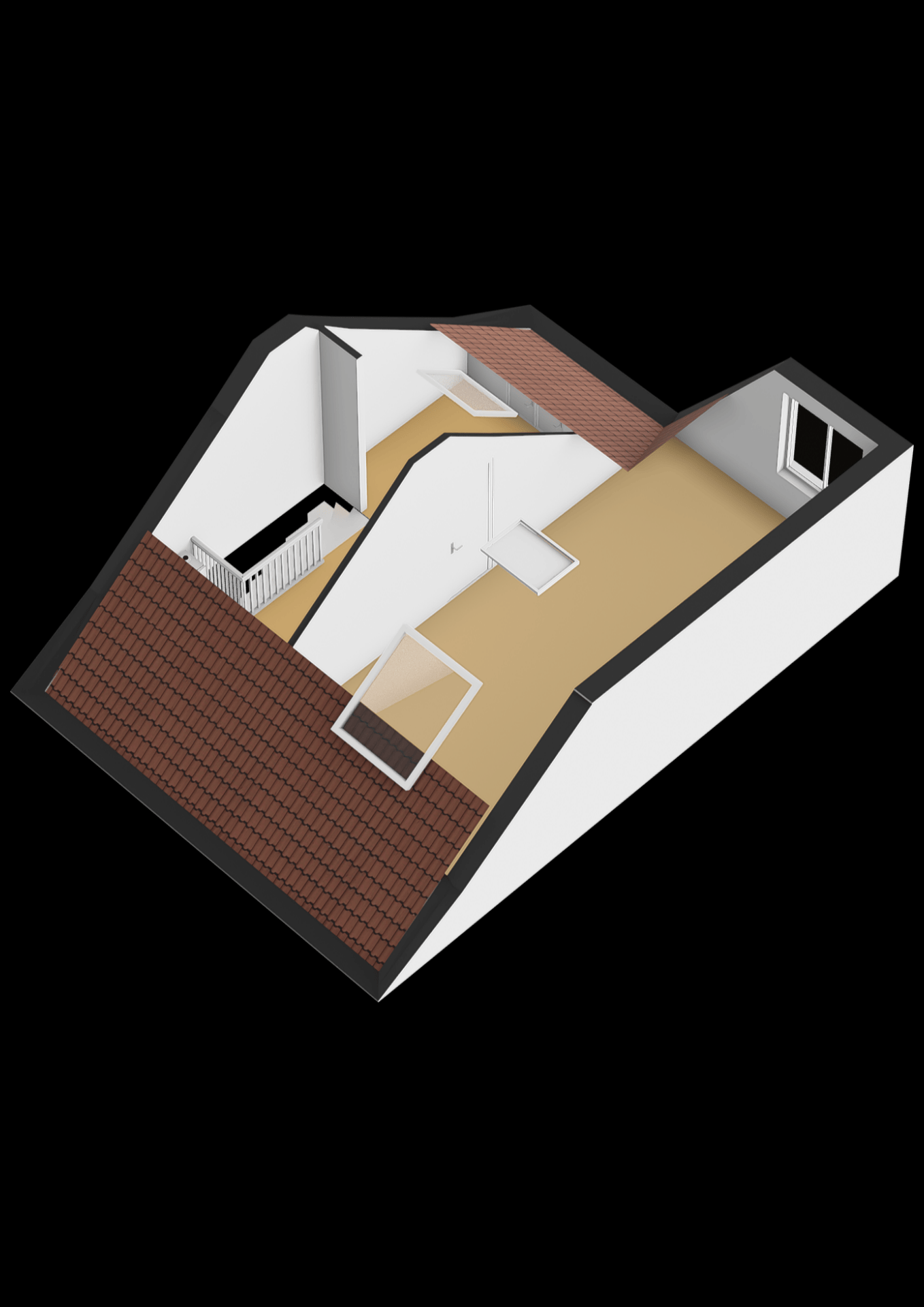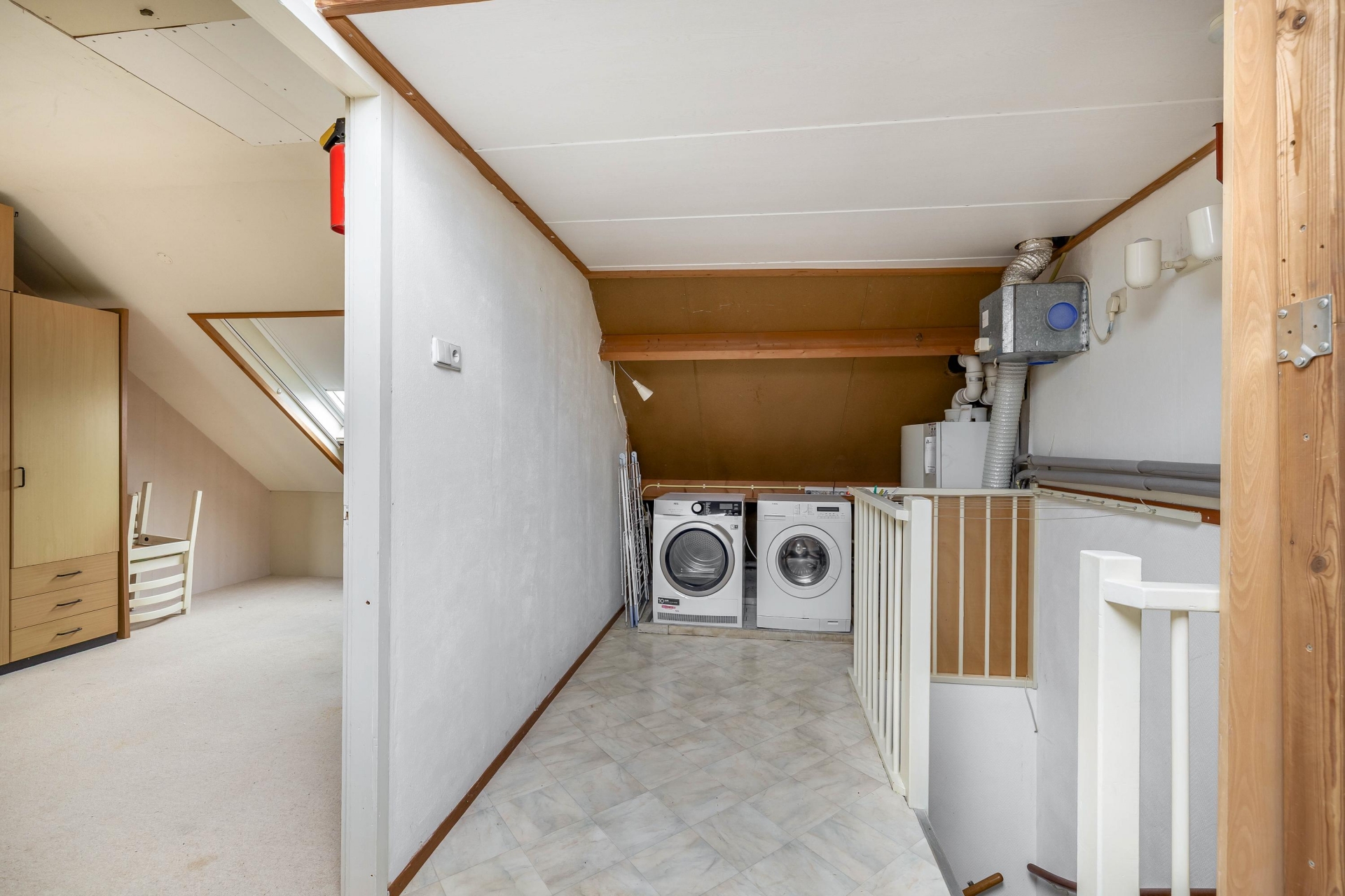 Overloop met opstelplaats voor wasmachine en droger, mechanische ventilatie en de cv-combiketel. Grote vierde slaapkamer voorzien van een dakraam en extra bergruimte achter de knieschotten.