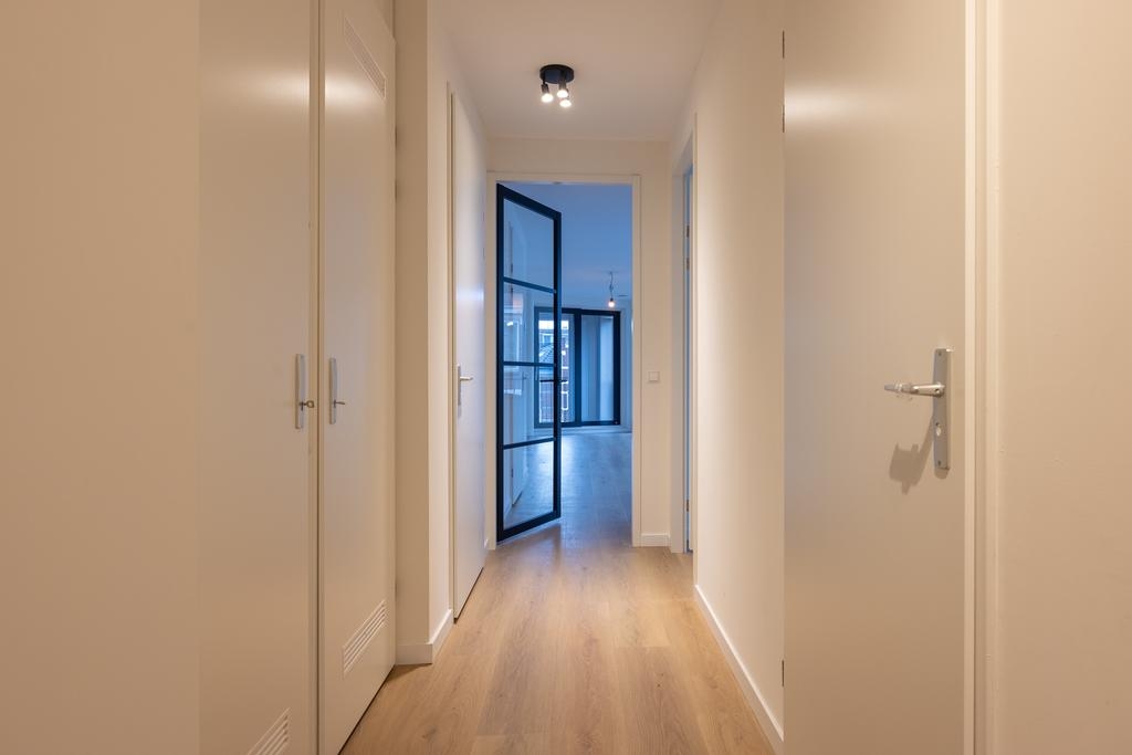 De entree ligt direct naast de lift (zonder geluidsoverlast én zonder galerij), waardoor je makkelijk en comfortabel thuis komt. Vanuit de hal heb je toegang tot twee slaapkamers, een luxe badkamer met ruime inloopdouche en stijlvol wastafelmeubel, een apart toilet, en een praktische inpandige berging met ruimte voor de wasmachine, droger én het WTW-systeem.