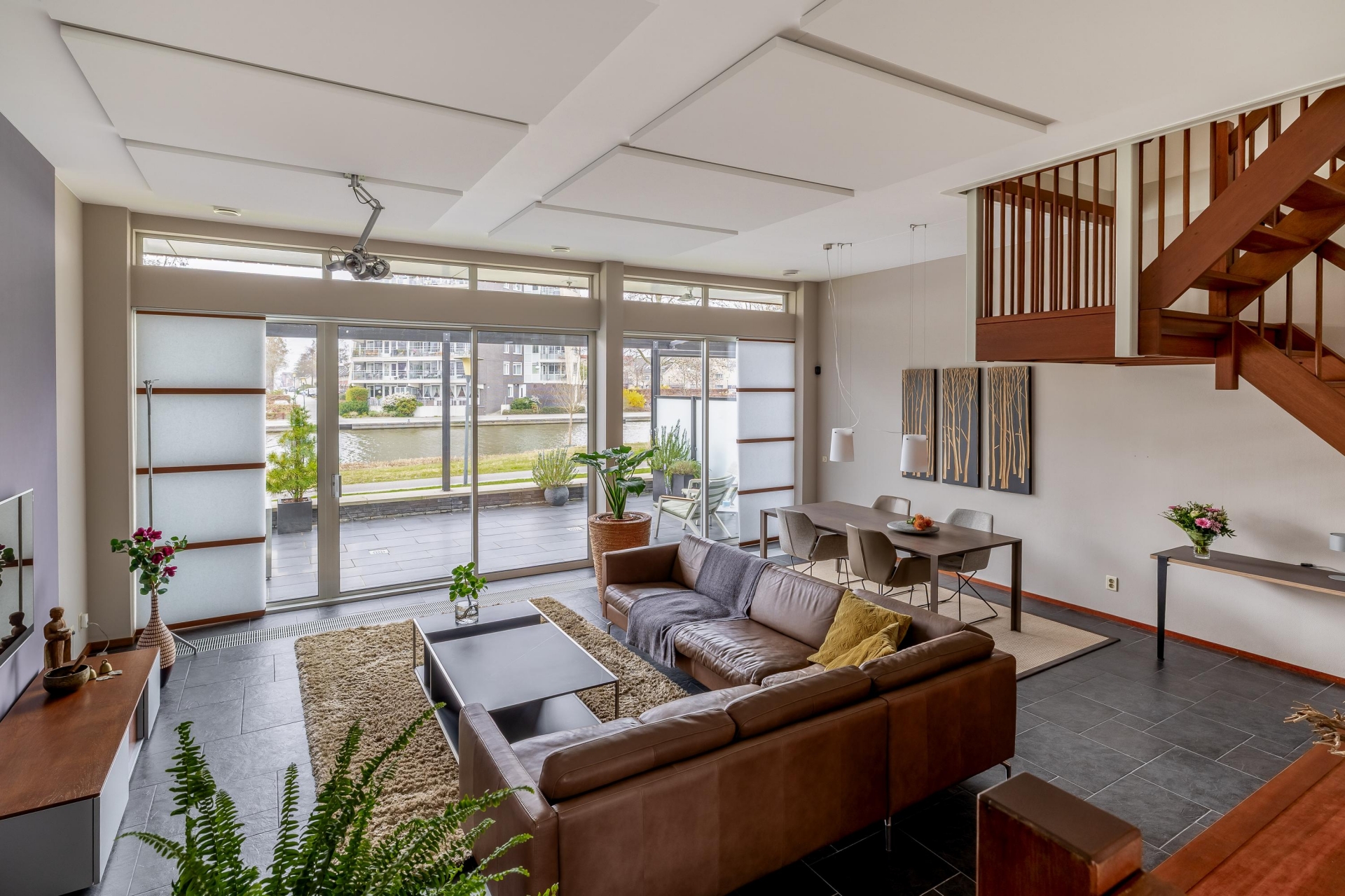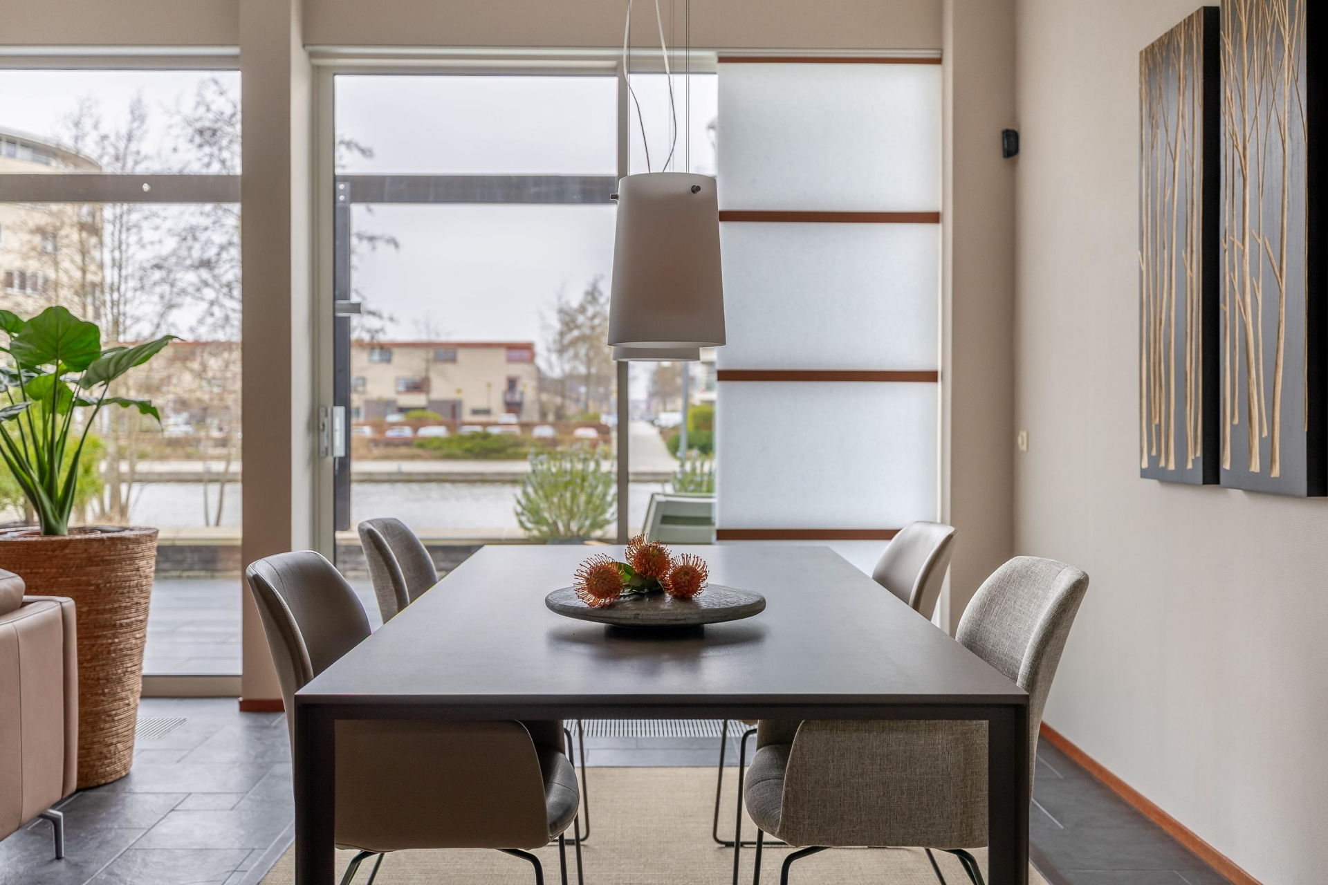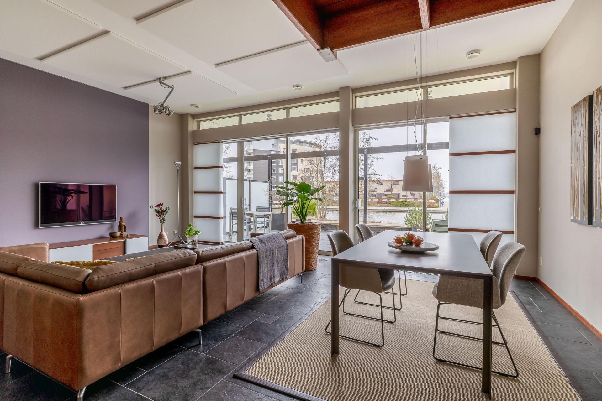 Aan de achterzijde bevindt zich de woonkamer, een echte eyecatcher van het huis. Hier zit je letterlijk aan het water, met een vrij uitzicht dat nooit verveelt. De grote raampartijen halen buiten naar binnen en zorgen voor een prachtige lichtinval. Vanuit hier stap je zo de tuin in, die op het westen ligt. Een heerlijke plek om te genieten van de zon tot in de avonduren.