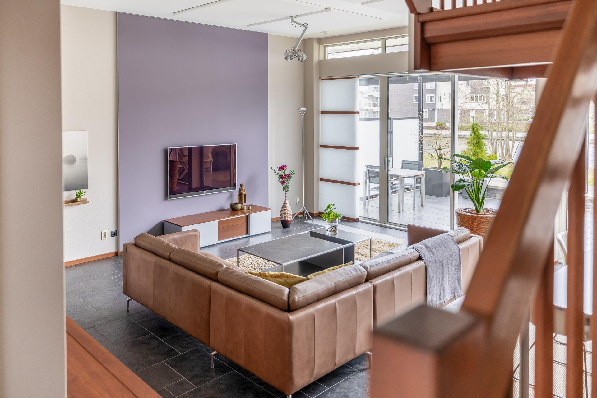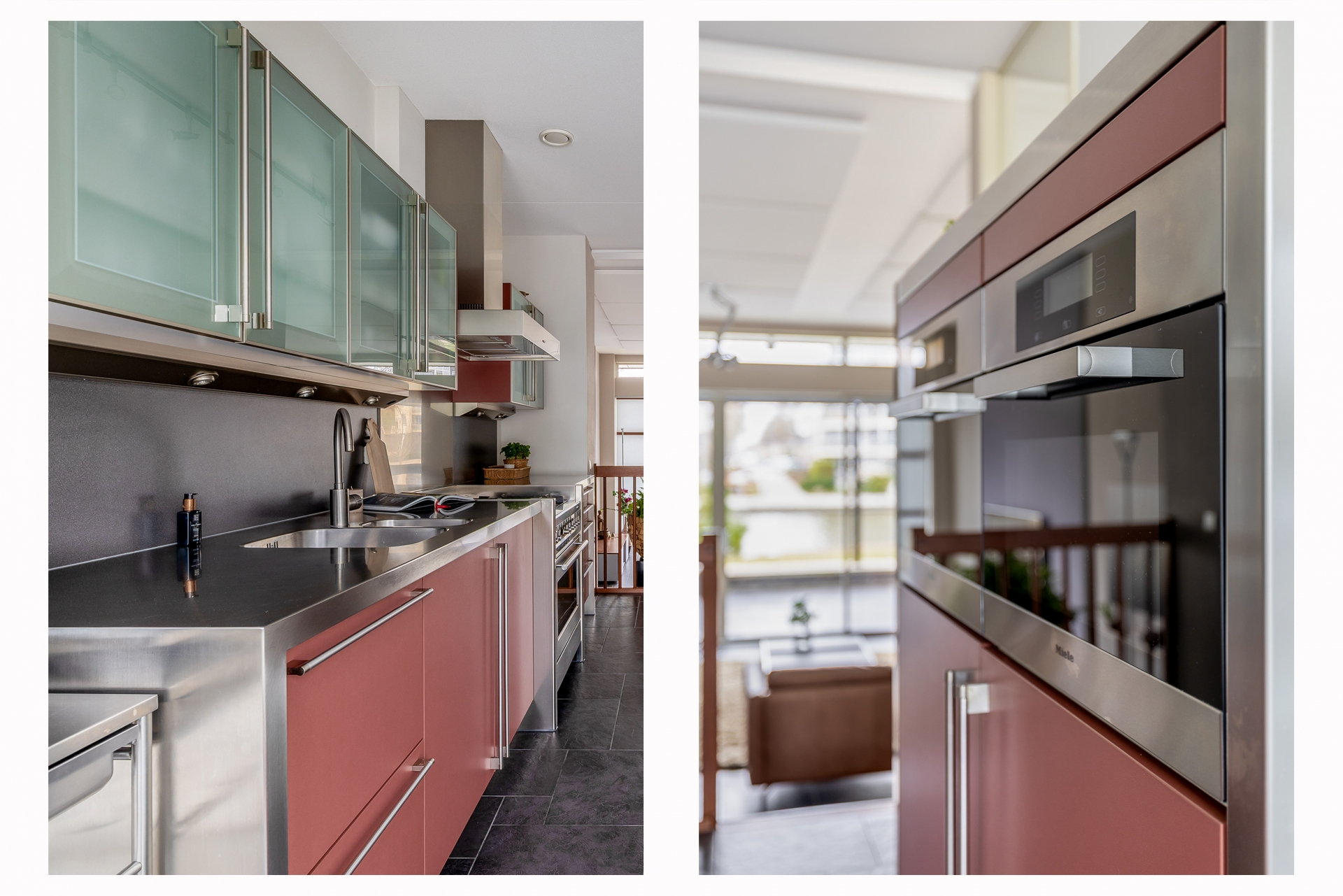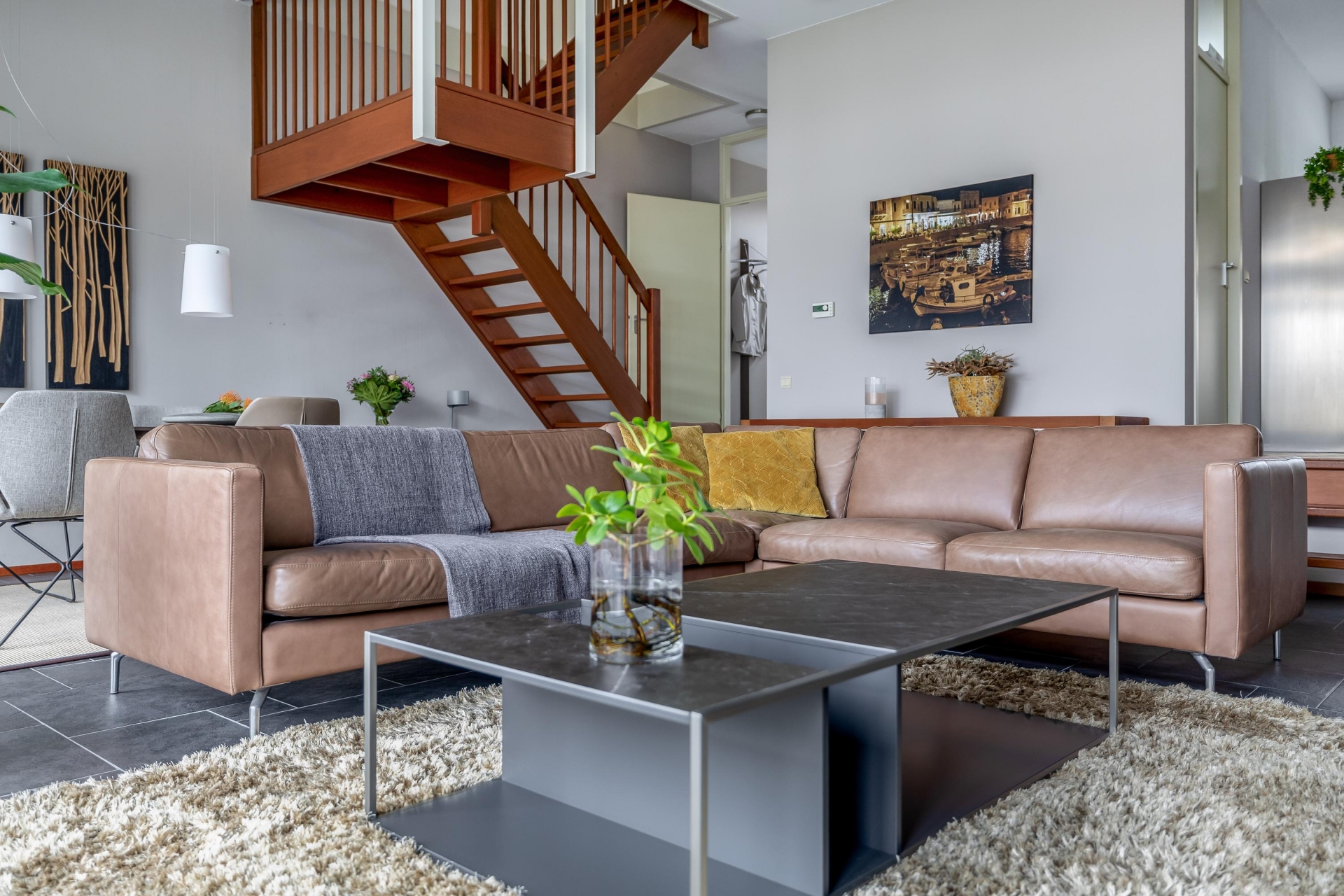 Aan de achterzijde bevindt zich de woonkamer, een echte eyecatcher van het huis. Hier zit je letterlijk aan het water, met een vrij uitzicht dat nooit verveelt. De grote raampartijen halen buiten naar binnen en zorgen voor een prachtige lichtinval. Vanuit hier stap je zo de tuin in, die op het westen ligt. Een heerlijke plek om te genieten van de zon tot in de avonduren.