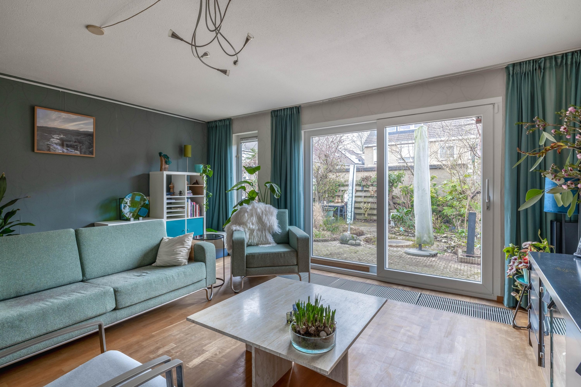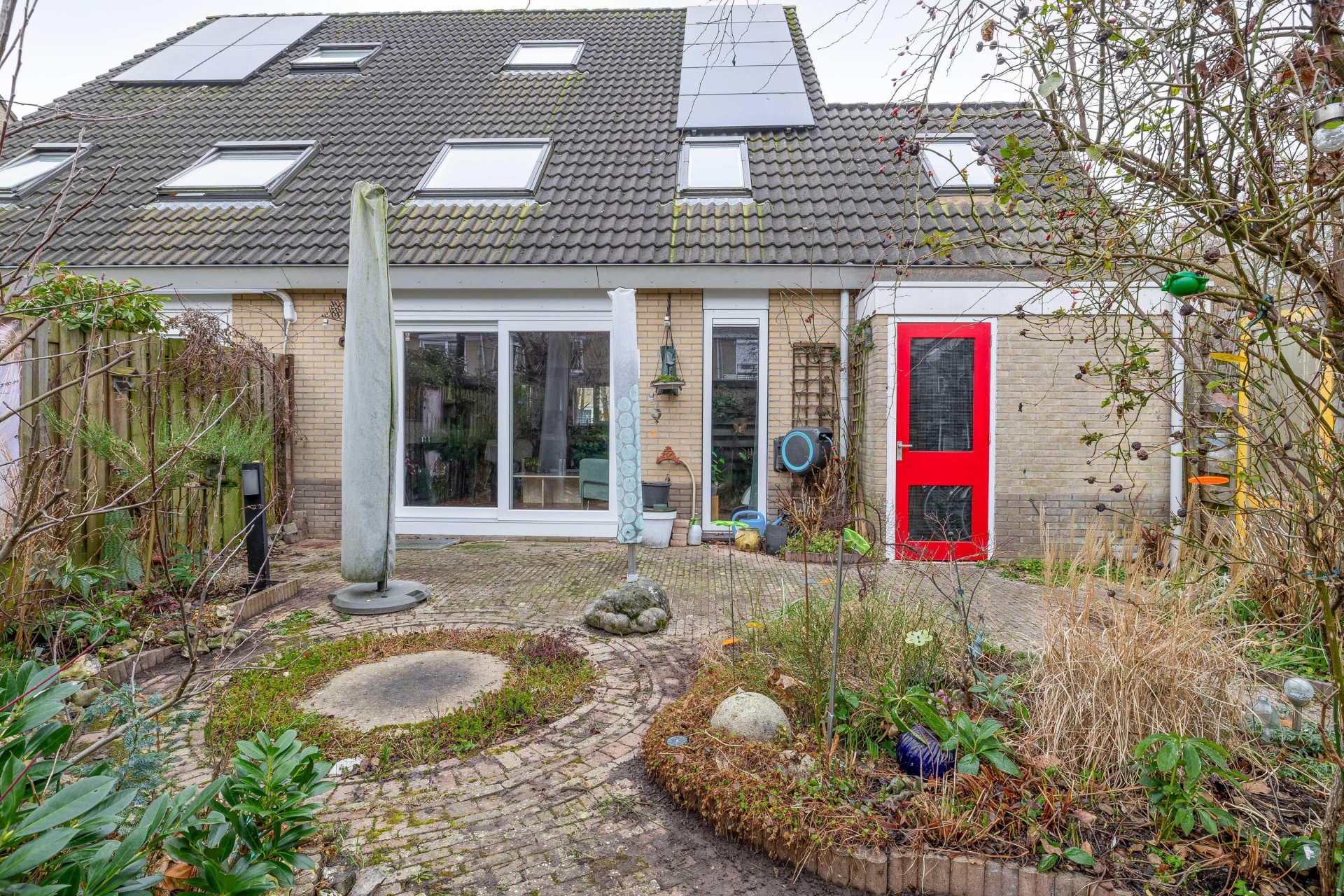 De ruime achtertuin is gunstig gelegen en biedt op ieder moment van de dag een plek in de zon of schaduw. Een heerlijke plek om te ontspannen of gezellig te tafelen. Het kunstwerk in de voortuin is ter overname
