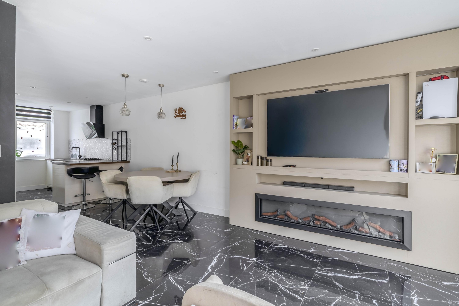 Bij binnenkomst valt direct de lichte en open sfeer op. De woonkamer bevindt zich op de begane grond, met zicht op zowel de straat aan de voorzijde als de tuin aan de achterzijde. De strakke wanden en nette vloer zorgen voor een moderne basis. Aan de voorzijde van de woning is de open keuken geplaatst, voorzien van diverse inbouwapparatuur en genoeg werkruimte.