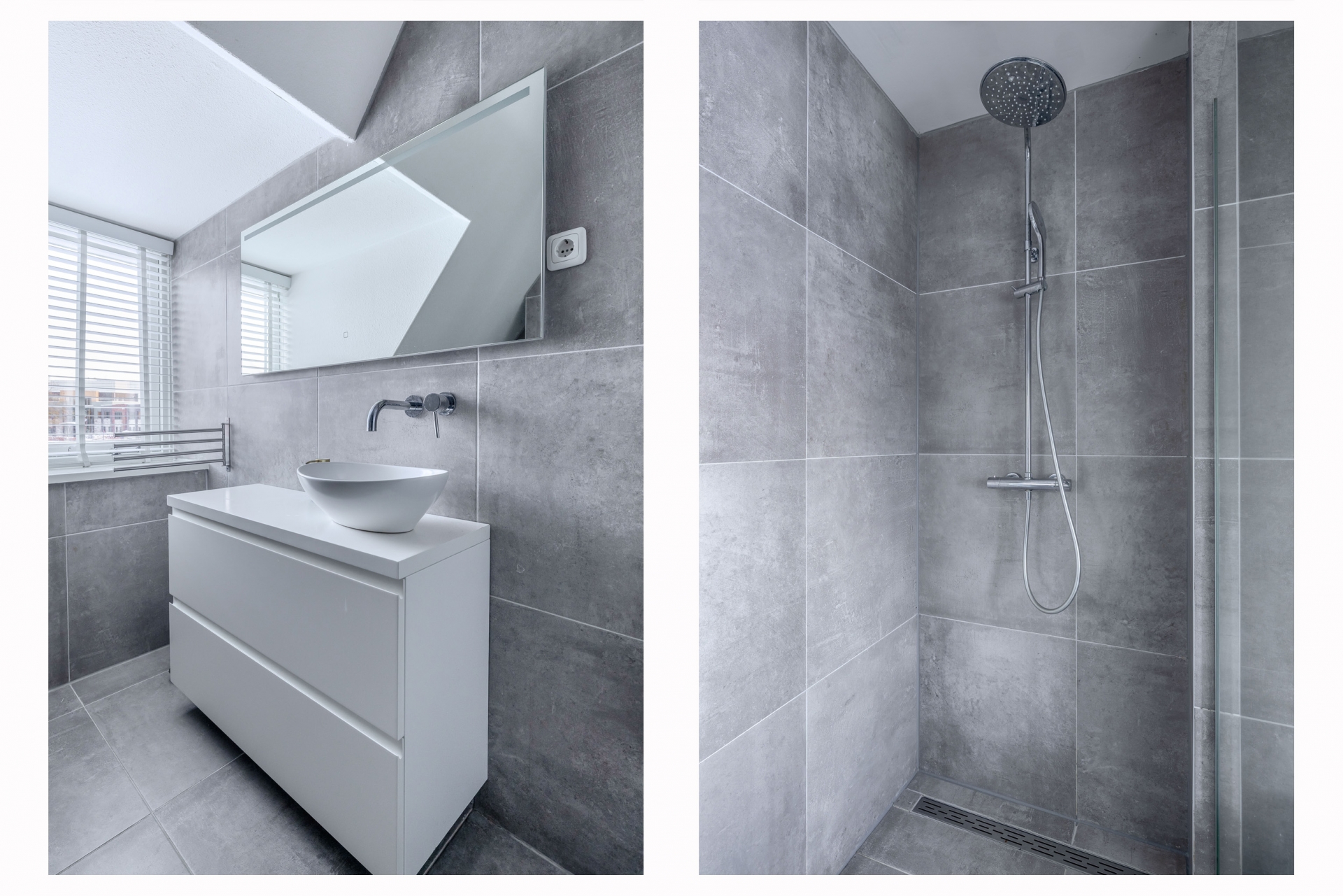 Overloop met toegang tot drie slaapkamers, de badkamer en de trap naar de tweede verdieping. De badkamer is modern uitgevoerd en voorzien van een wastafelmeubel, douche, toilet en wasmachineaansluiting.