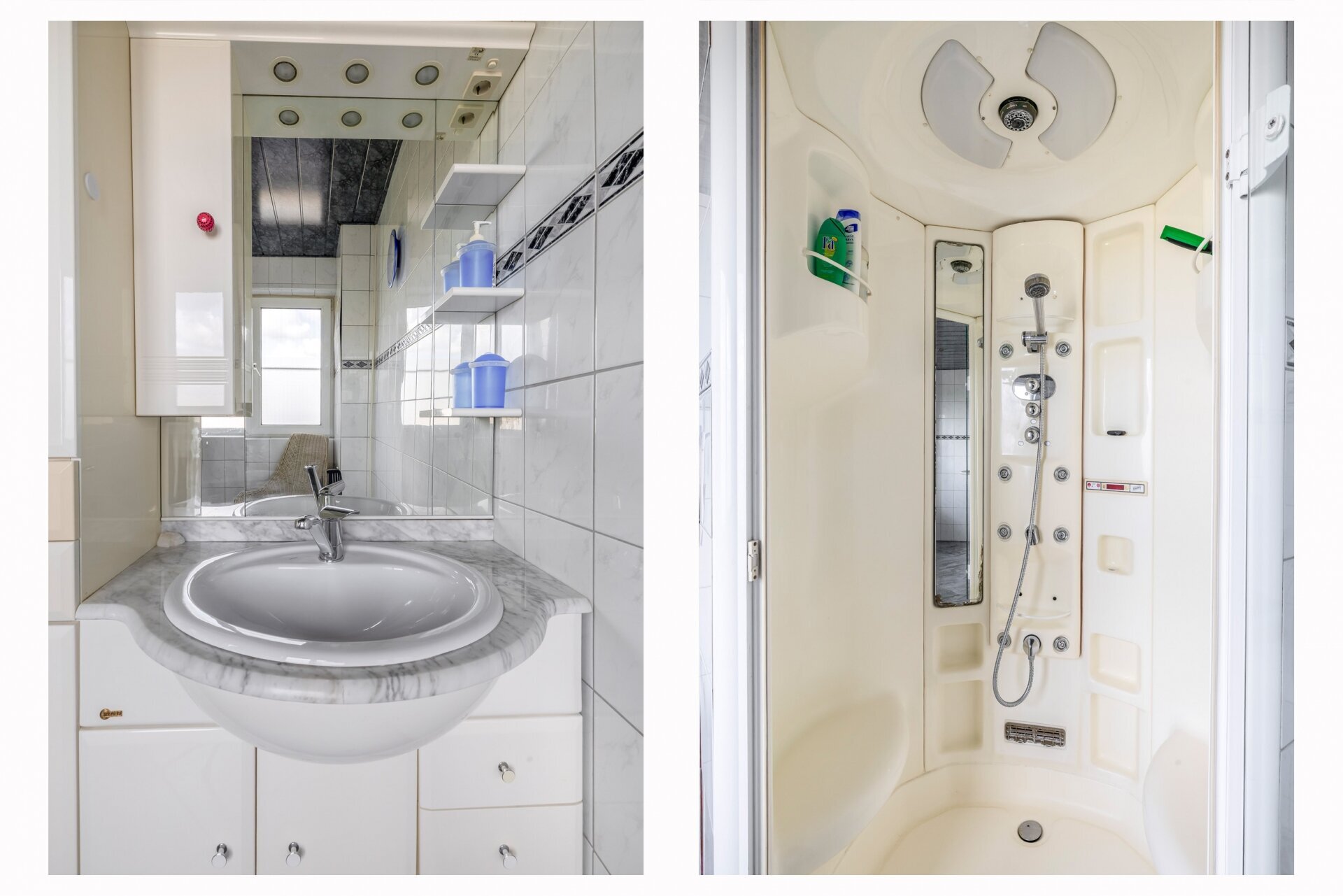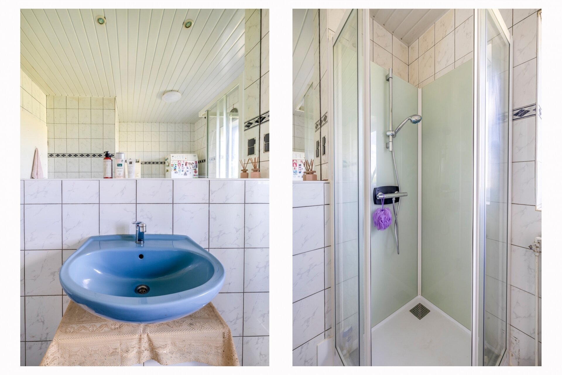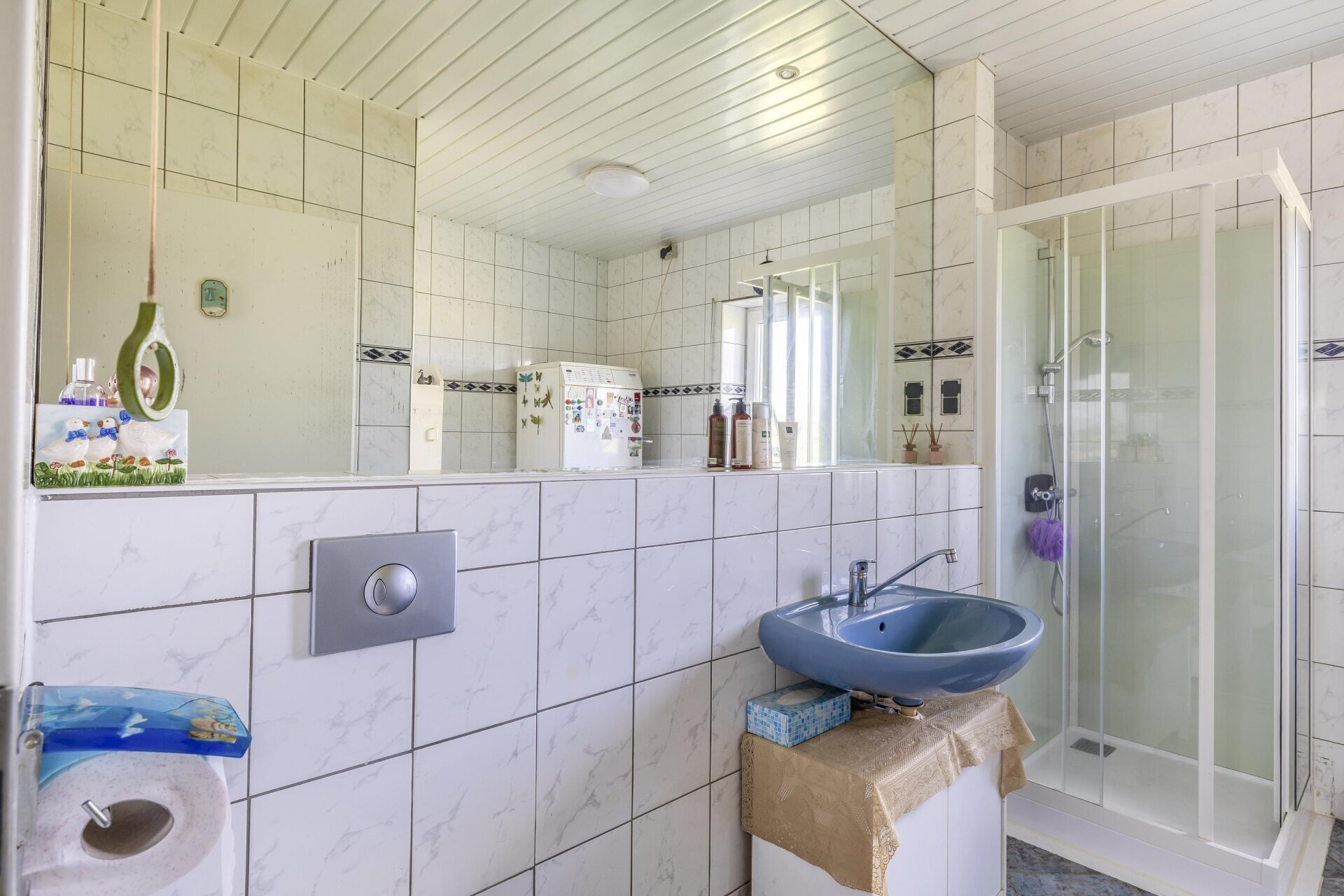Achterin de woning vind je op de begane grond een badkamer, voorzien van douche, wastafel en toilet, met daarnaast een separaat toilet in de garage. Dat maakt het huis ook geschikt voor wie graag gelijkvloers woont of mantelzorg overweegt.